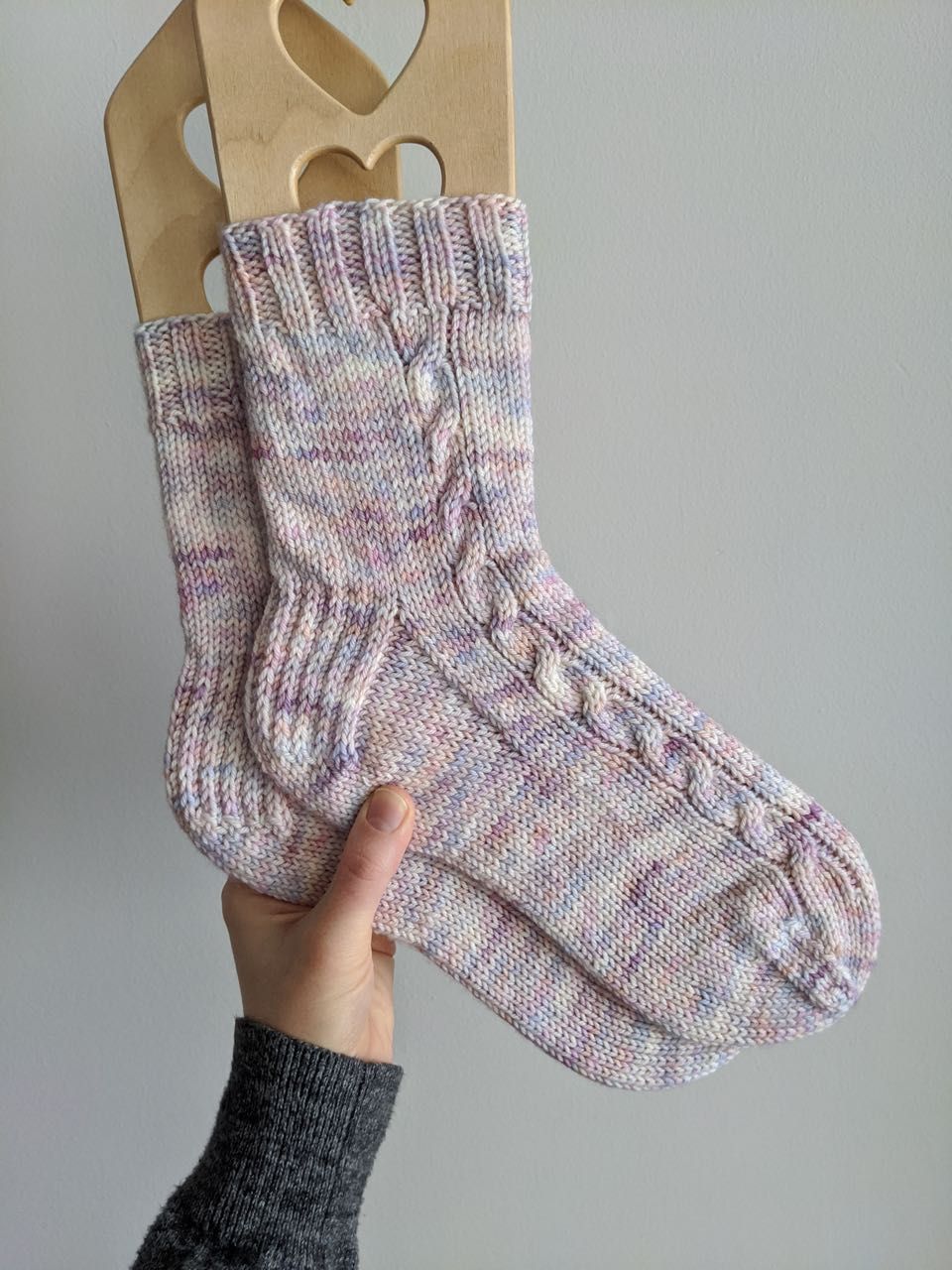 Cabled DK-weight socks for my Grandma Donna, knit out of the prettiest yarn, in the colorway Macaroon. I mashed up a few patterns to get my desired fit/gauge, and I'm so pleased with how they turned out.