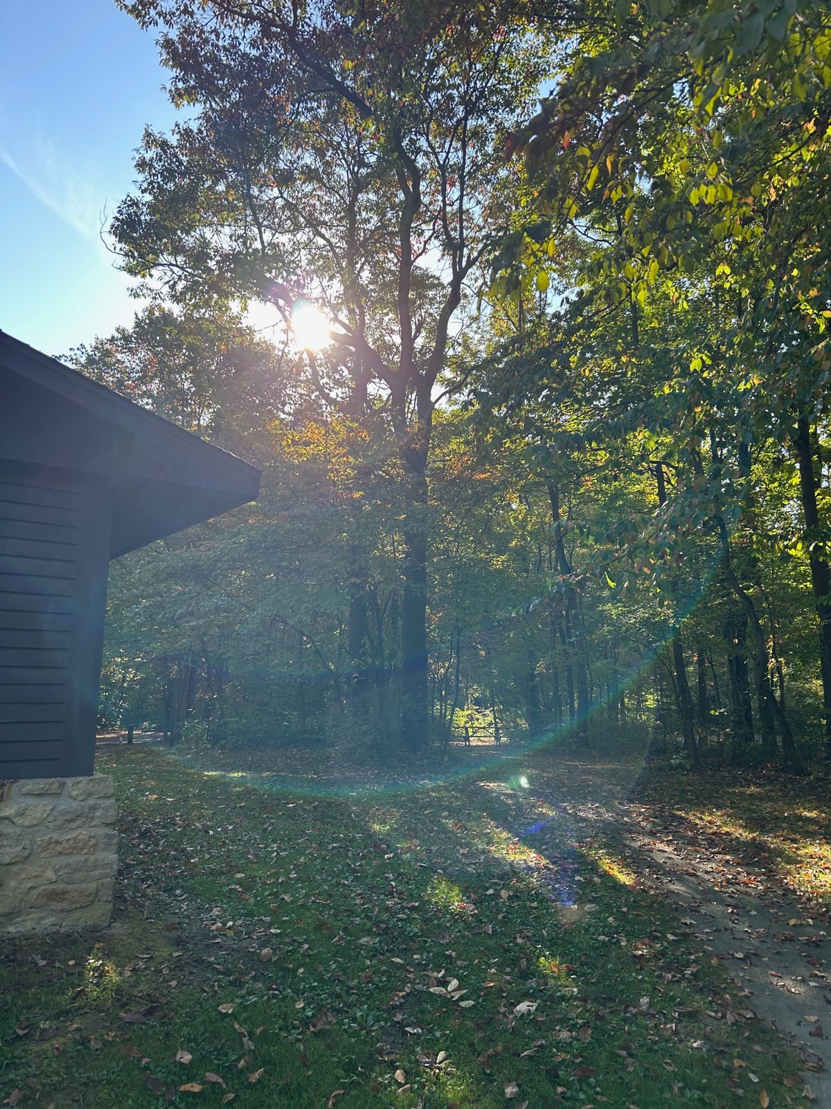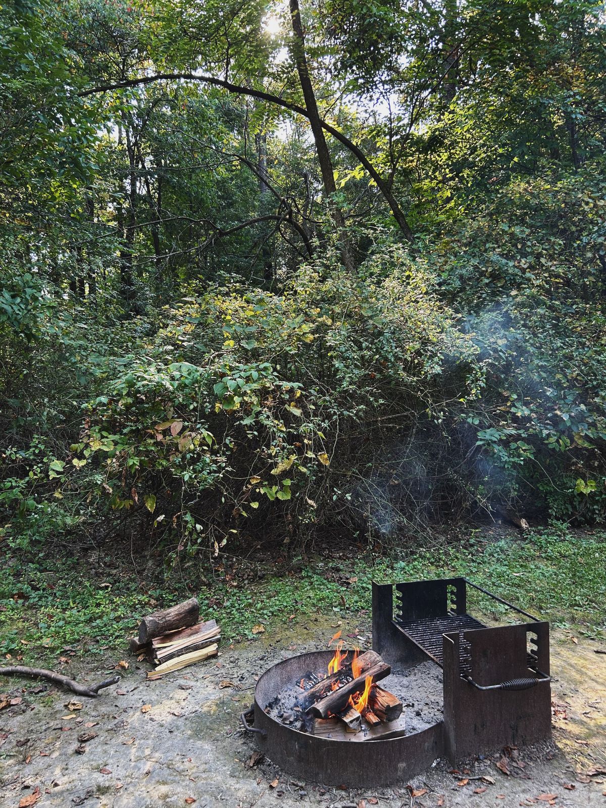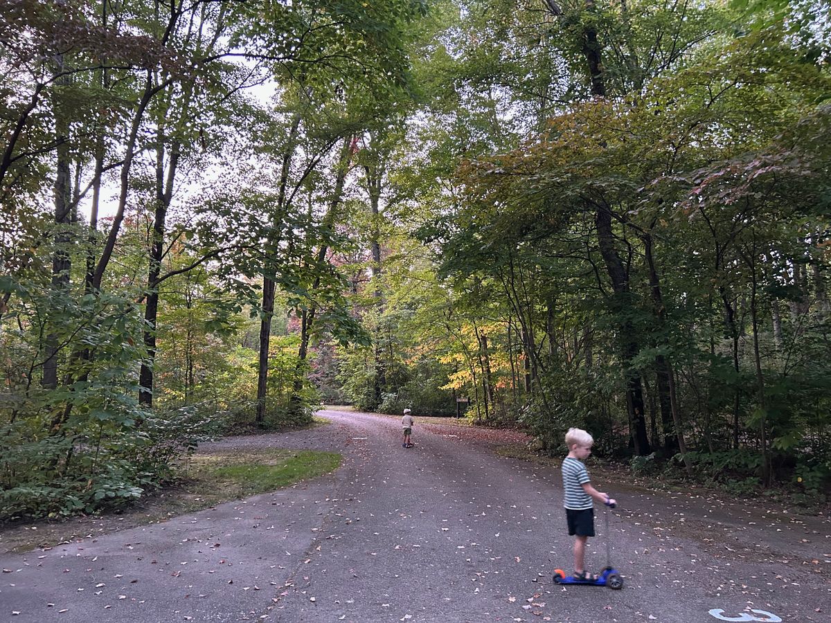 Once we got the campsite and tent set up, we explored the campground a bit. This campground had pretty nice (hot!) showers and the site we chose was a convenient distance to the bathroom, but not too close. The trees were showing just a hint of color, bits of red and gold sprinkled on the ground, like confetti.