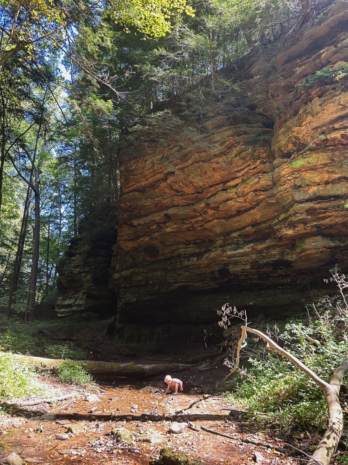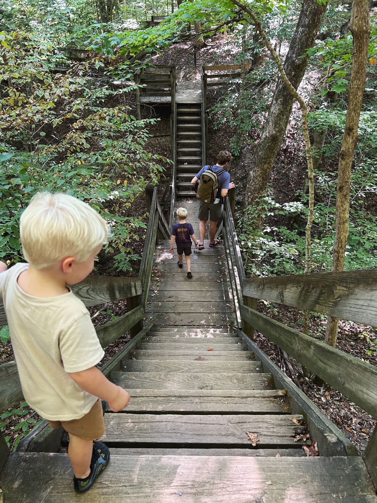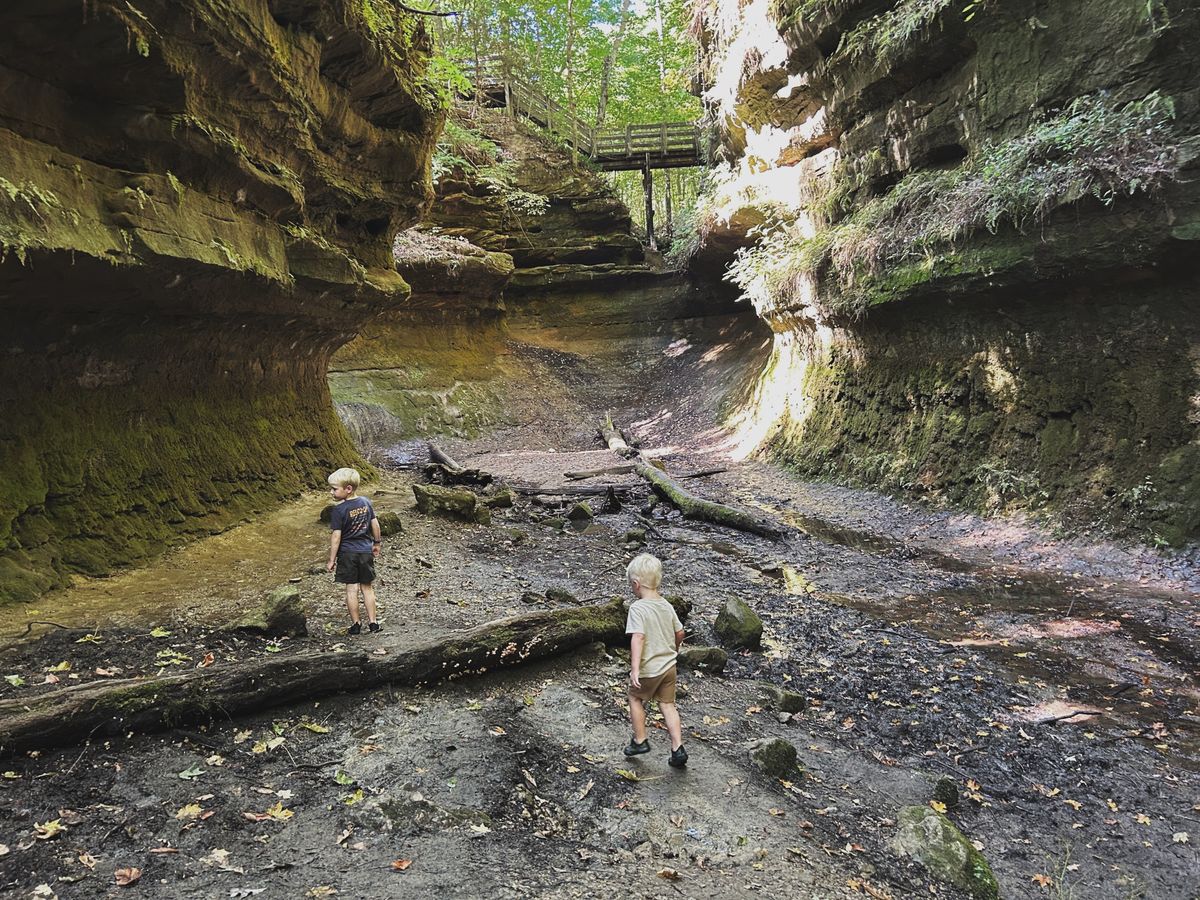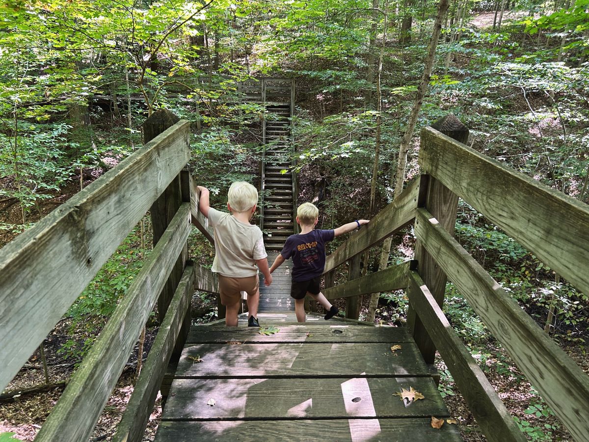 Thursday morning, after we cleaned up breakfast, we drove to another area of the park with several trailheads. With a baby and two smaller hikers, we opted for trails without ladders this year, although Shades does have some highly rated ravine trails that utilize ladders, similar to Turkey Run State Park. We chose trails 1 and 6, which provided us with many of the neat ravine trail experiences, lots of stairs, a waterfall, and some gravel path hiking, as well.