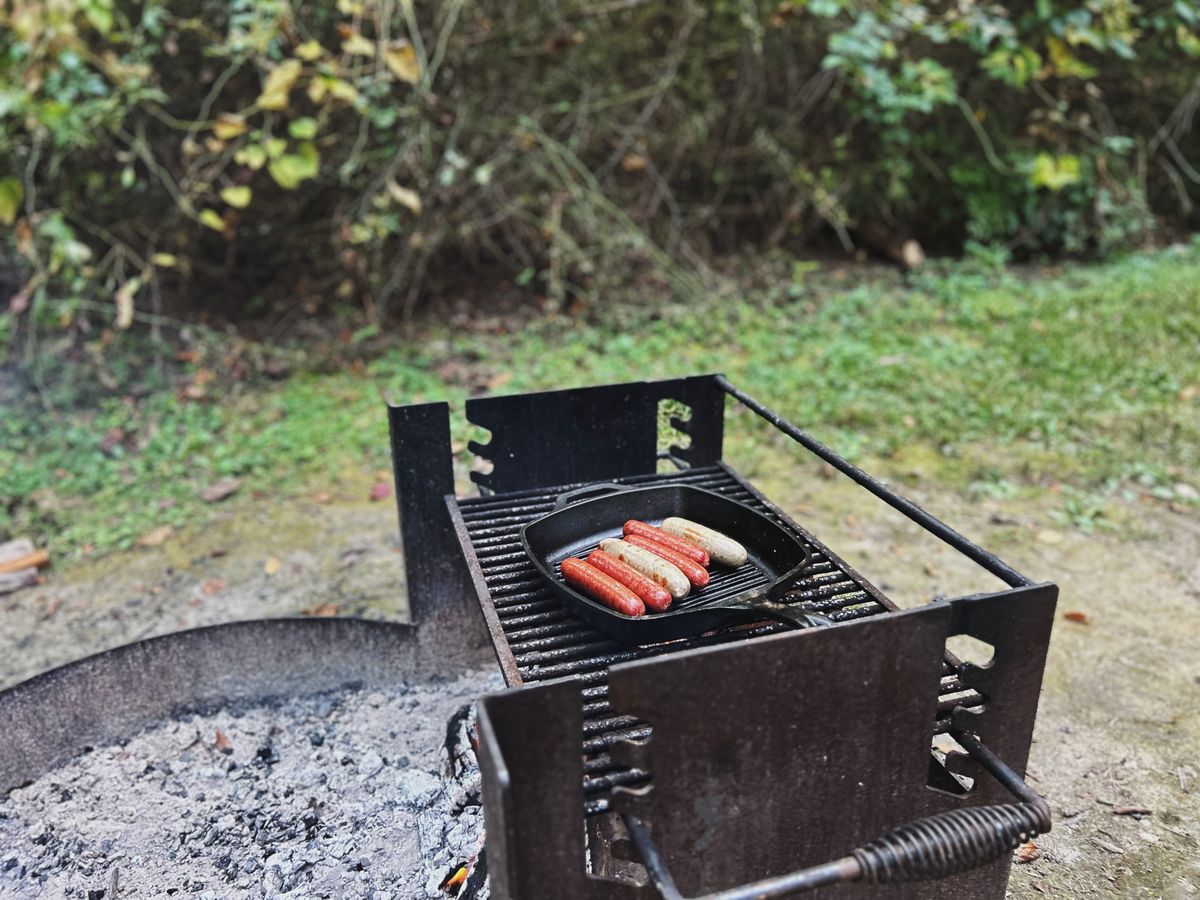 - hard-boiled eggs, paired with sausage made in a cast iron skillet on the camp stove, sourdough biscuits from home, sourdough zucchini bread, and fruit packed in the cooler