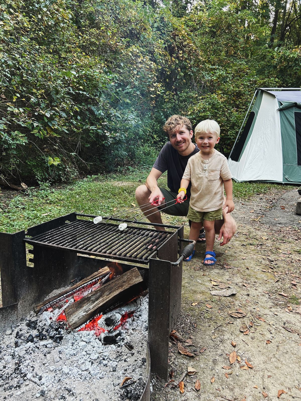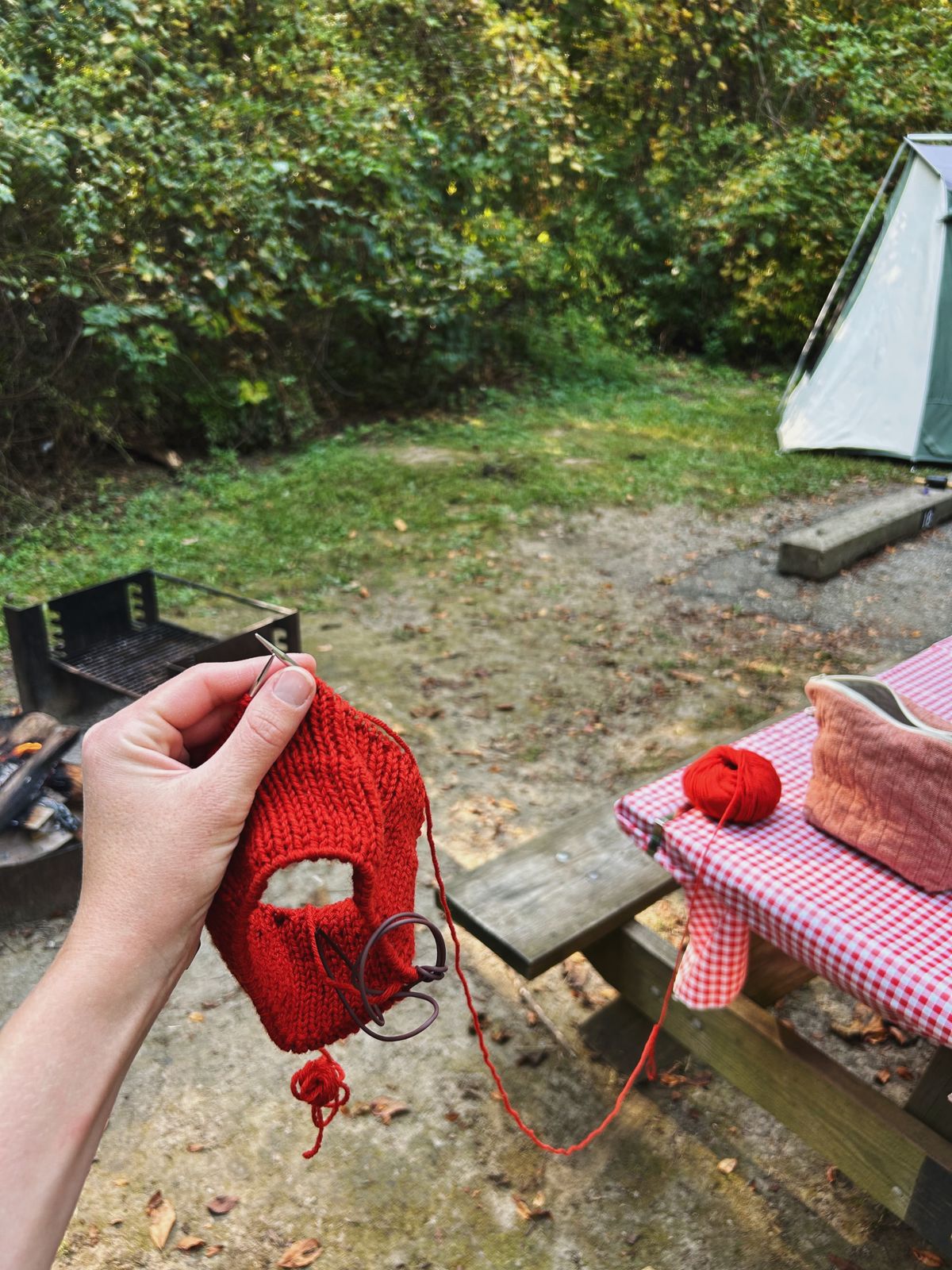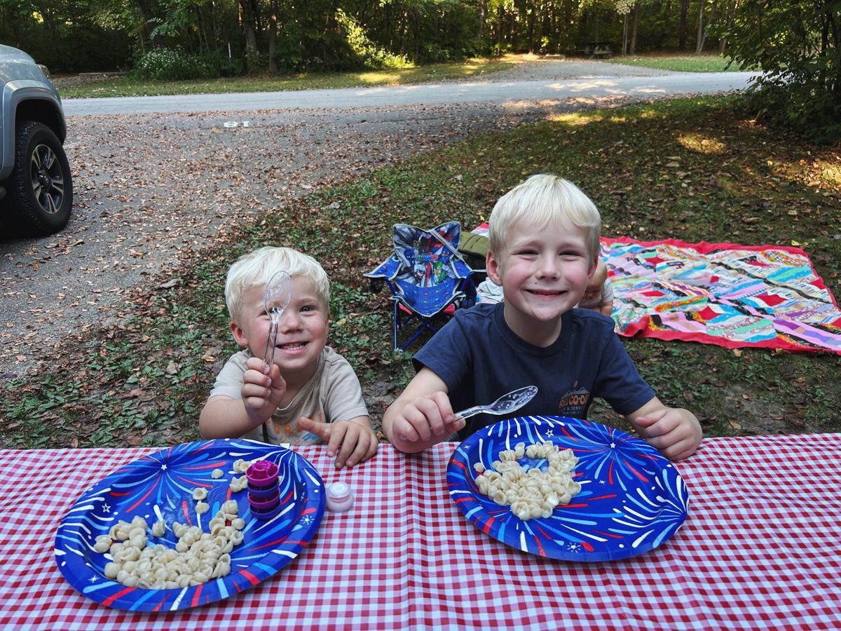 This year, we settled on a campsite at Shades State Park, a sort of quieter sister park to last year's pick, Turkey Run State Park. And in mid-September, mid-week, it was quiet. Of the 120ish or so campsites, fewer than 10 were booked. We arrived mid-afternoon on Wednesday and got to work setting up the campsite. The boys were immediately busy with exploring the campsite, helping Nicholas a bit, and riding their scooters. Arlo was happy to move around on a quilt, intensely motivated to get to the dead leaves on the surrounding grass. I knit on a Weekend Headband for Cooper in the happiest orange-red that he chose, and we moseyed about until it was time to make a fire for dinner.