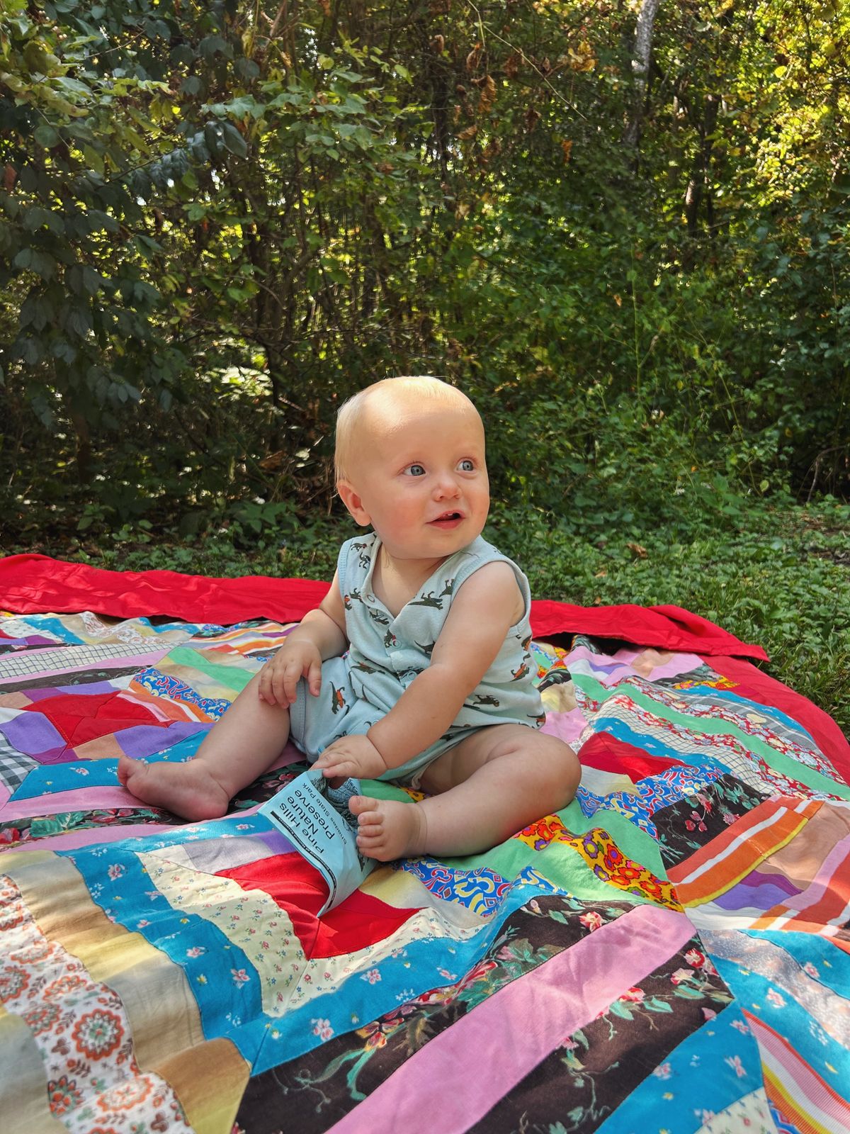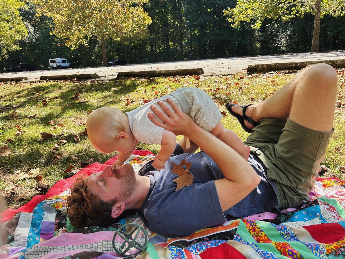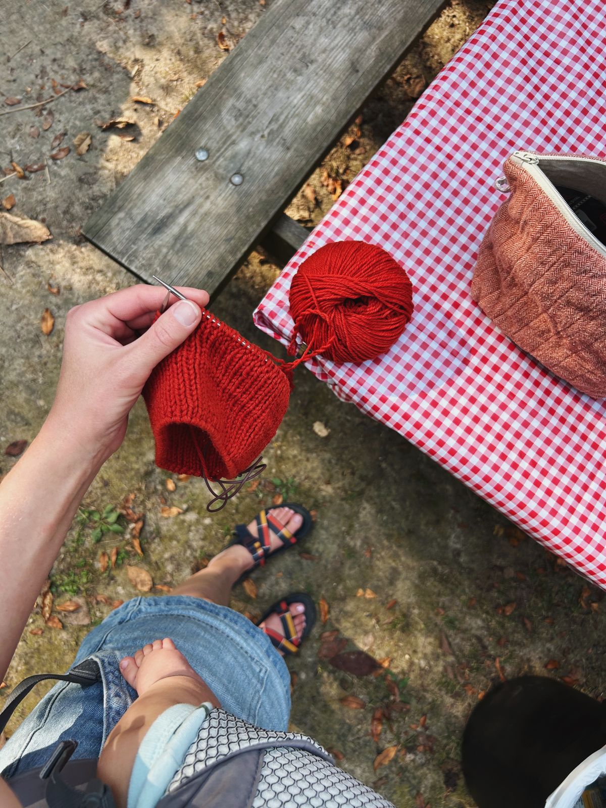 This year, we settled on a campsite at Shades State Park, a sort of quieter sister park to last year's pick, Turkey Run State Park. And in mid-September, mid-week, it was quiet. Of the 120ish or so campsites, fewer than 10 were booked. We arrived mid-afternoon on Wednesday and got to work setting up the campsite. The boys were immediately busy with exploring the campsite, helping Nicholas a bit, and riding their scooters. Arlo was happy to move around on a quilt, intensely motivated to get to the dead leaves on the surrounding grass. I knit on a Weekend Headband for Cooper in the happiest orange-red that he chose, and we moseyed about until it was time to make a fire for dinner.