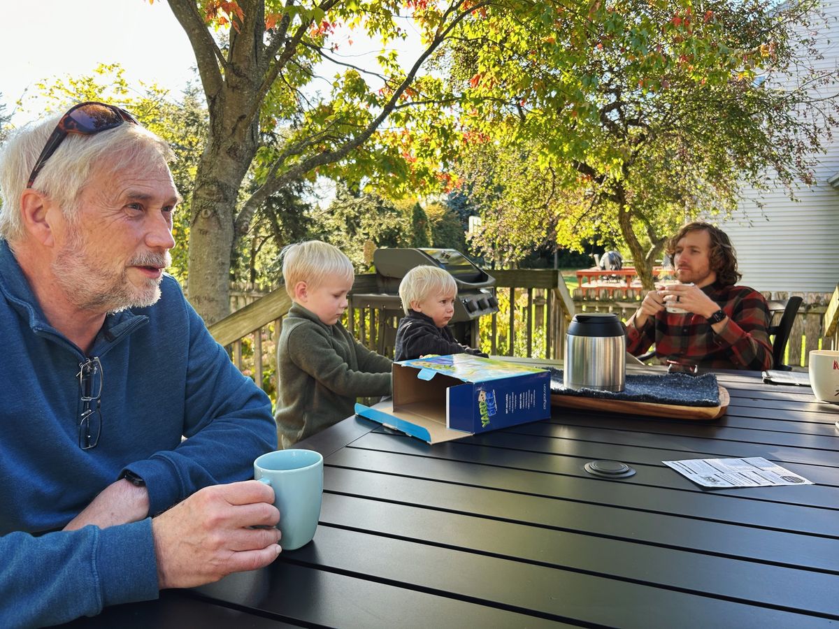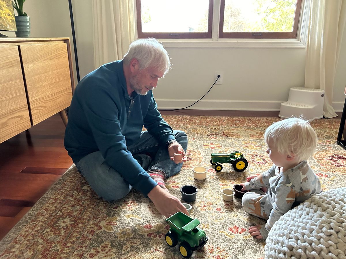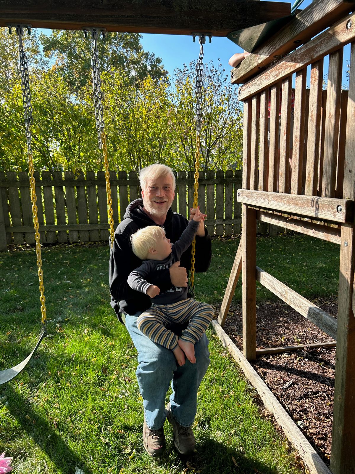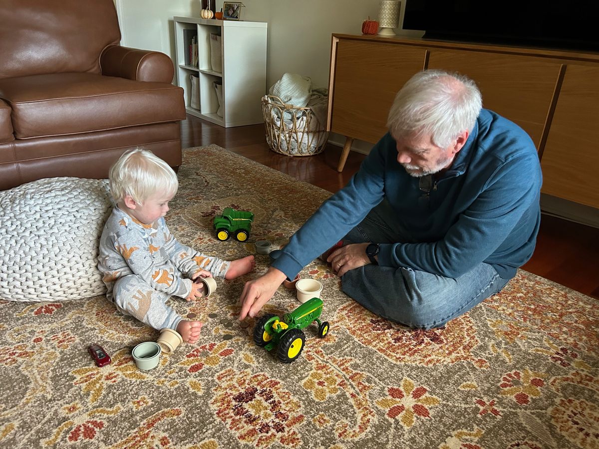 - Finn asked to sit on my dad's lap on the swing, and the two of them played trucks together.