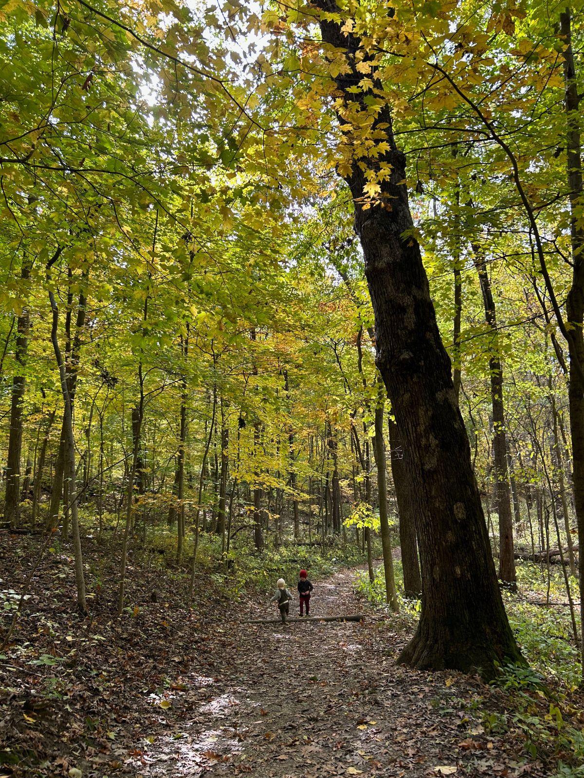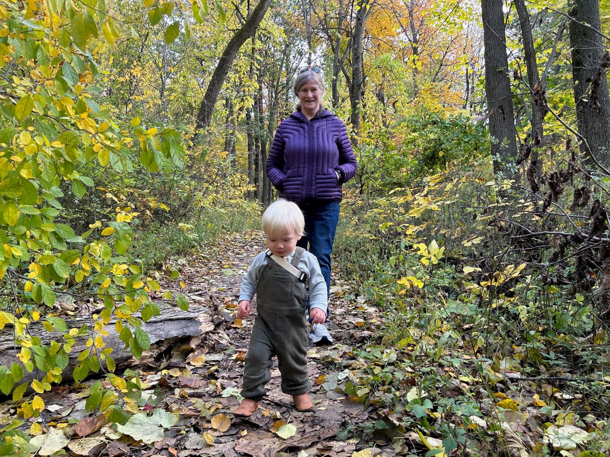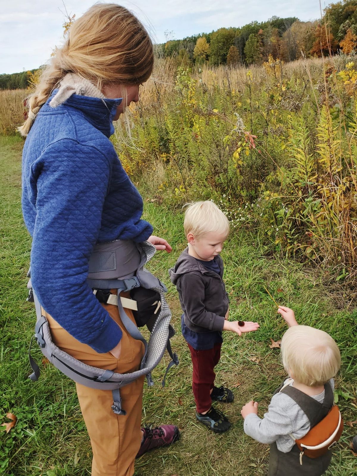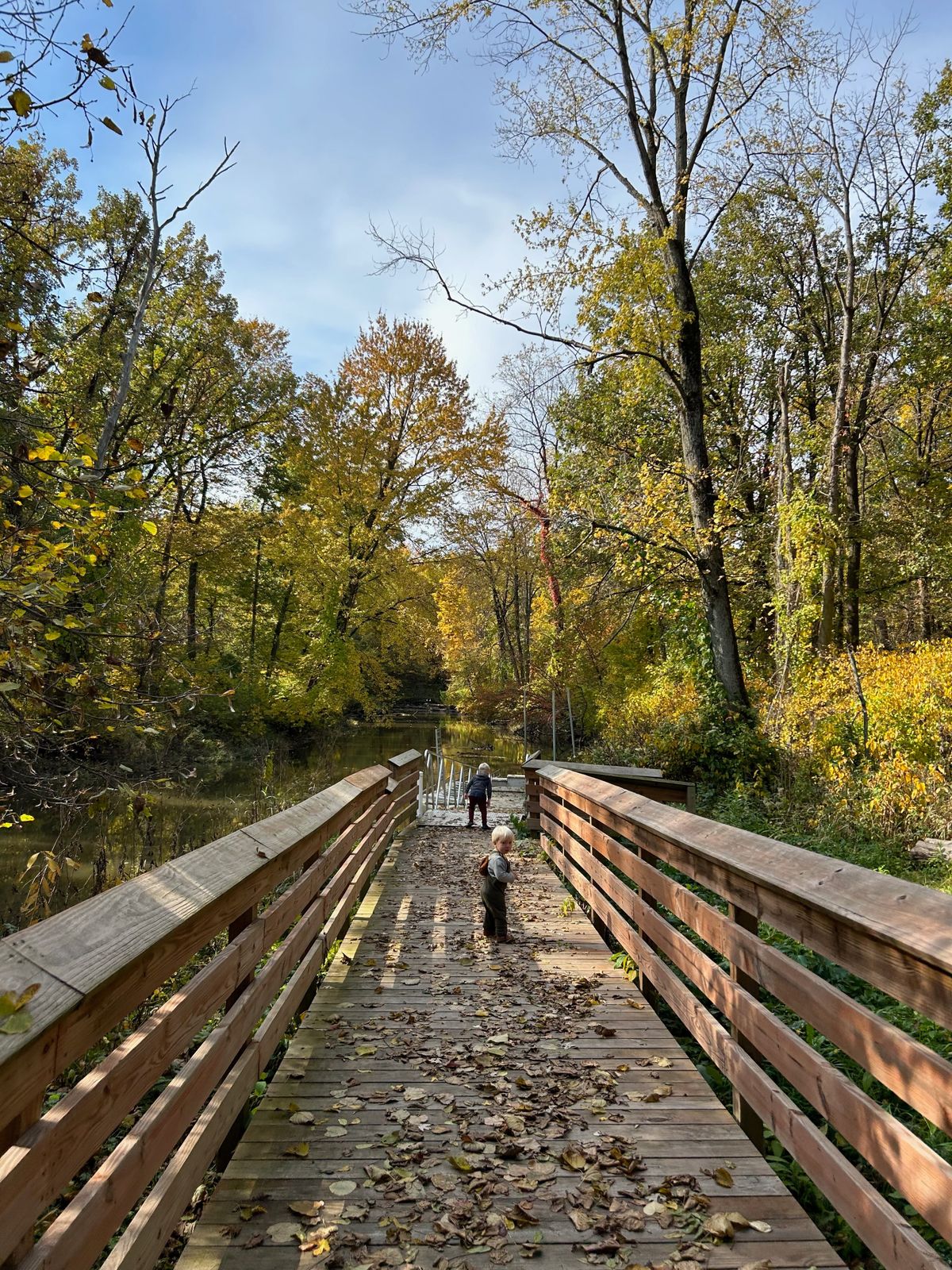 The route we took wound through prairie, into woods, and over bridges, and wove through forests of a deep gold. We hiked around a three mile loop (Cooper walked the entire way! Finn needed to be carried, but he walked around a mile of it). It was another beautiful day, blue skies just peeking out.