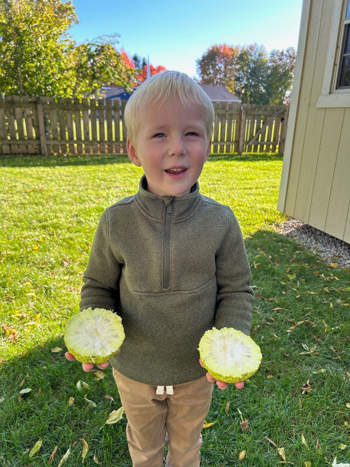 On Sunday, we went to church, and then headed home for some downtime, and books to be read with grandma, and legos to be played with. I opened up some birthday gifts from my family, along with some gifts for the boys. Lunch was leftovers, and then we all went on a walk around the neighborhood, choosing our route to pass the prettiest fall leaves. We found hedge apples on our walk, and at Cooper's insistence, we brought one home so we could cut it open and see what was inside. It was a beautiful fall day with warmth from the sunshine and a slight breeze, warm enough to be very comfortable. Back at home, we had coffee out on the deck, and of course we cut open the hedge apple to investigate. (I hadn't heard of them before, but apparently they aren't edible, but are sometimes used in seasonal decor).
