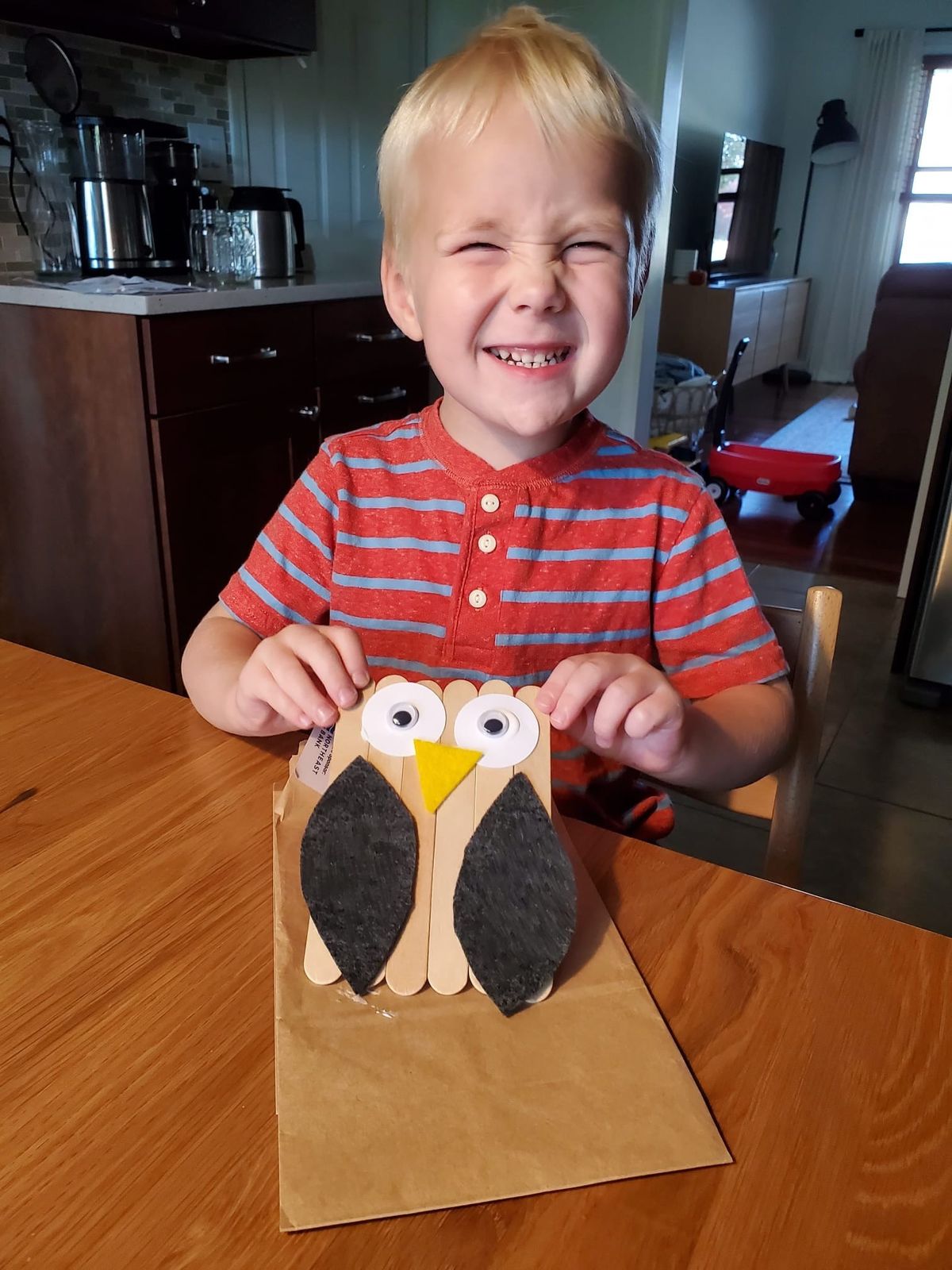 - My mom brought a craft for Cooper to do– a little owl made out of popsicle sticks and googly eyes and felt. So cute! Cooper loved it.