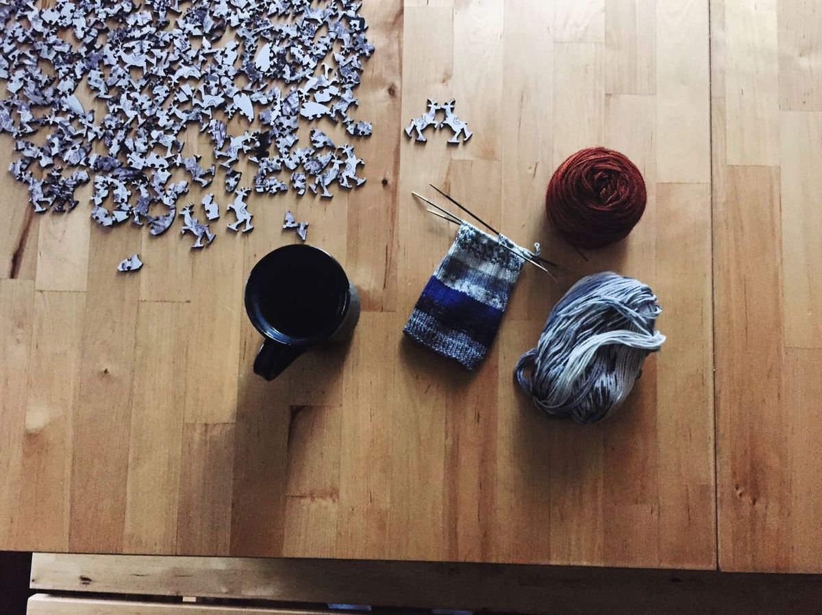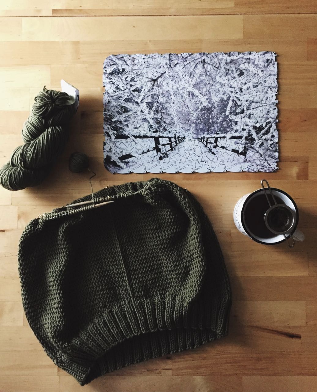 And yesterday, we spent an entire day together. With our morning coffee, we started piecing together an "extra difficult" wooden puzzle with reindeer pieces. We had smoothies for lunch, and I talked to my brother on the phone for over an hour, while Nicholas played games with some friends. In the afternoon, we went to his barbershop for his haircut (& some knitting time for me). And then we went to The Backspace, to order our "usual" and to sit at the bar, close to the the brick oven fire where they cook the pizza. It was like sitting near a fireplace on a chilly night, and you can watch the staff prepare your food, which is our favorite. We ordered the exact same meal we always do, plus an americano to share. We were home by 7pm and watched The Office together and cozied up under the quilt we reach for about 50 times a day this time of year.
