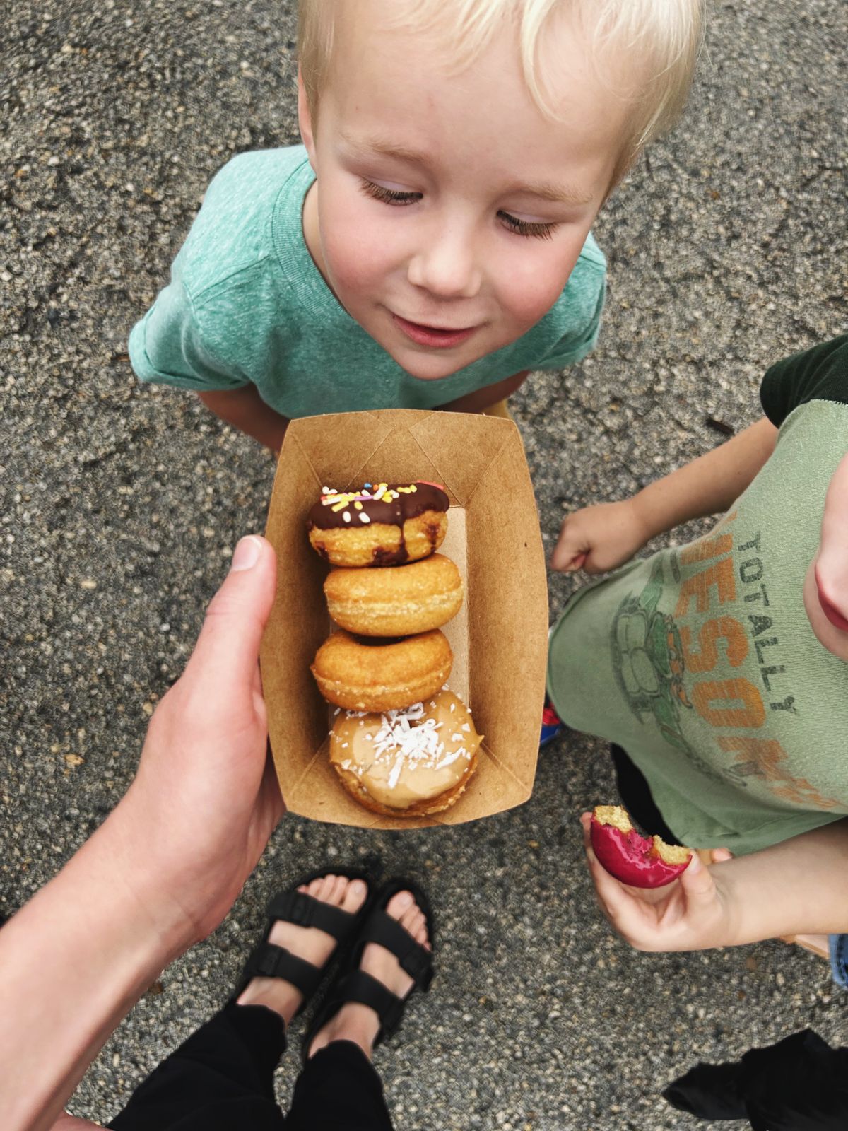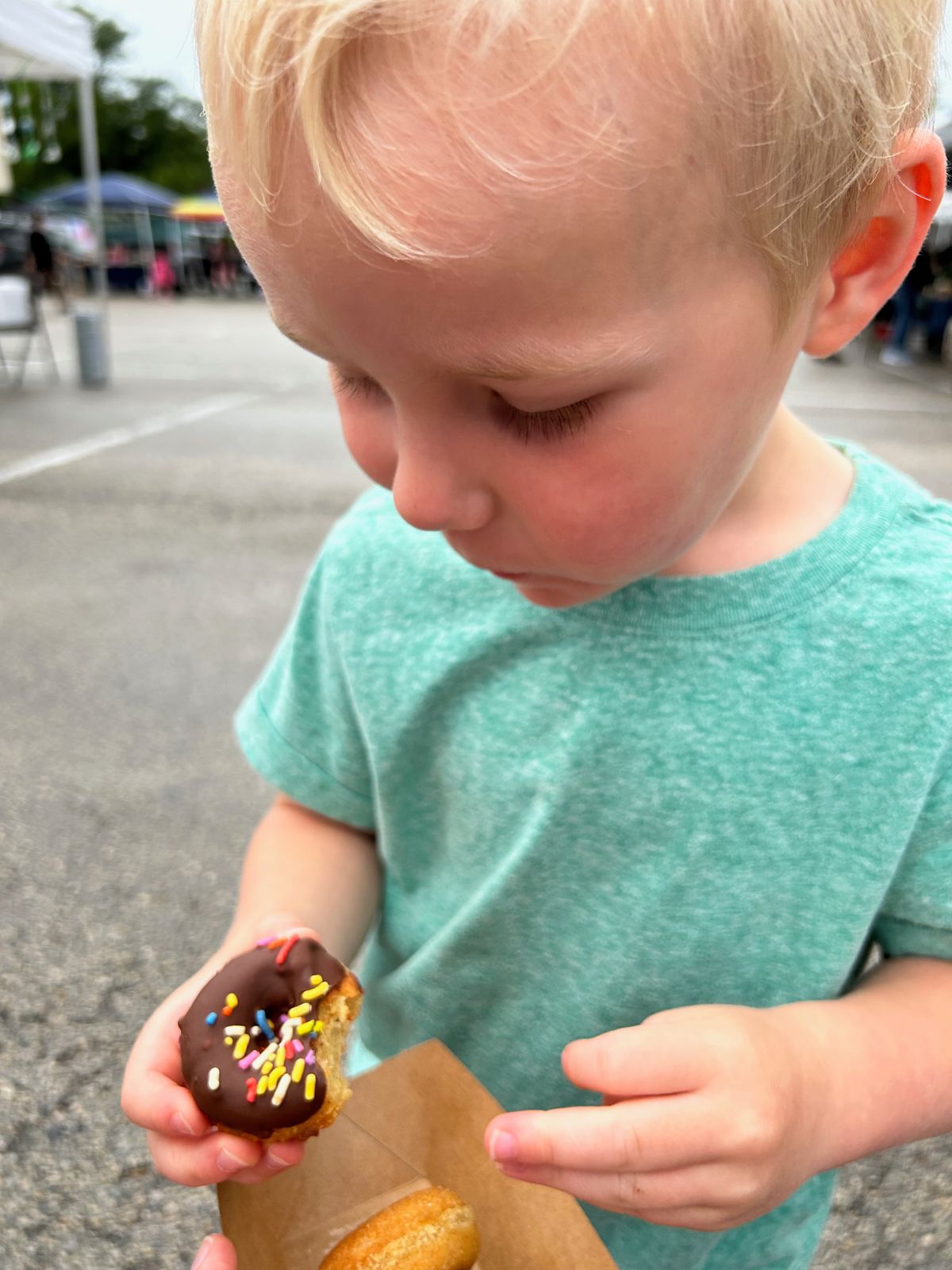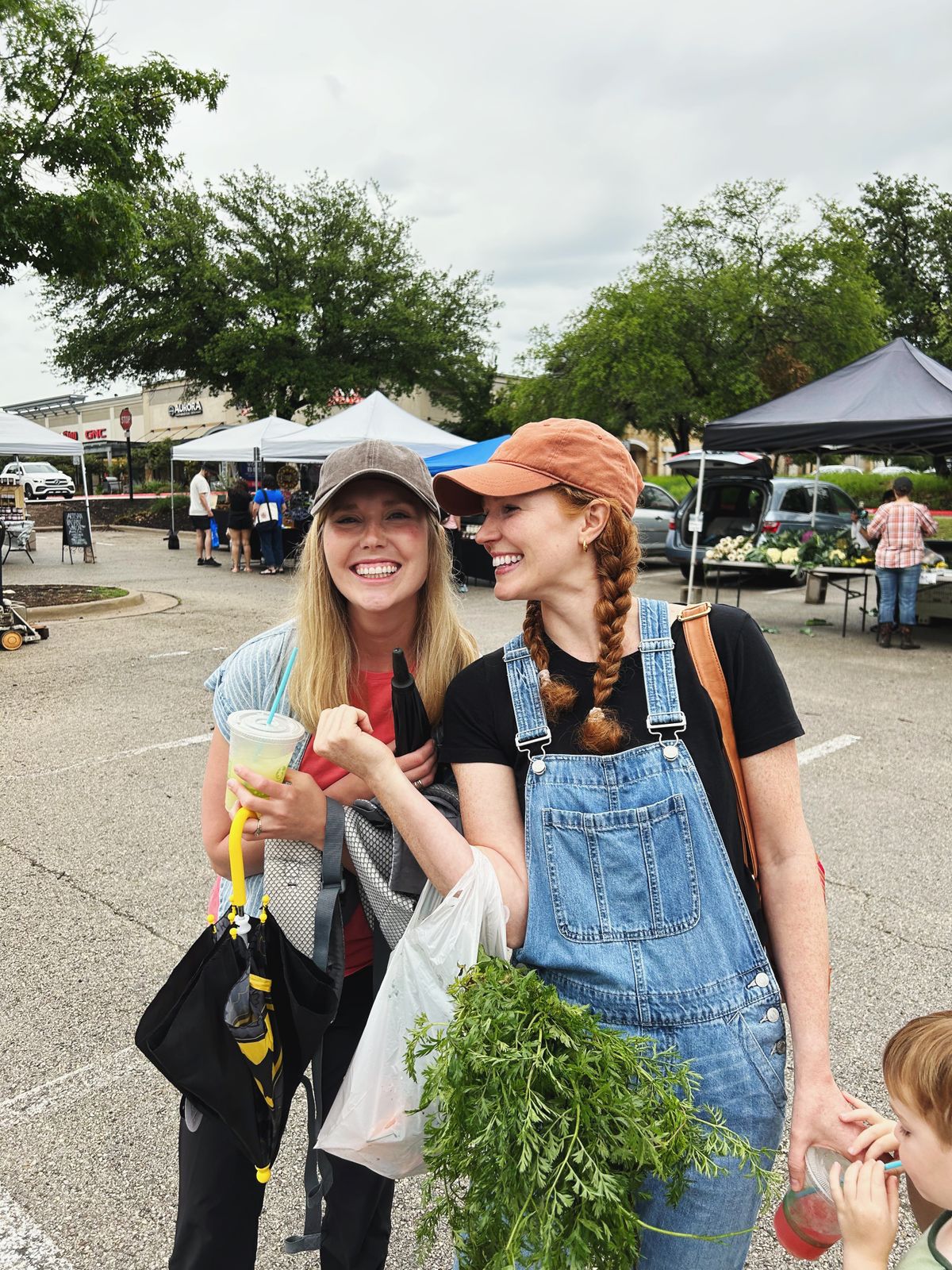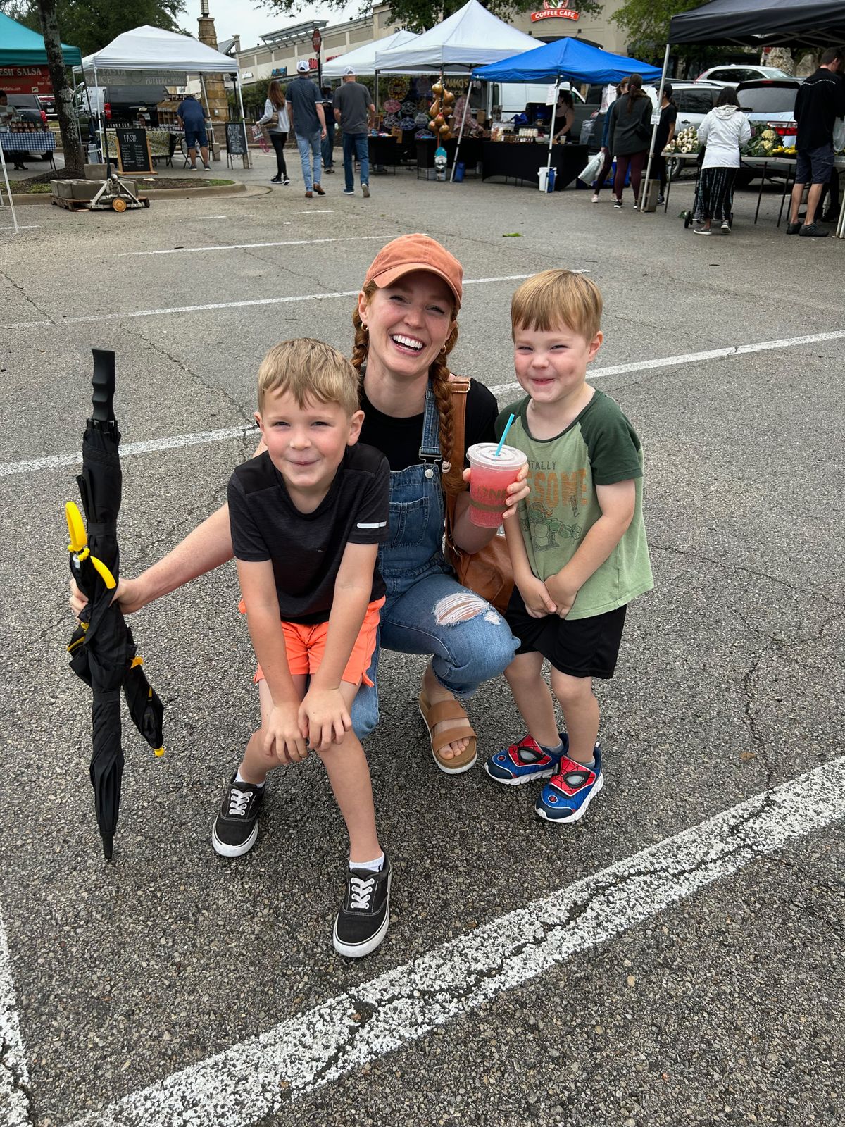 On Saturday, right after breakfast, we went with Jessica and her boys to their local farmer's market. We got gluten- and dairy-free mini donuts for the little boys (I had a coffee flavored one too) along with a fizzy ginger drink. Jessica got some produce that she used later that evening in our dinner, and we juggled food and snacks and umbrellas and little boys as we walked around.