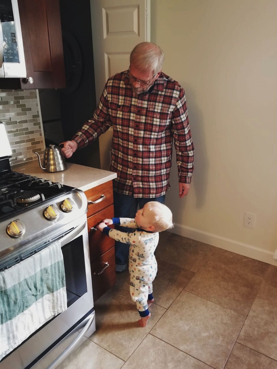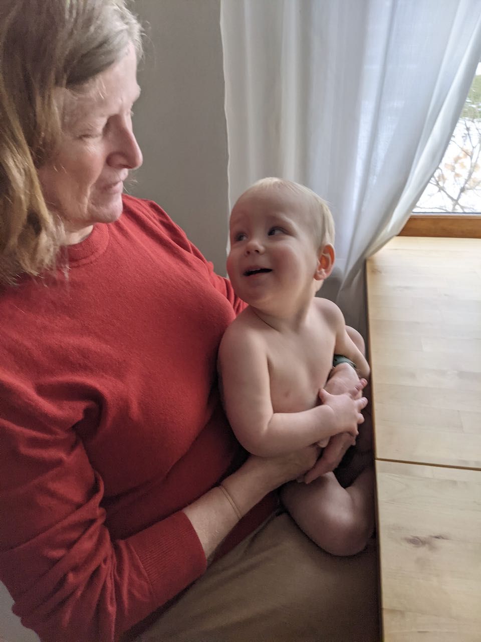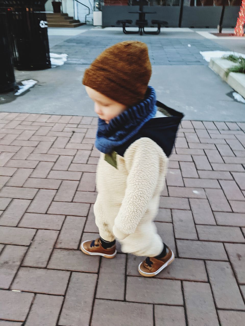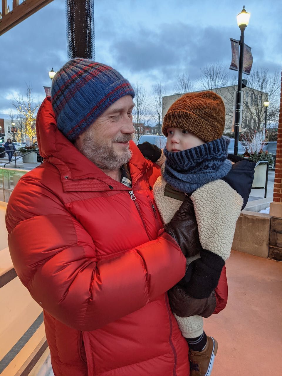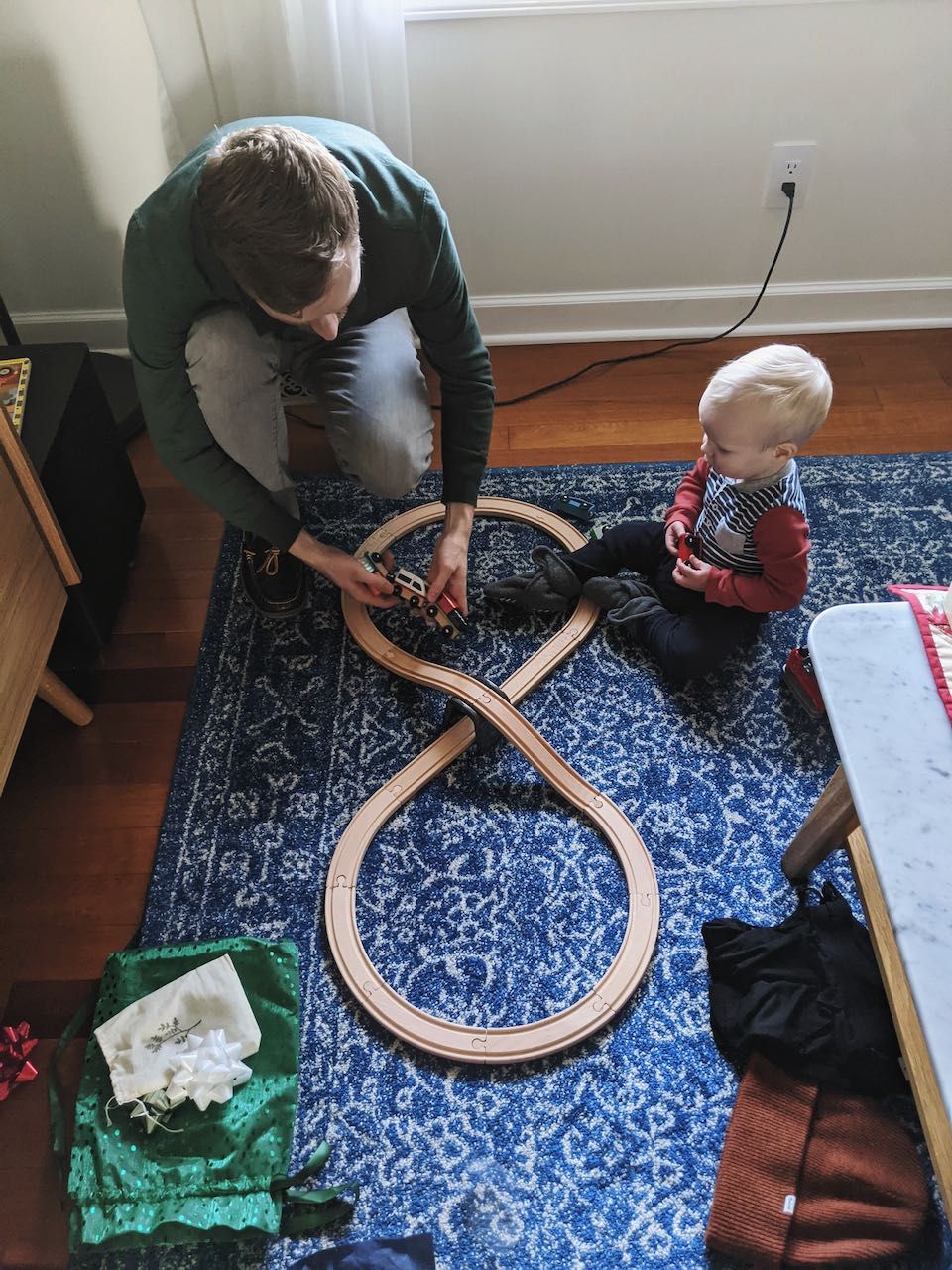 And then, a week or so into January, my parents, brother, and Grandma Donna came to visit and see our new home for the first time and to celebrate a belated Christmas together in person. We exchanged gifts. We played rummy and watched some Talasbaun together. My dad and I made chocolate covered pecans and walnuts. We played in the backyard with Cooper and visited the park down the street and Cooper went down the slide over and over, wanting my parents and my brother to catch him and "reset" him to go again. My mom read books to Cooper. I chatted with my mom and Grandma about motherhood and quilting and knitting. We visited the lights and the tree still up in Central Park and watched people ice skate (Coop's favorite thing to watch). And we snacked on cranberry oatmeal squares and drank quite a bit of coffee. It was so nice to give family hugs in person, and so special to see Cooper grab my dad's hand walking home from the park, or to see them play with the wooden train set together. To see my mom chase him around. Lots of little moments and blurry photos treasured up in my heart, from both Christmases.