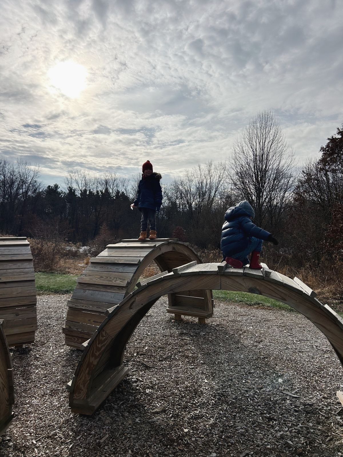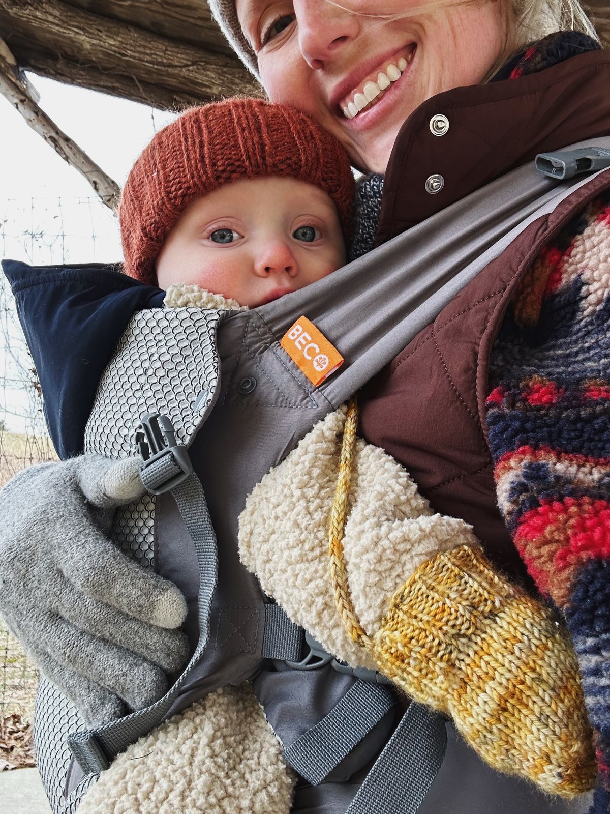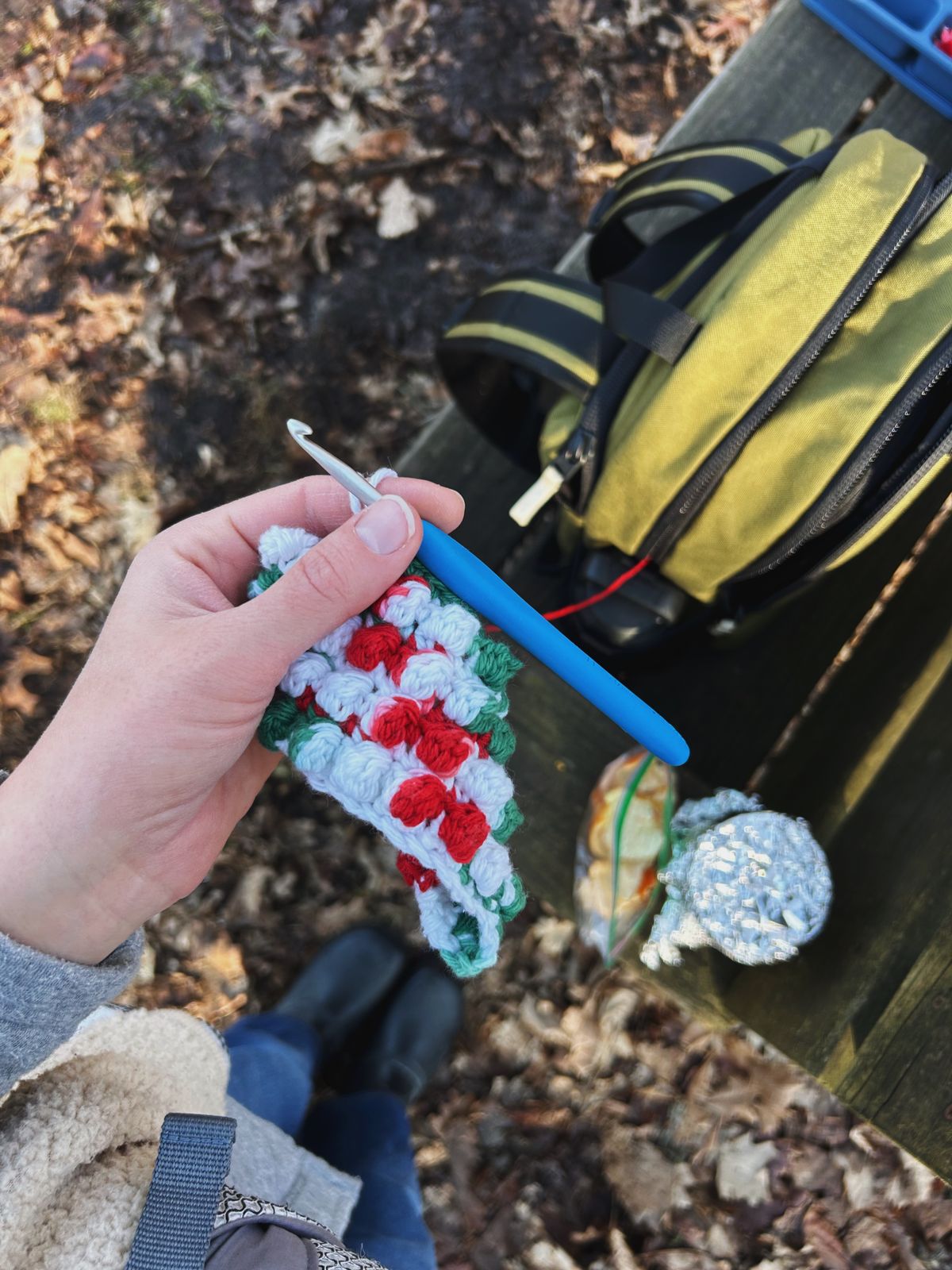The following day, a day that Nicholas had off work, we packed picnic lunches again. But the weather was markedly different – much warmer, little wind, and sunshine! With a backpack filled with lunches, we hiked to one of our favorite big trees to eat lunch and climb. The boys had snacky lunches and Nicholas and I had thermoses of risotto, plus some clementines. I wore Arlo and worked on a little Christmasy crochet (the gift for Katelyn that I mentioned in the post about our Christmas 2025, Part 1). It was one of my favorite recent family outings. Fresh air, sunshine, moving our bodies, and quality time with all my boys.
