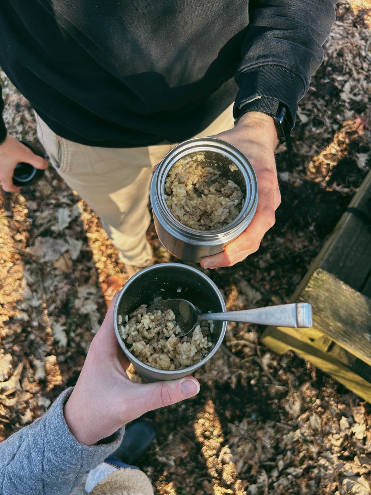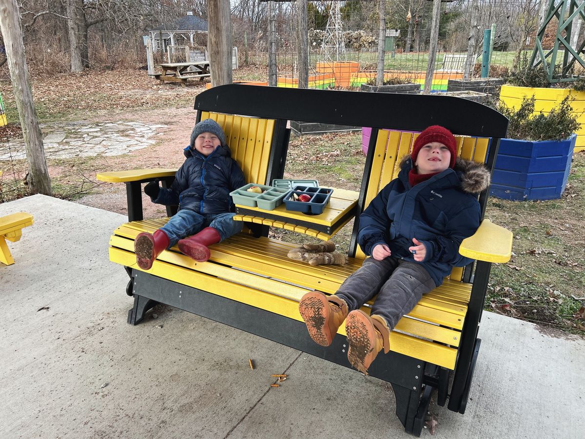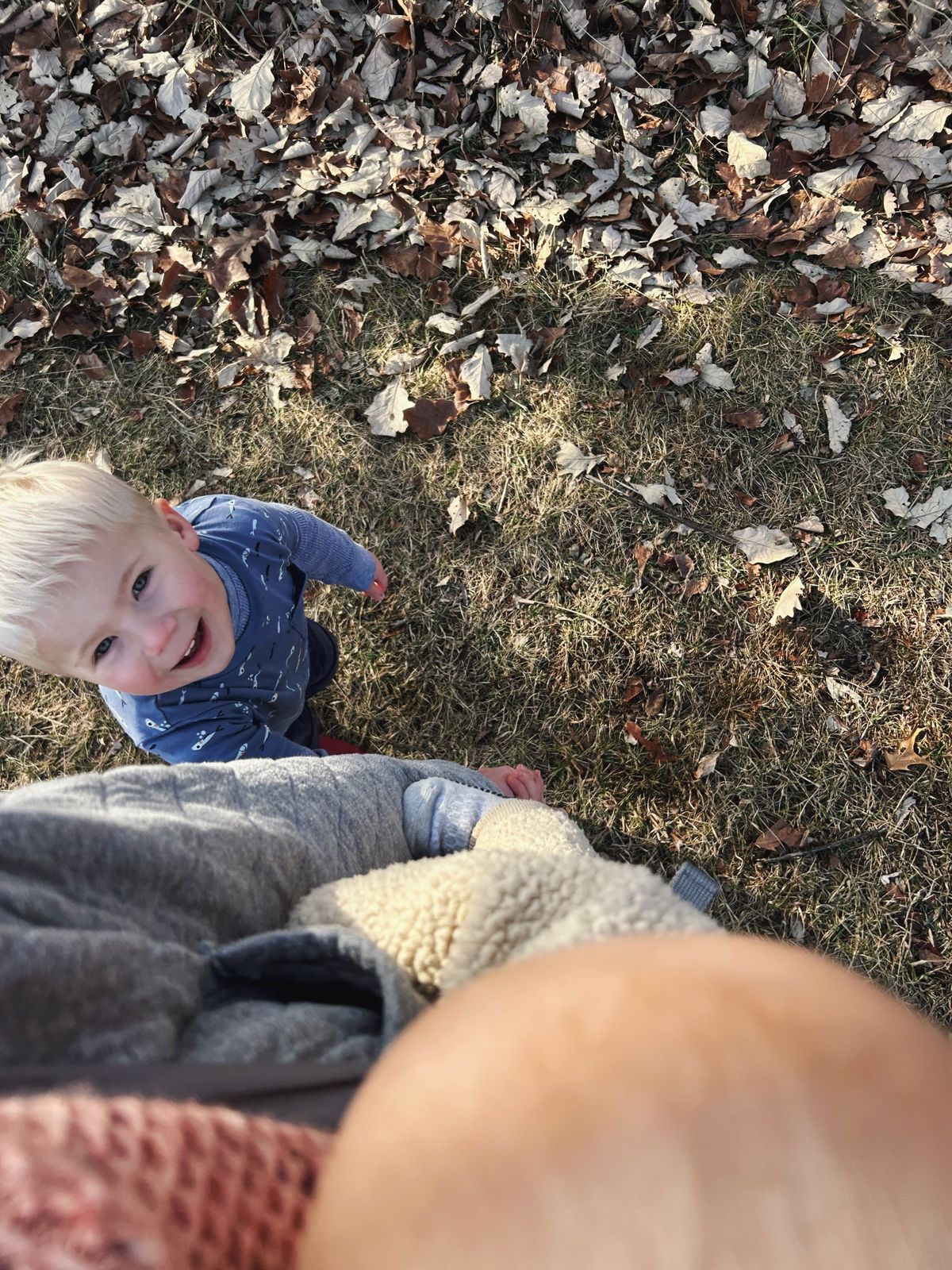 The following day, a day that Nicholas had off work, we packed picnic lunches again. But the weather was markedly different – much warmer, little wind, and sunshine! With a backpack filled with lunches, we hiked to one of our favorite big trees to eat lunch and climb. The boys had snacky lunches and Nicholas and I had thermoses of risotto, plus some clementines. I wore Arlo and worked on a little Christmasy crochet (the gift for Katelyn that I mentioned in the post about our Christmas 2025, Part 1). It was one of my favorite recent family outings. Fresh air, sunshine, moving our bodies, and quality time with all my boys.
