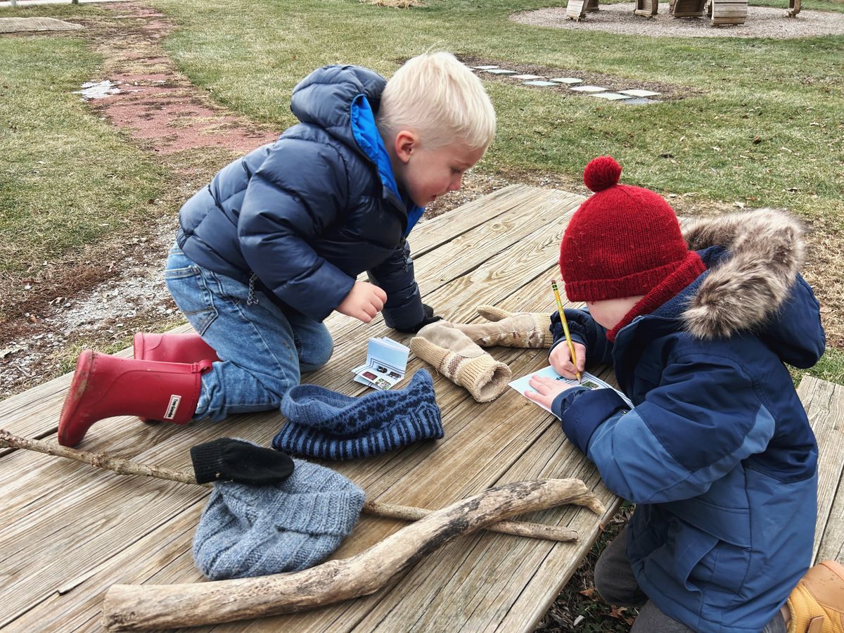 The first one, I took the boys myself, and despite a temp in the forties, the windchill put the "feels like" temperature in the twenties. The boys shivered their way through their picnic lunches and I was tempted to pack up and head home. But then, we came across the winter scavenger hunt and hiking enthusiasm was renewed. We spent nearly three hours tromping around, when all was said and done, and then spent a very cozy afternoon warming up at home.