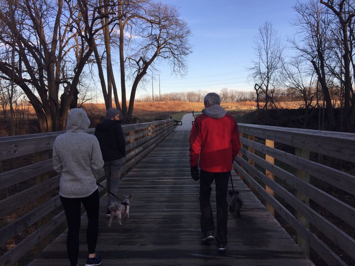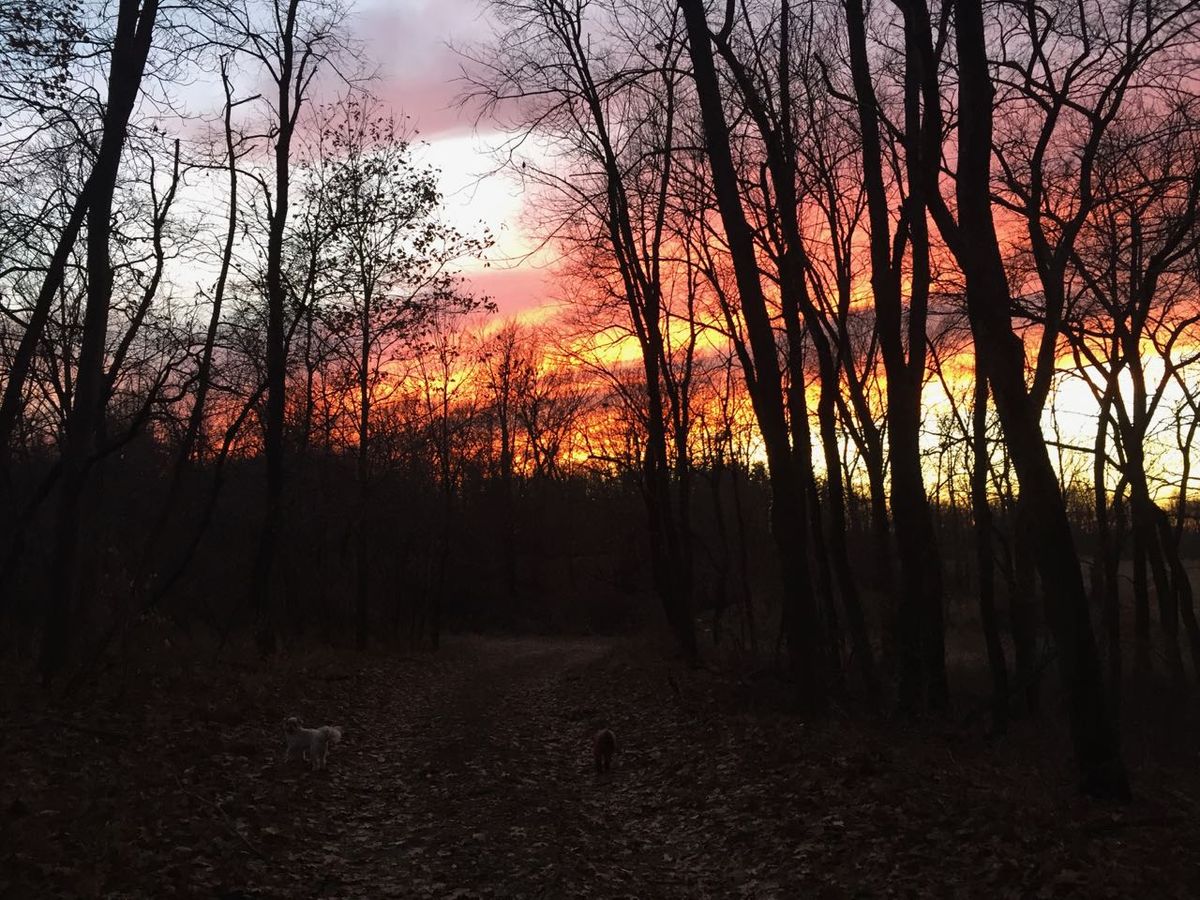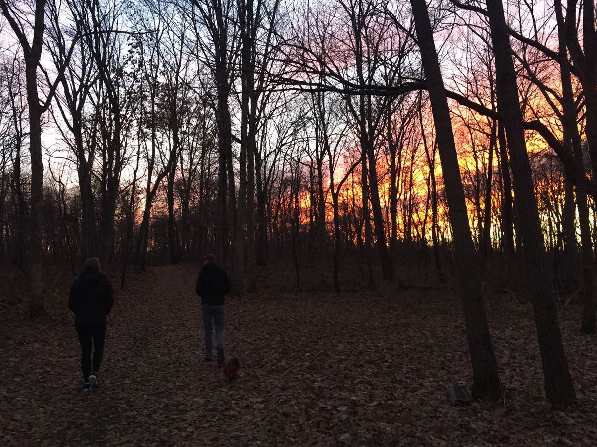 Sunday morning, it was so foggy and frosty and beautiful. We went to the 8:15 service at church, and then we went out for brunch before heading home for naps (some of us) and the Bears' game (others of us). We took the dogs on a walk on a new-to-us trail during the golden hour. It 's a beautiful trail and so pretty, but I should have dressed warmer! That evening, we finished our round of Phase 10 and went to bed early, which also felt like a treat.