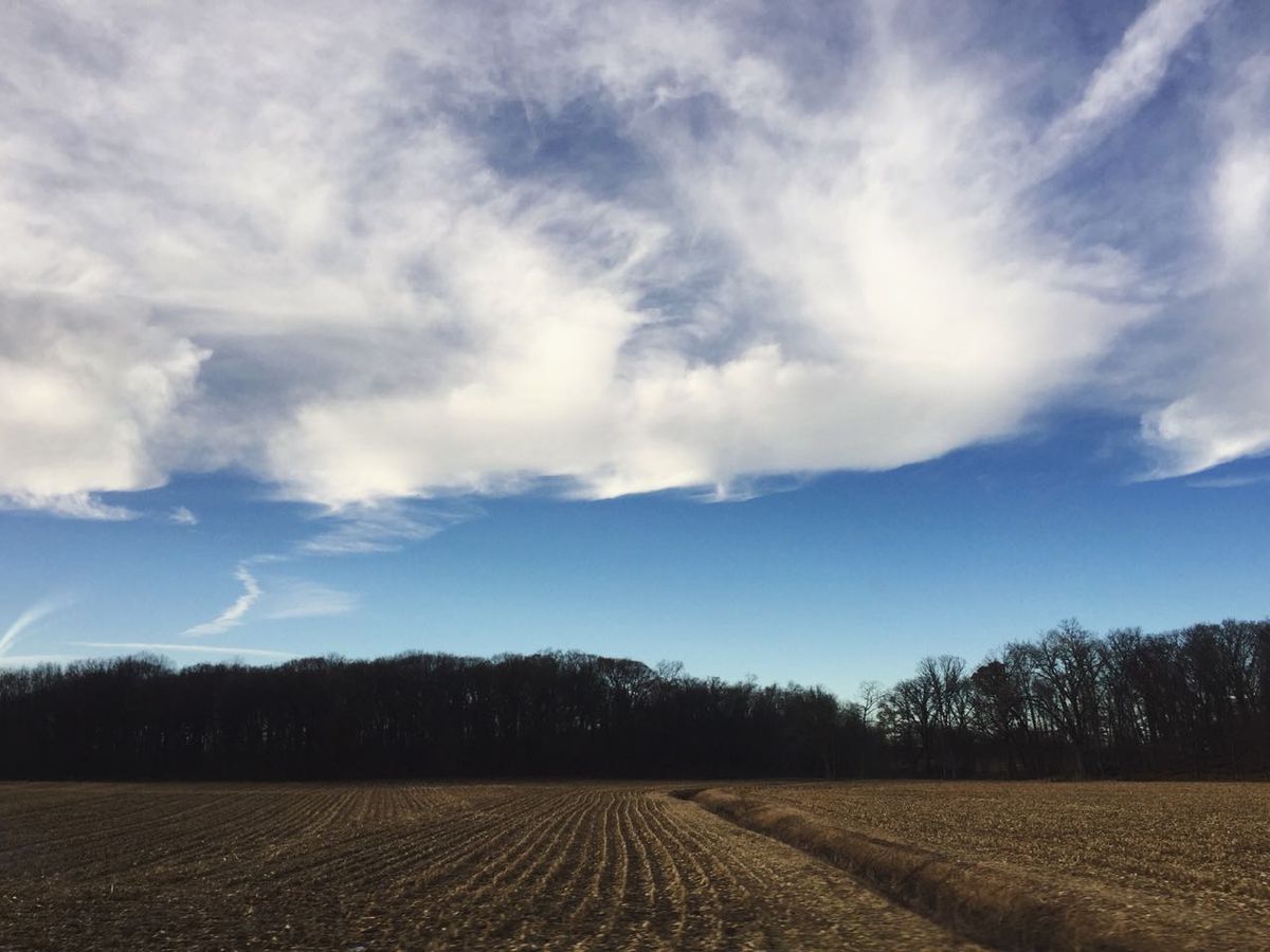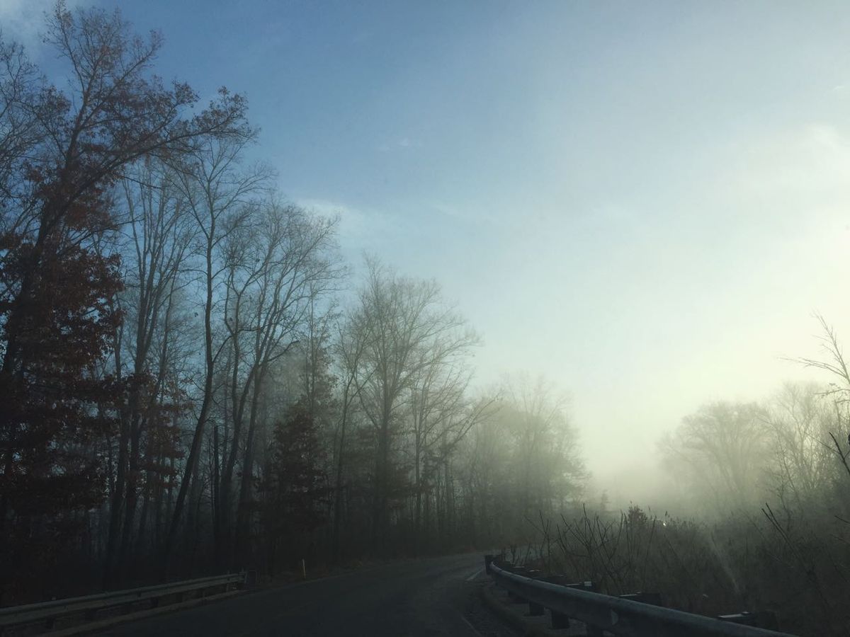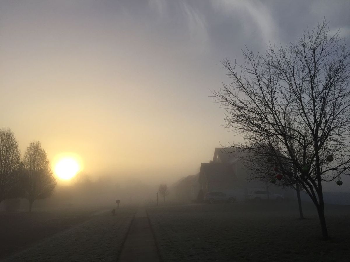 Sunday morning, it was so foggy and frosty and beautiful. We went to the 8:15 service at church, and then we went out for brunch before heading home for naps (some of us) and the Bears' game (others of us). We took the dogs on a walk on a new-to-us trail during the golden hour. It 's a beautiful trail and so pretty, but I should have dressed warmer! That evening, we finished our round of Phase 10 and went to bed early, which also felt like a treat.