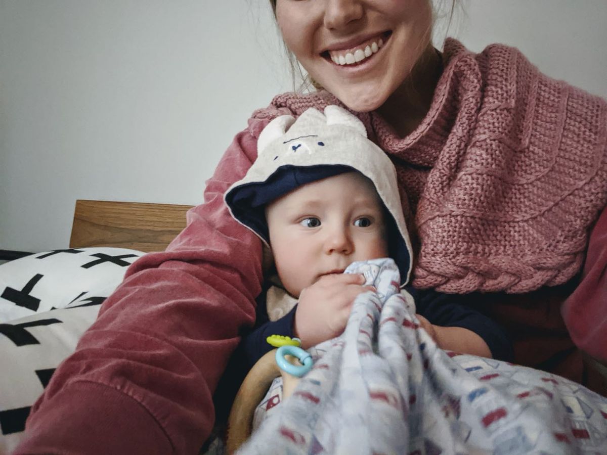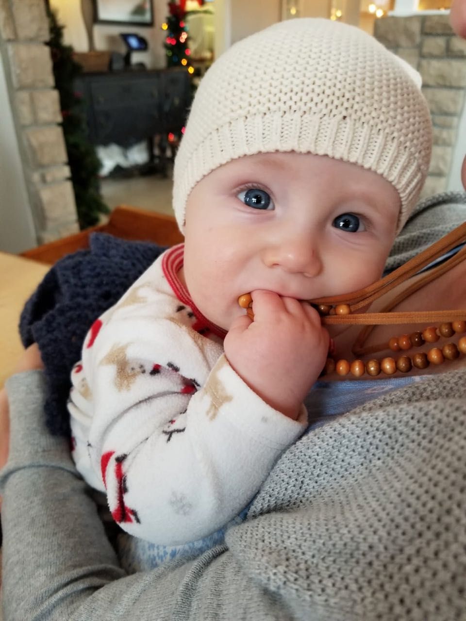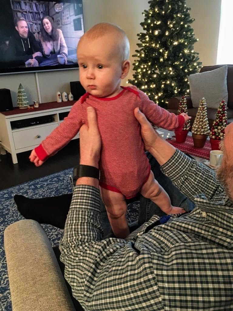 Between Cooper's naps, we drank coffee, exchanged Christmas gifts, and had French toast and sausages for lunch. Cooper received so many thoughtful things, including the Jesus Storybook Bible, an adorable puppet, a bell toy I had as a child, and a few more beautiful books. He loved the tissue paper, wrapping paper, and gift bags, of course, crinkling them and tasting them. ;) He didn't nap as much as usual on Saturday, so it was more difficult to catch his smiles in photos, but we saw a few!