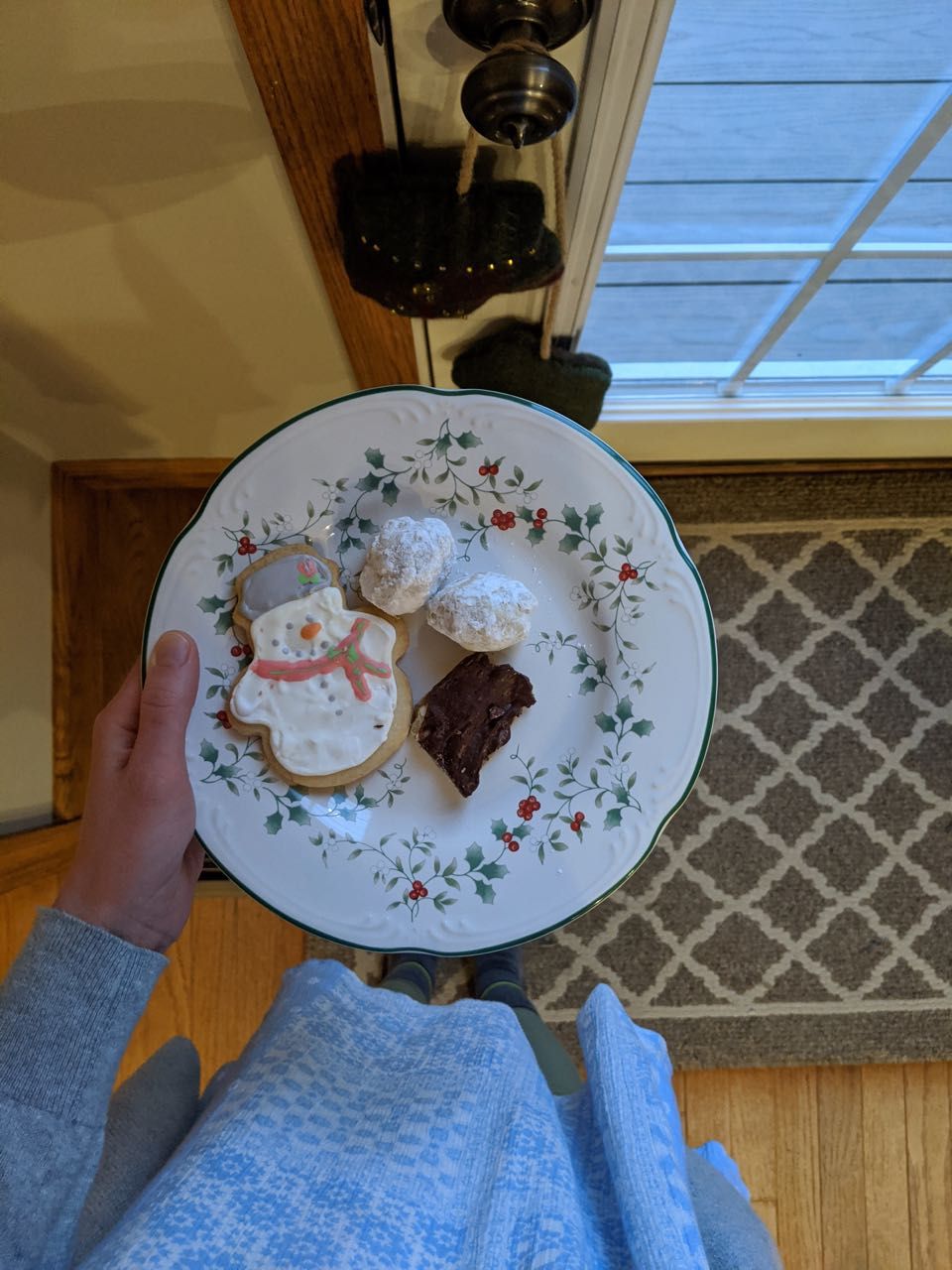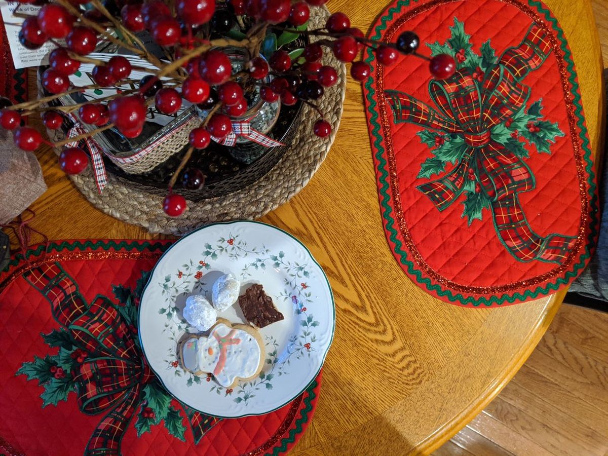 After the meal, we went to visit my in-laws. My mother-in-law served us a plate of treats with snowball cookies (made gf), sugar cookies, seasoned nuts, and dip with crackers. We had coffee in Christmas mugs, and just got to all visit together. We took photos of our four generations and of the family, and heard stories from my mother-in-law's childhood. The dogs had laps to sit in, and it was so cozy by the tree.
