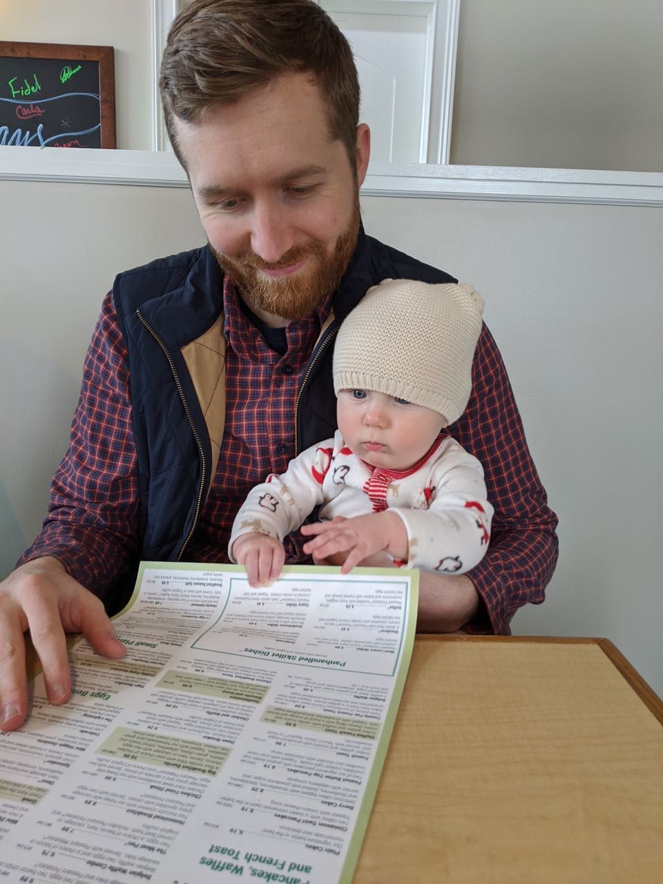On Sunday, after church, Nicholas and I went home so Coop could nap, and my dad and Grandma came over. My dad offered to hand-grind some coffee (tastier and quieter!) and we got to talk and sip on our coffee, just the two of us, while my Grandma dozed. And then we all went out for brunch when Cooper woke up. He did so well at the restaurant, just sitting on his daddy's lap, fascinated by the menu and all of his Nicholas' food, intent on charming everyone. He was pretty successful, of course.