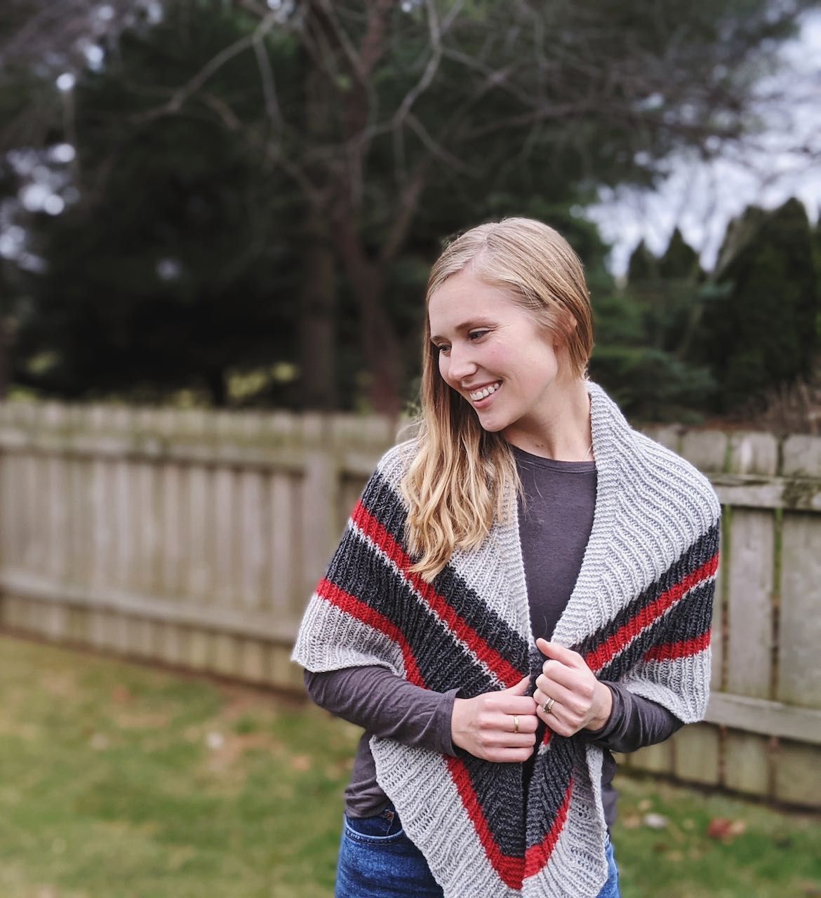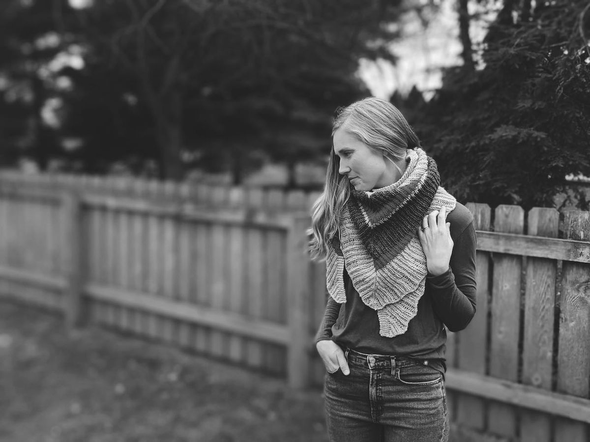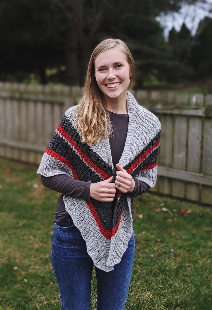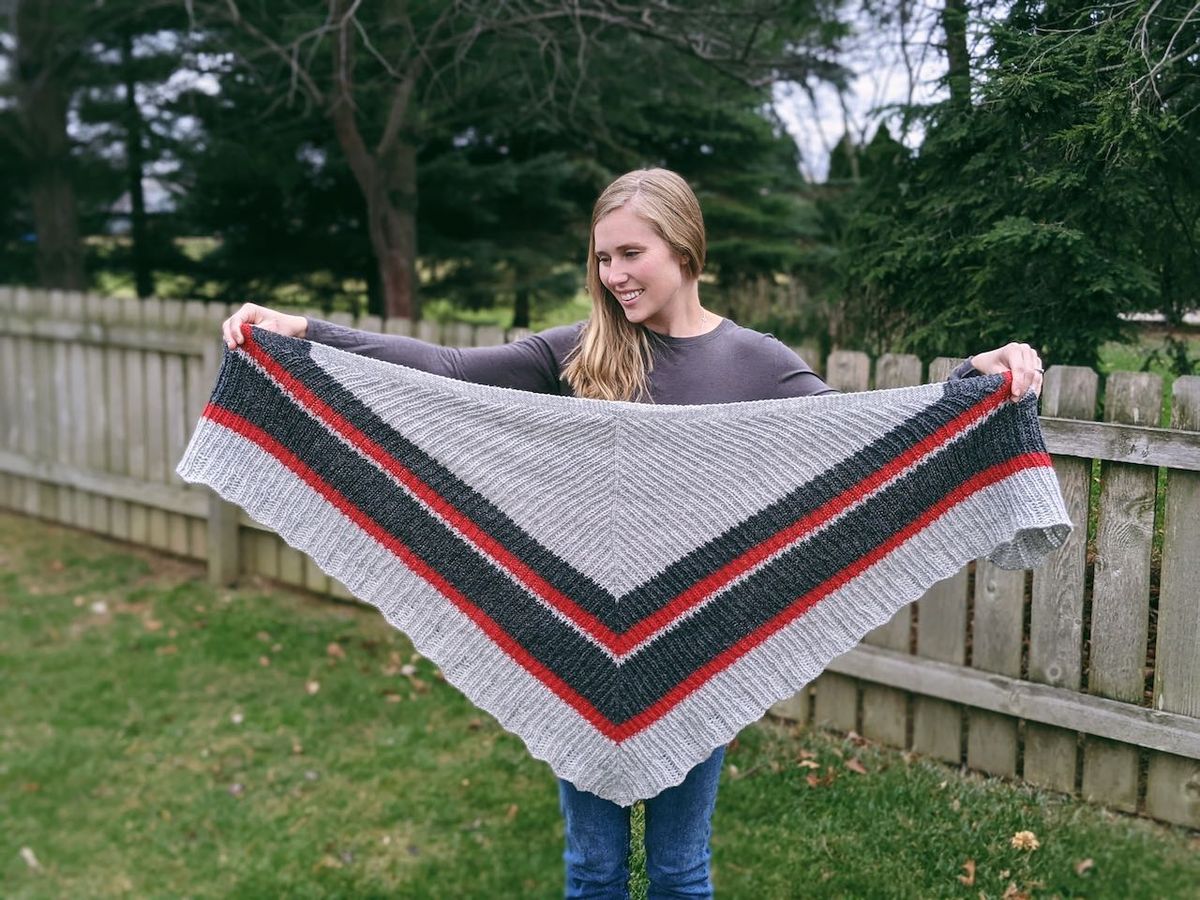 Specifics/modifications: The pattern calls for DK-weight yarn, so I choose needles that were smaller, and knit the pattern as written until gradually adding rows to each color stripe to make it larger, overall. I also knit some rows in the final color before knitting the border—rather than switching colors and immediately beginning border stitches. I did not aggressively block the border on the shawl, and I'm fine with a more subtle scalloped edge.