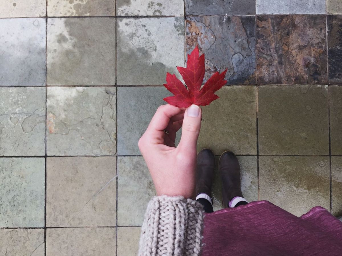 Nicholas and I walked to the mailbox together when he finished work today, "bundled" as much as we (finally!) can, me in layers and a scarf and him in the hat I knit him last Christmas. This is the season where I notice a shift in my mood—a release of sorts. I feel like there's more room to breathe, more room to live in this season than there is in the hot months. I found one tiny, red maple leaf on the walk to the mailbox. We got there and the mailbox was empty, anyway, but it was worth it, to be at his side, finding a tiny red leaf, breathing October air, feeling a bit of drizzly rain on our faces, finding those sparks of joy, and choosing to breathe deeper.