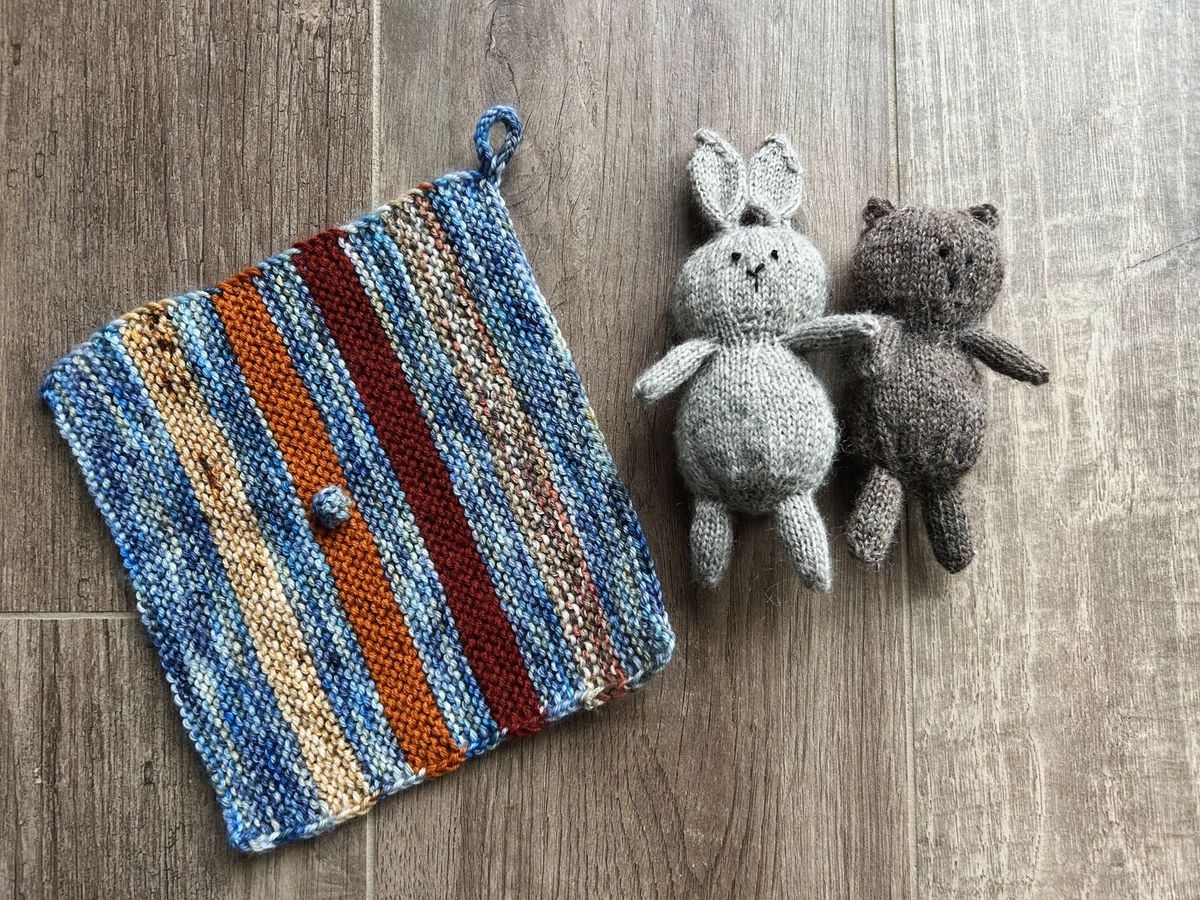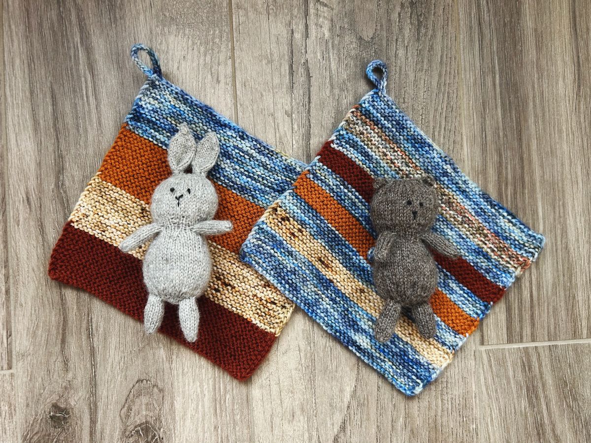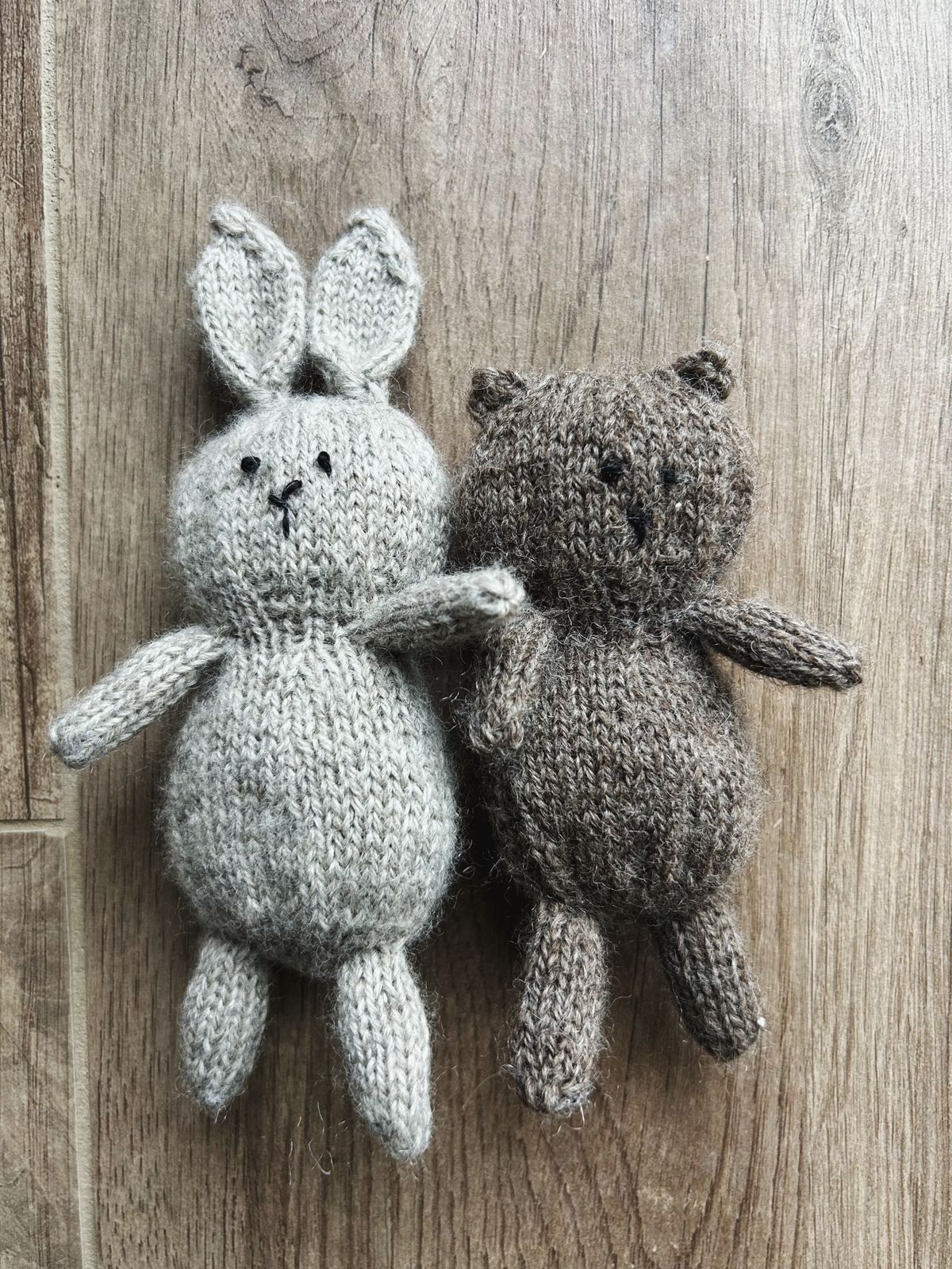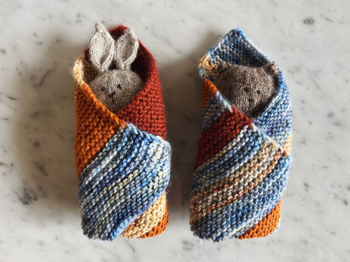 Then the boys each unwrapped a handmade gift from me: small knitted animals (a bear for Finn and a bunny for Cooper), each wrapped up snug in a "swaddle." Both boys absolutely loved these as well.