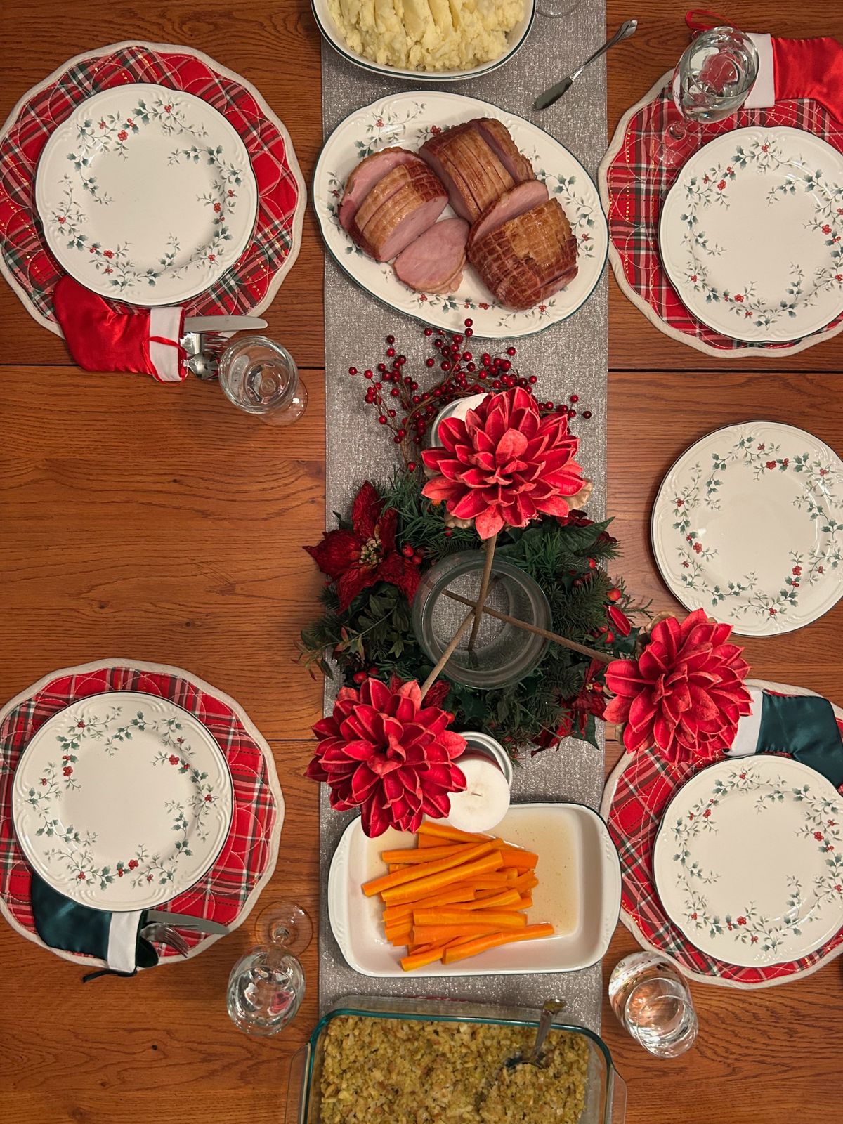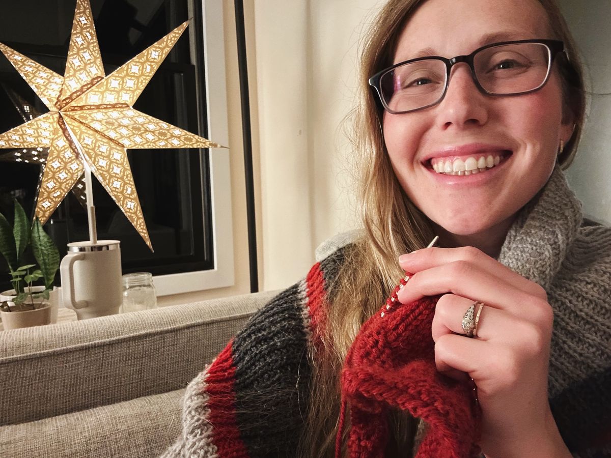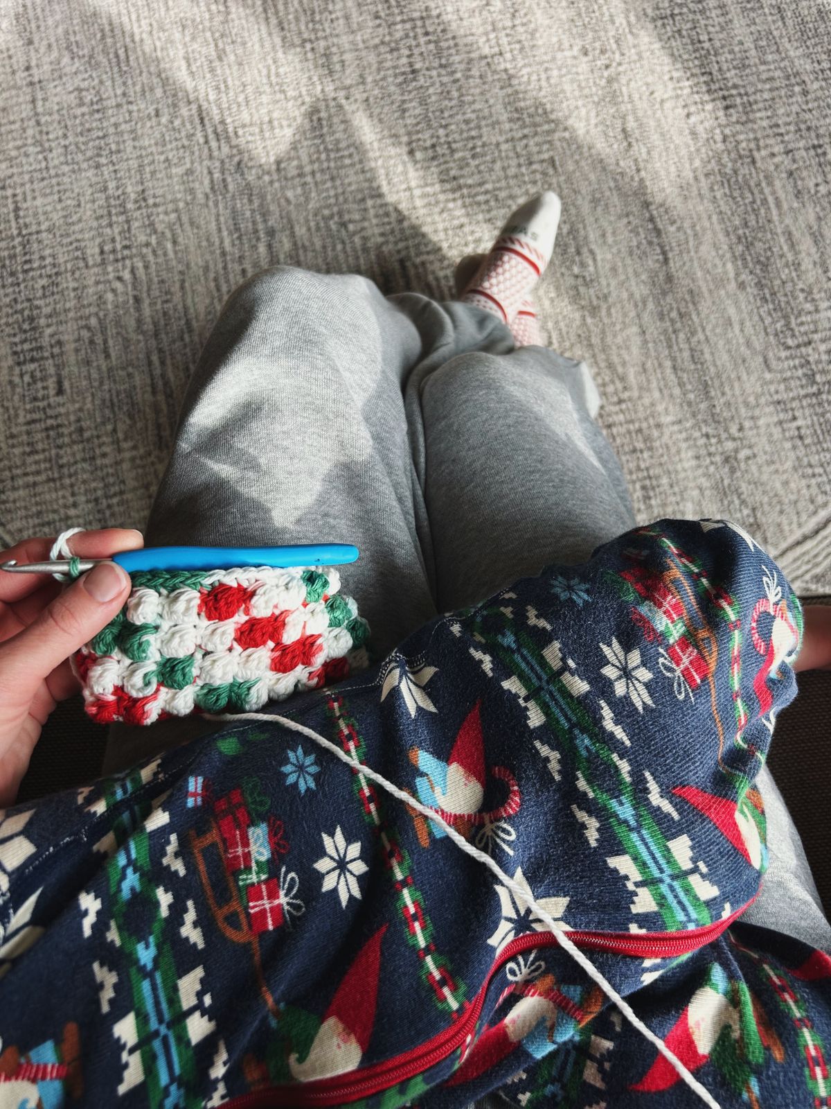 We had sourdough cinnamon scones and chocolate crinkle cookies and coffee in the afternoon, and I frantically crocheted on a Christmas potholder for my SIL, Katelyn (not telling her that it was for her until I finished it). And then we prepared dinner – a ham, mashed potatoes, stuffing, sourdough dinner rolls I baked earlier in the day, and steamed carrots. It was all delicious and after cleaning up and a little more visiting, we headed home, driving past some Christmas lights (but only briefly, because Arlo was more than ready to be home and out of his carseat).