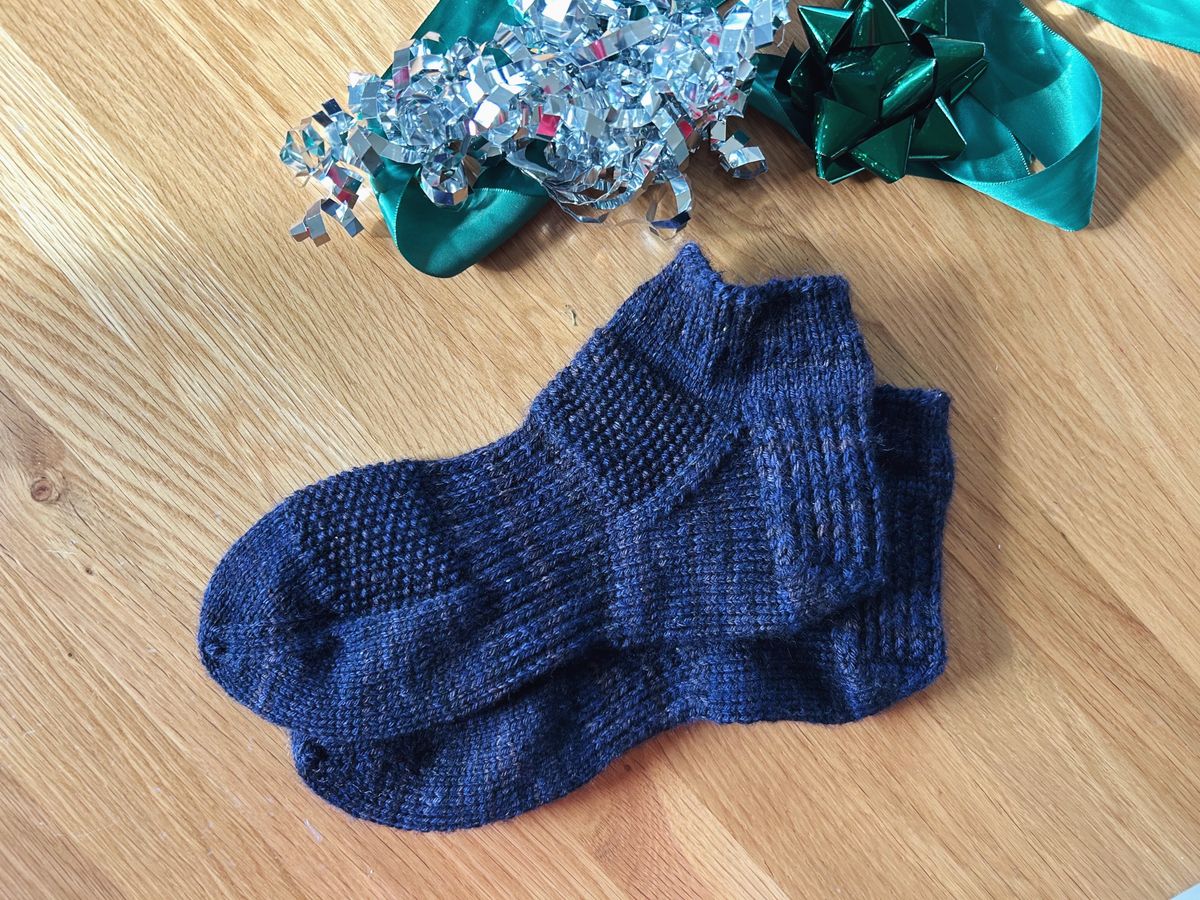 I barely managed to finish knitting a pair of socks for Nicholas for Christmas – doing the kitchener stitch on the second toe after 11pm on Christmas Eve. And I also made him a small, ribbed cowl, out of Knitting for Olive heavy merino. Ravelry project pages with more details can be found here for the socks and here for the cowl.