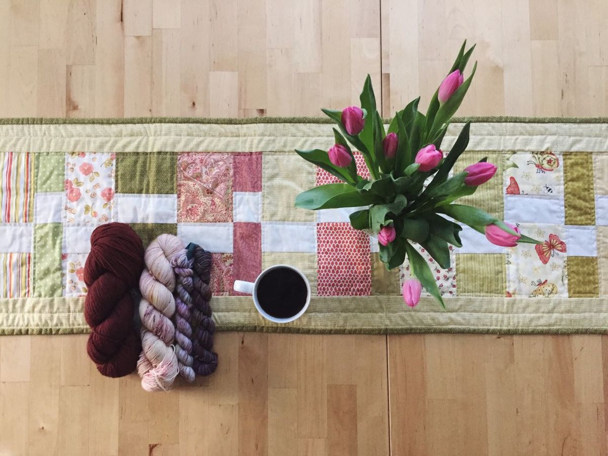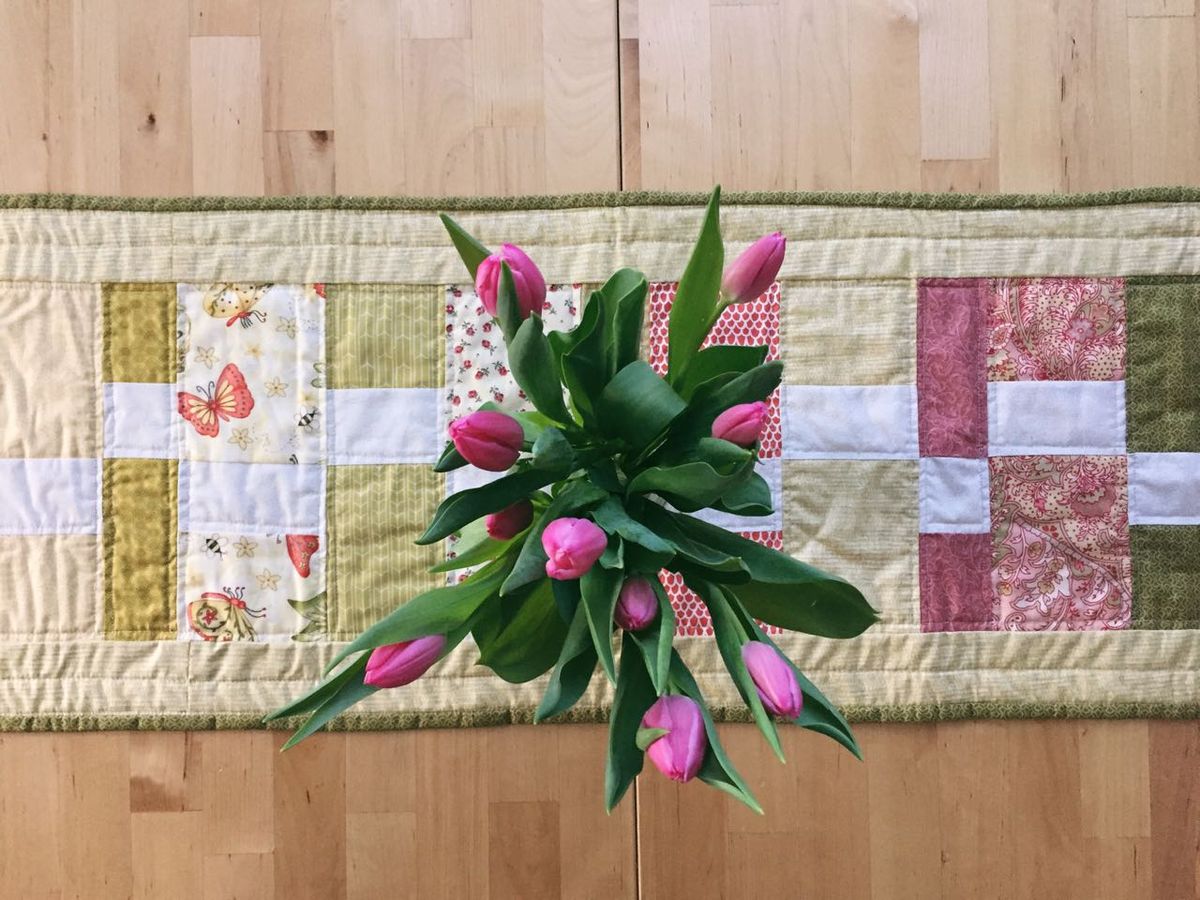 I don't personally have any sewing projects I've finished, but I simply had to show you the quilted table runner my mom made for me! I just love it so much. And it was a surprise when they came to visit a few weeks ago. Thank you mom, for such a pretty, practical, and thoughtful gift! It's already brightening our home.