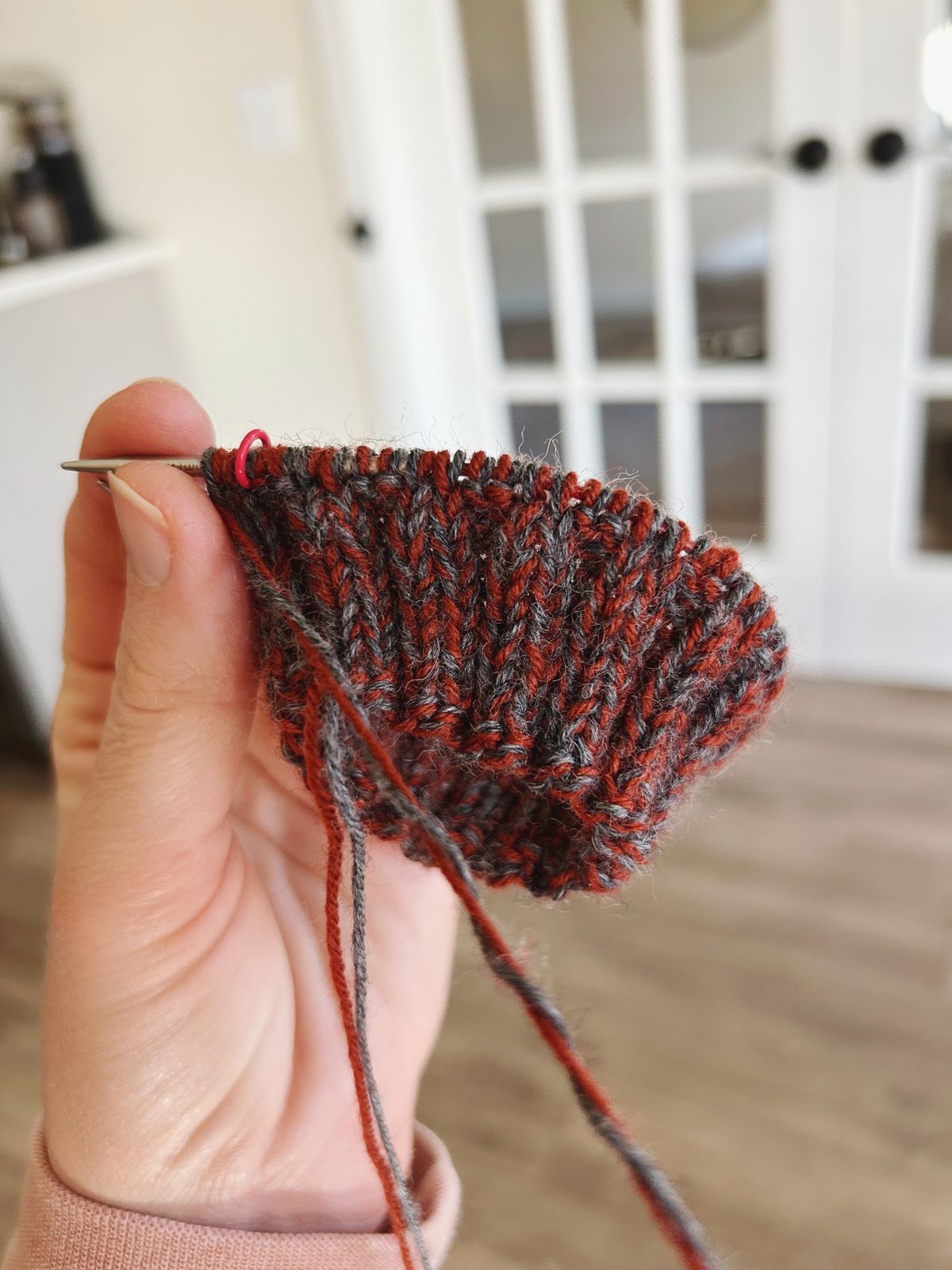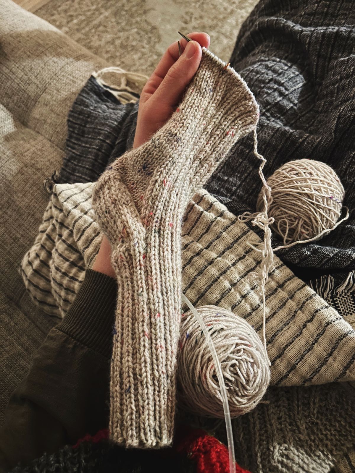 - A pair of ribbed DK-weight socks for Nicholas – I have been in a groove of knitting DK-weight socks, apparently. They knit up quickly, and I like that since they use more yarn, I am left with fewer leftovers. The resulting pair of socks is cozy, a bit warmer, and durable. For this pair, I am knitting 2x2 ribbing on the top of the foot, with stockinette stitch on the back. I am enjoying the low-contrast marled look, as well. All the details can be found on my ravelry project page.