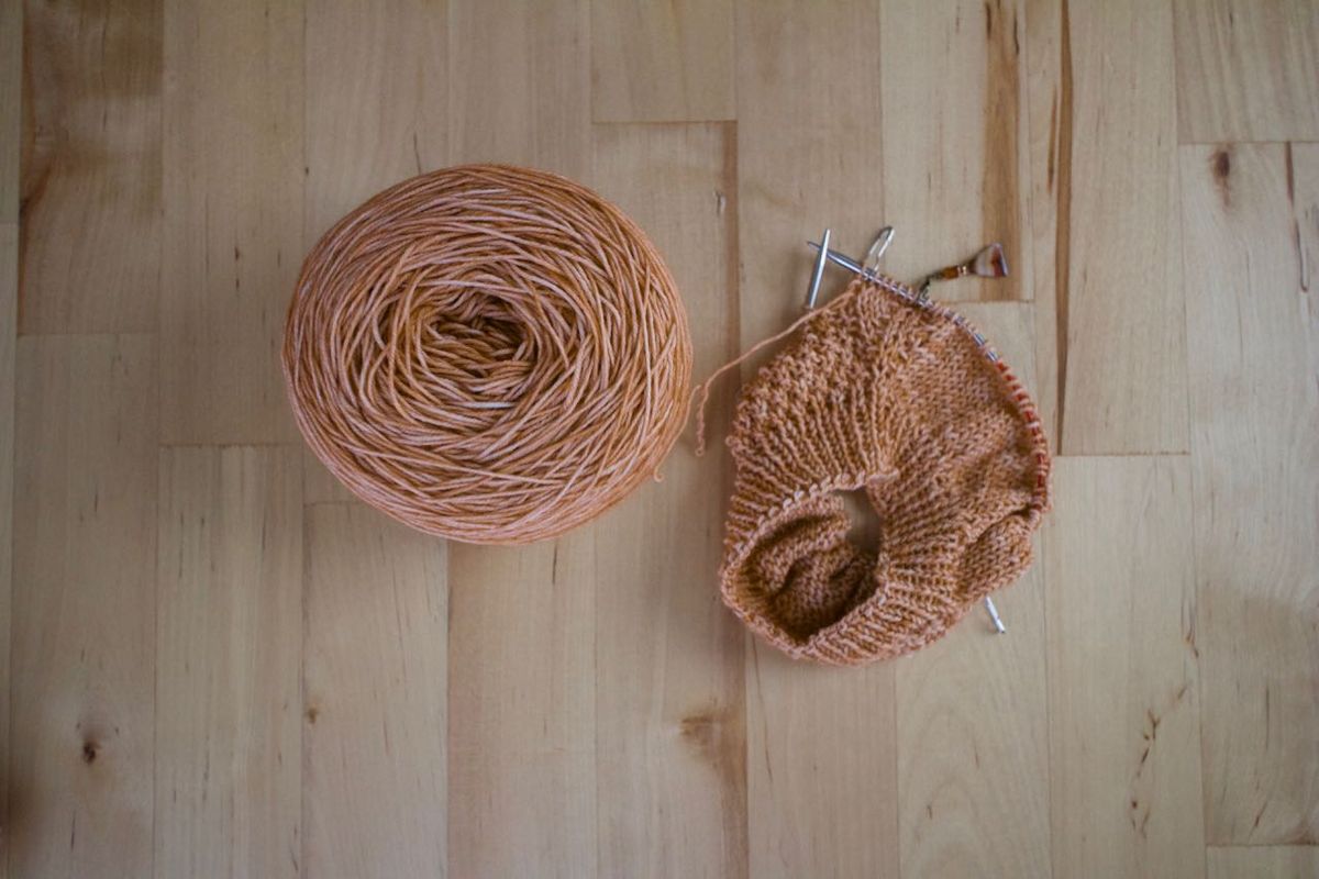 - Flaxlight pullover for Baby DeVries—just cast on yesterday in pumpkin-/sweet-potato-colored yarn. This is somewhat the quintessential baby pullover, but I appreciate that I use a single skein of special yarn for it. Instead of the garter panel on the sleeves, I'm knitting moss stitch.