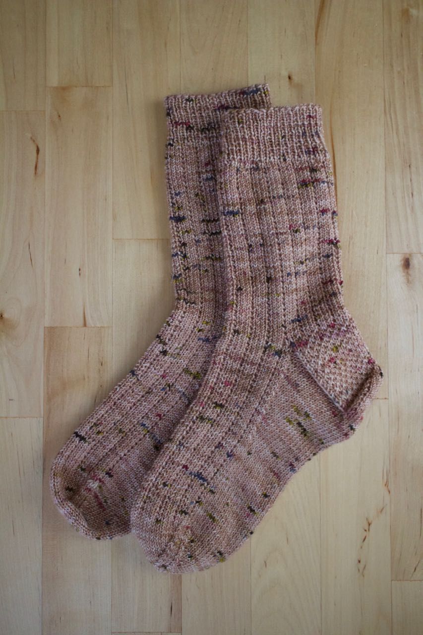 Pattern: improvised garter rib sock pattern, see my ravelry page for specifics, along with heel instructions and gusset shaping from the Cyril Socks, which fit me the best of any pattern thus far