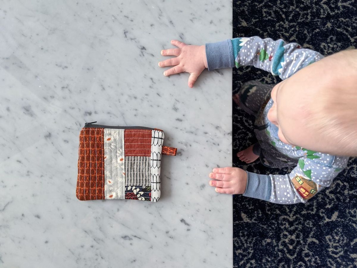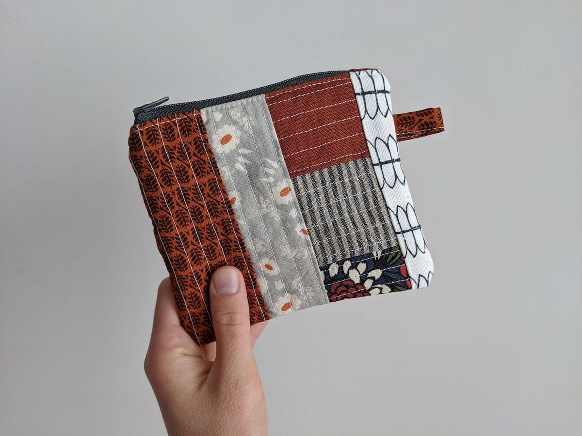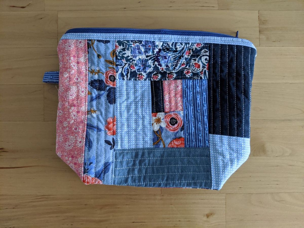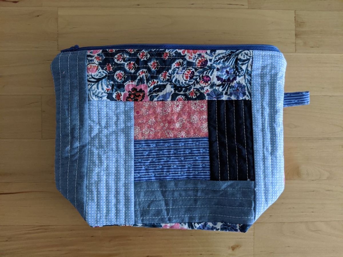 A zippered boxed pouch. Another use for a QAYG panel. I did expect this to be a little bit larger, but the thing with sewing is I truly do need to be aware of seam allowances and just how much fabric is necessary for a boxed bottom. I do love the finished product and it should be a good size to house a pair of socks or other single-skein projects.