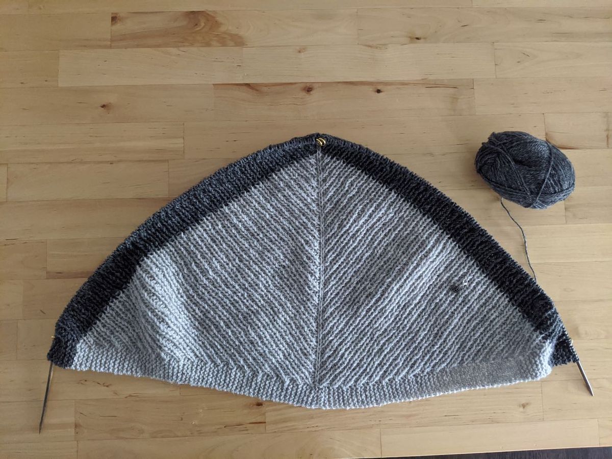 - my Atmen shawl in Icelandic/Faroe island wool. I've started the first stripe sequence on this, so it feels like I have a bit more momentum. The stitch pattern is easy and familiar enough now that it's a relaxing knit, and nice for evening/TV knitting.