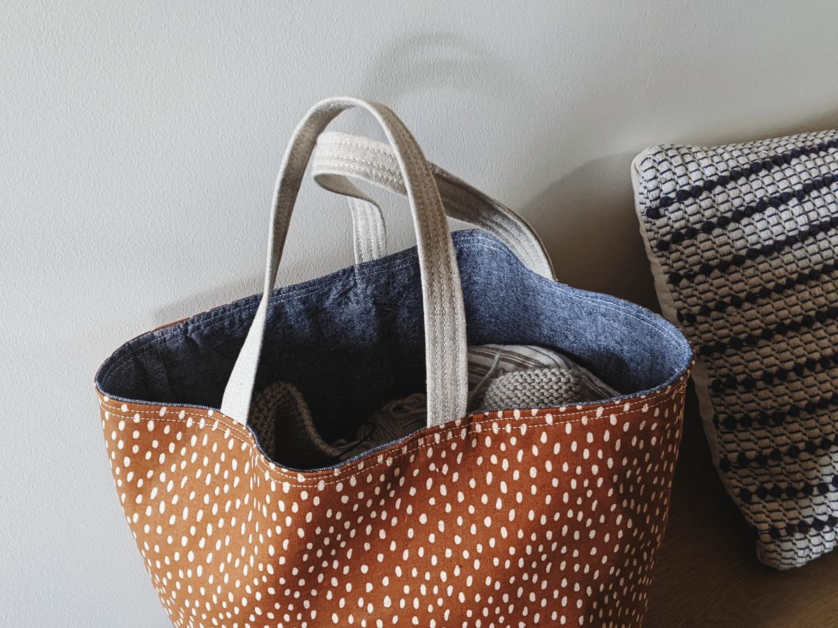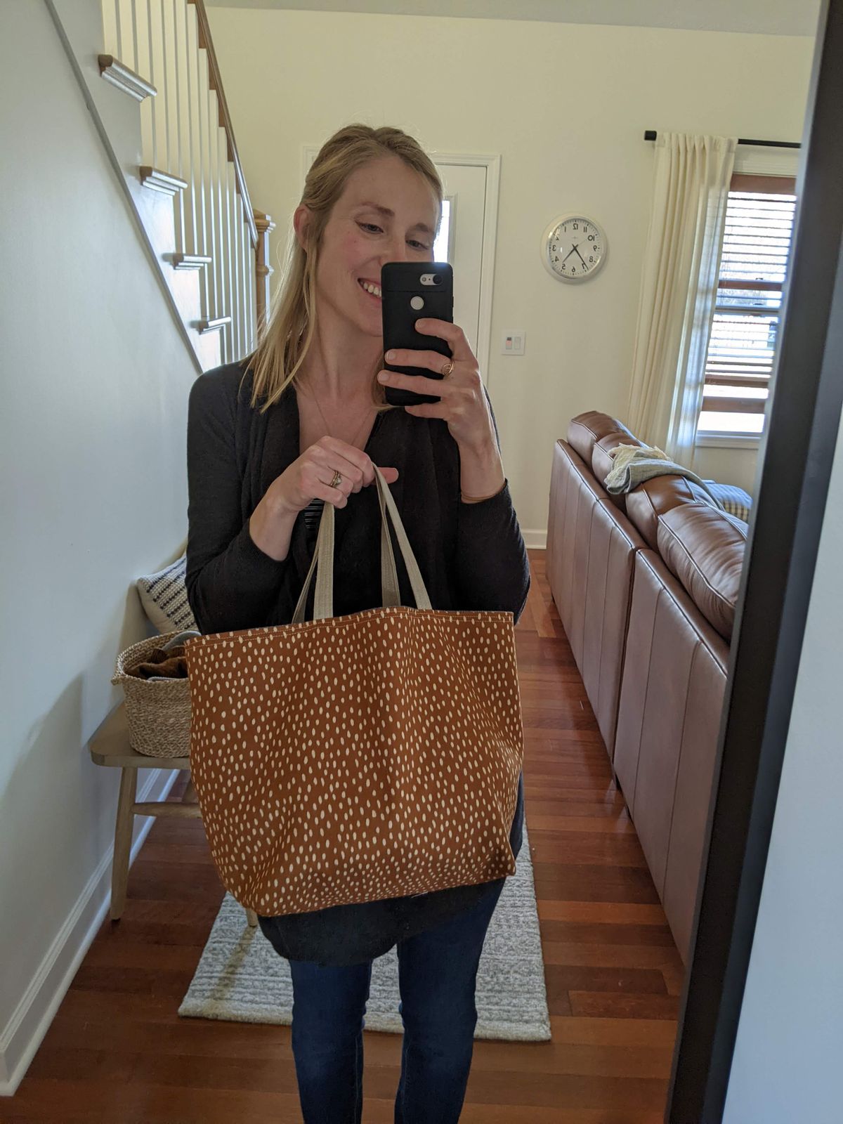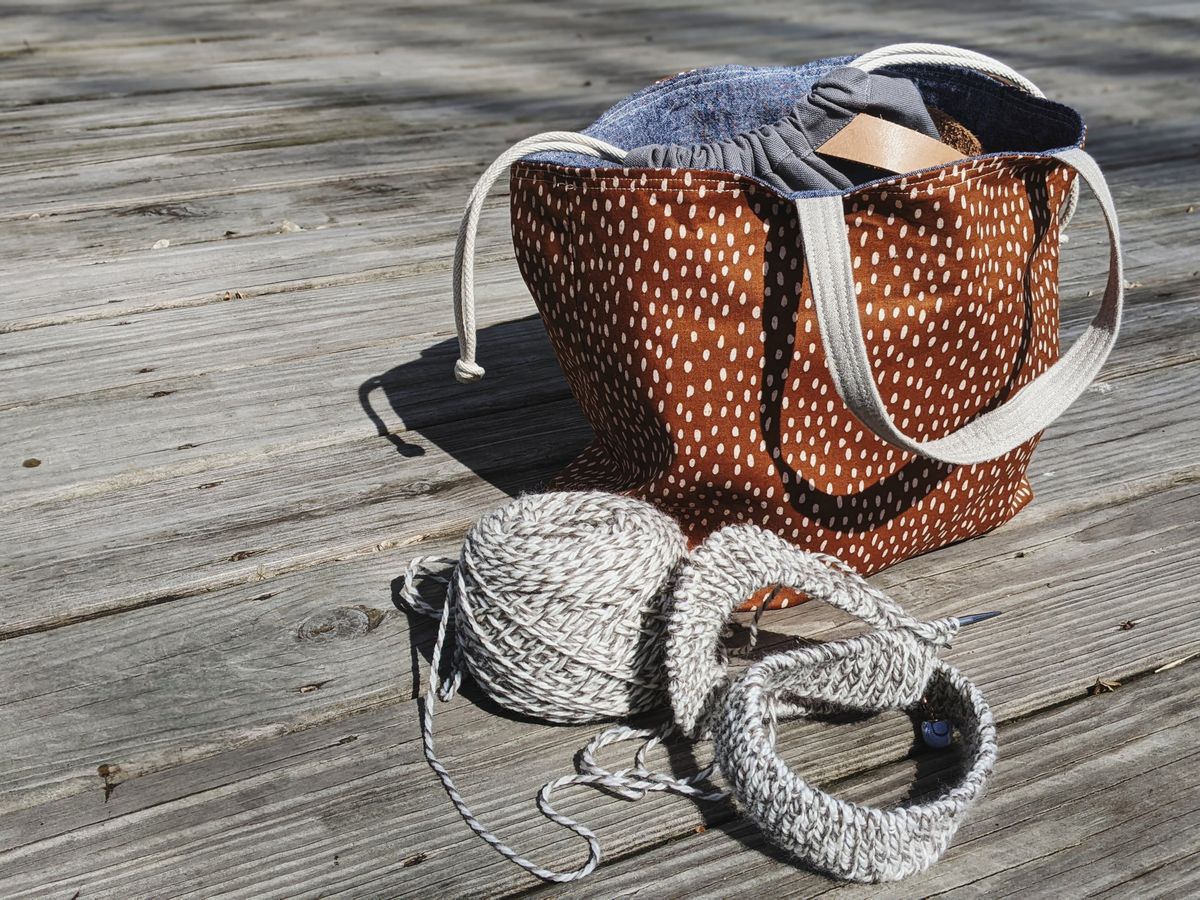 I have long talked about sewing a Chubby tote (free pattern tutorial available on YouTube, and paid pattern also available with more sizes). At Hobby Lobby, I saw some fabric I loved, bought it, and then decided on a whim one day to sew it up. And my goodness, I underestimated how much I love this tote. The size is perfect for holding a larger knitting project, such as a sweater, and it also works beautifully to store a few smaller knitting projects. I've been carrying it around the house and out to the front porch and back deck on mild days so I can bring my knitting for a few stitches here and there between pushes on the swing and picnic snacks, and saying ready, set, go! for toddler races across the deck. In lieu of leather straps, which I didn't have, I followed her tutorial to make fabric straps out of some neutral linen. The exterior fabric is a quilting cotton, reinforced with interfacing, and the lining is a Robert Kaufman cotton/linen blend that I enjoy so much I could make a million projects with it. This will not be the last Chubby Tote that I make.