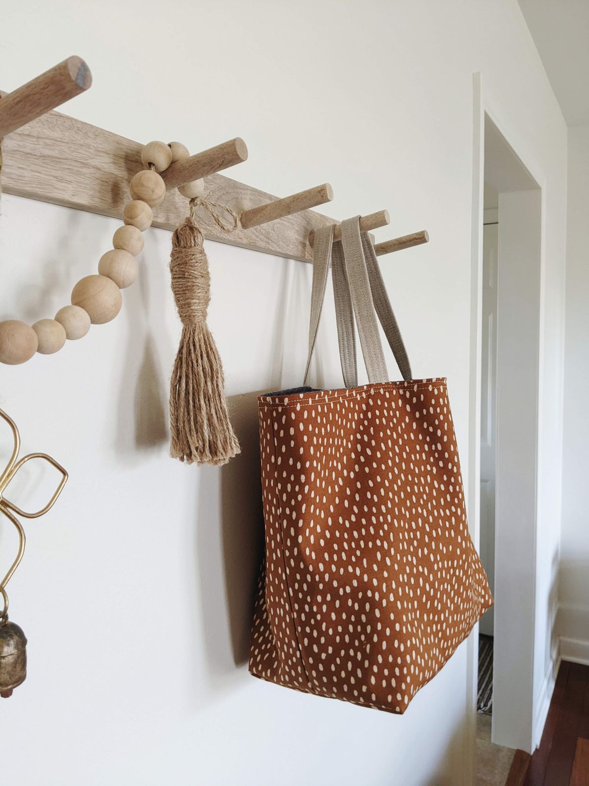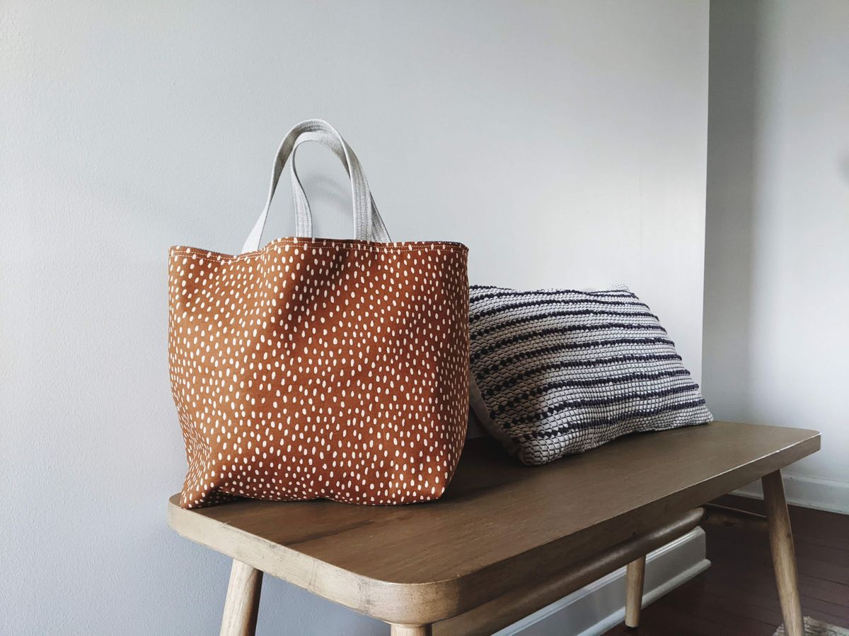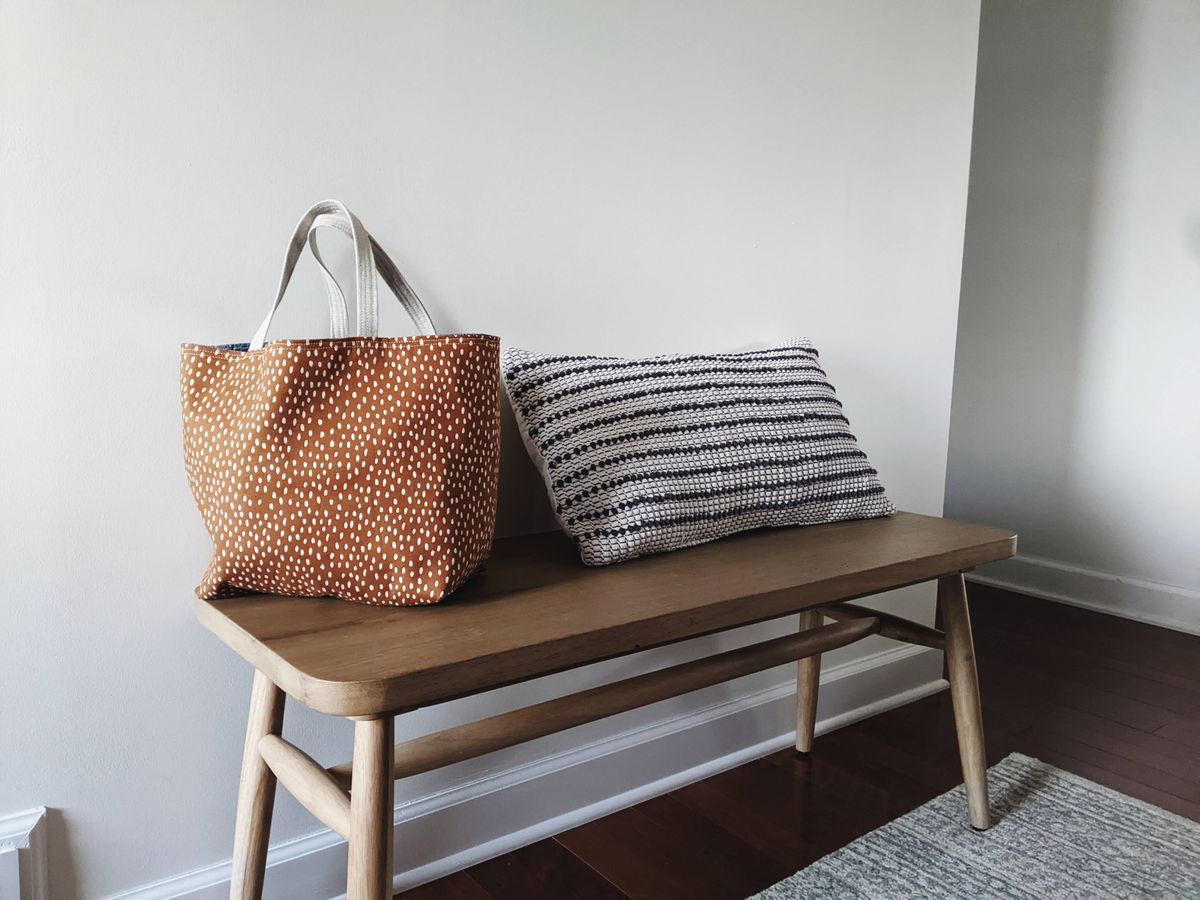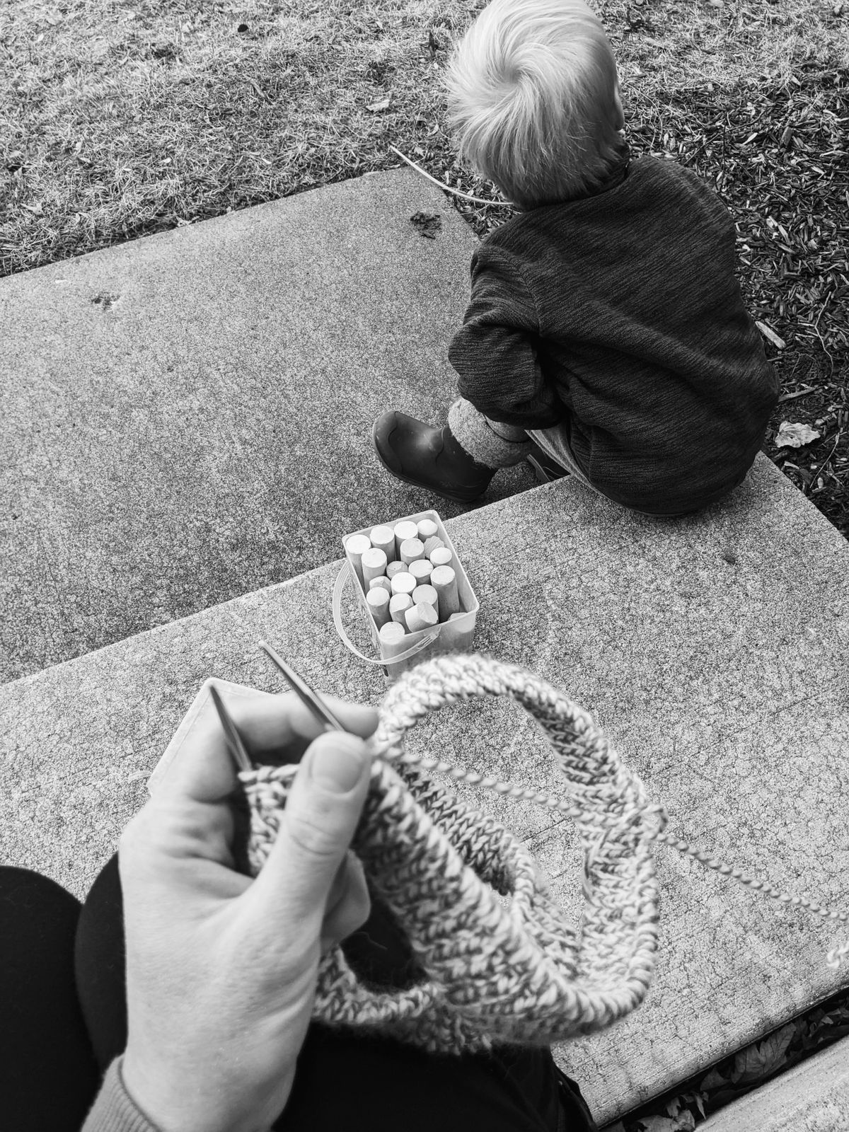 I have long talked about sewing a Chubby tote (free pattern tutorial available on YouTube, and paid pattern also available with more sizes). At Hobby Lobby, I saw some fabric I loved, bought it, and then decided on a whim one day to sew it up. And my goodness, I underestimated how much I love this tote. The size is perfect for holding a larger knitting project, such as a sweater, and it also works beautifully to store a few smaller knitting projects. I've been carrying it around the house and out to the front porch and back deck on mild days so I can bring my knitting for a few stitches here and there between pushes on the swing and picnic snacks, and saying ready, set, go! for toddler races across the deck. In lieu of leather straps, which I didn't have, I followed her tutorial to make fabric straps out of some neutral linen. The exterior fabric is a quilting cotton, reinforced with interfacing, and the lining is a Robert Kaufman cotton/linen blend that I enjoy so much I could make a million projects with it. This will not be the last Chubby Tote that I make.