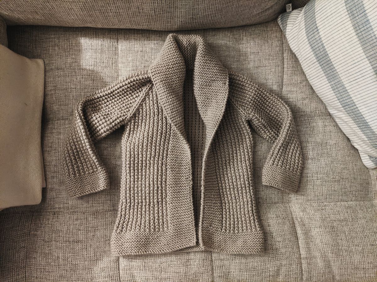 The cardigan is definitely oversized, but I would rather that than have Cooper outgrow it quickly. It still needs buttons, and in the included photo, it isn't blocked, but the knitting and seaming are done.