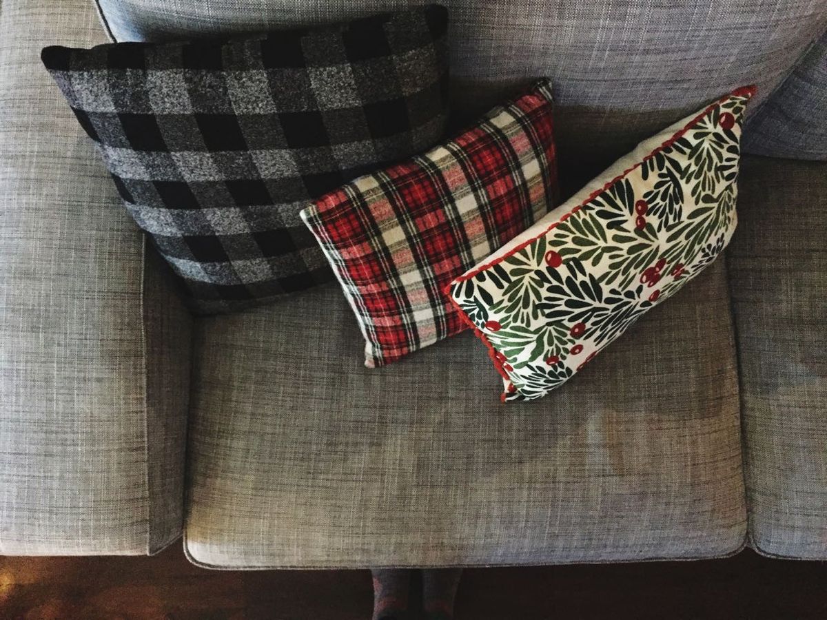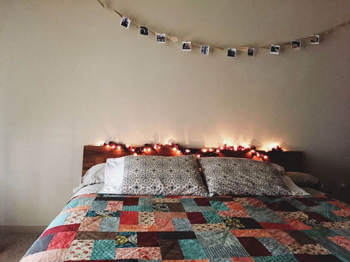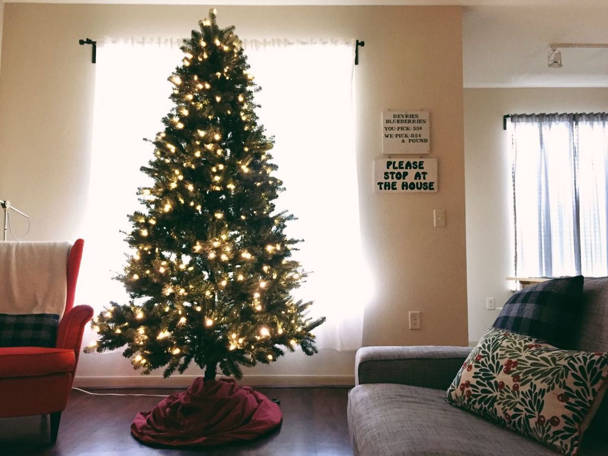 We enjoy apartment life, for the most part. For now, it works well for us to have a small, essentially maintenance-free home. That said, we still want to keep it cozy but not cluttered when the holidays roll around—partaking in festive decorations without having huge bins of decorations to store. So we keep things simple: a twinkly tree (ornament-free for this life stage), a lit vase with lights and glass ornaments on the kitchen counter, a string of lights on our headboard, a mistletoe pillow cover, and a few snowflakes on the bulletin board.
