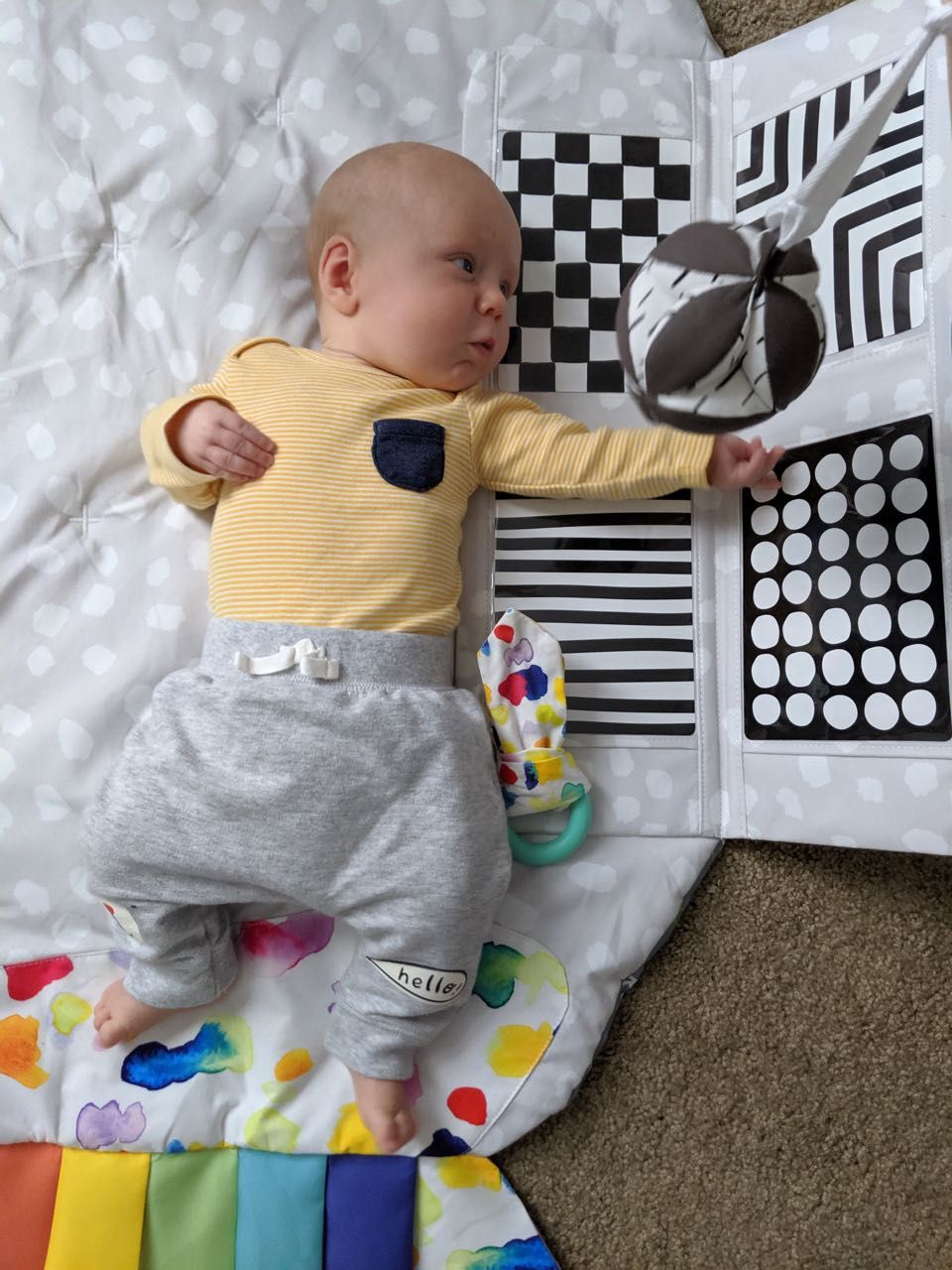 - Seeing Cooper reach for toys and interact more. He is getting more and more able to entertain himself on the play mat when he gazes at the high contrast sections and reaches for toys. He loves the "crinkly" texture/sounds as well. And he has a little elephant lovey that he can hold onto (sometimes) if only to chew on it ;)