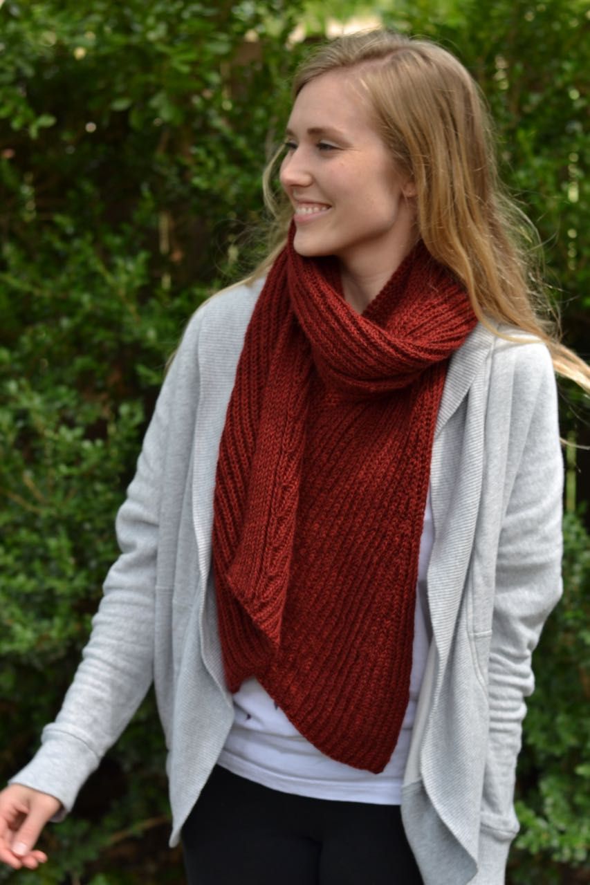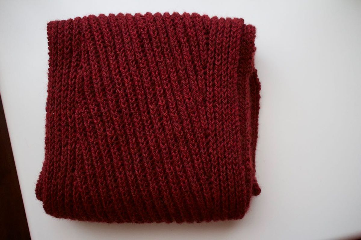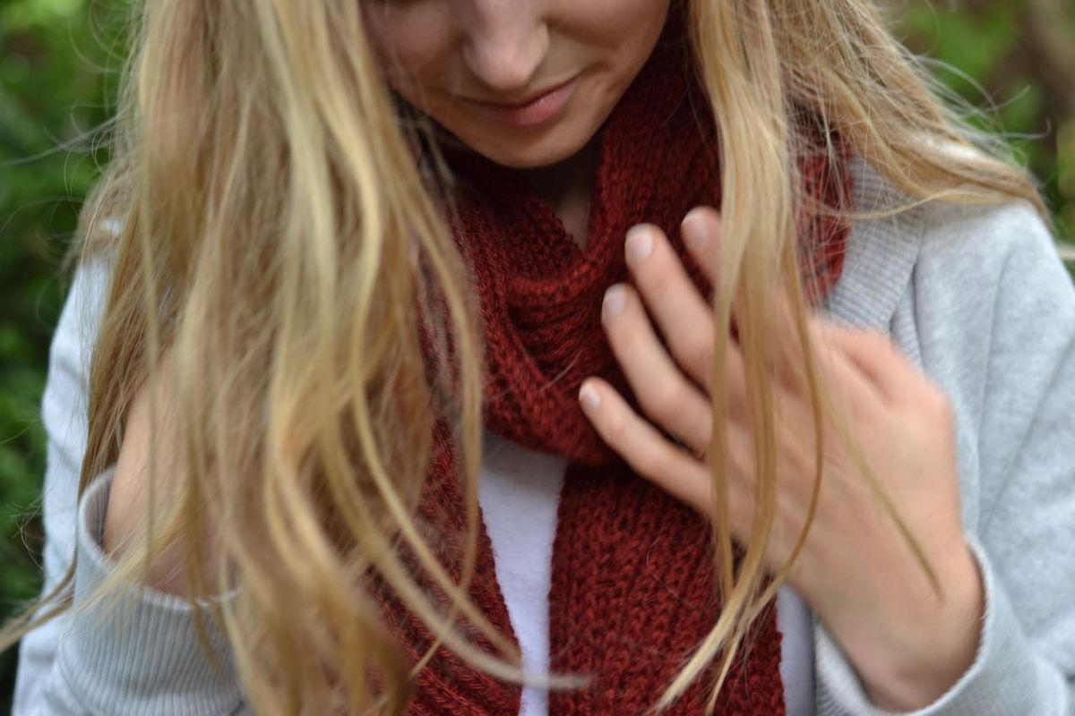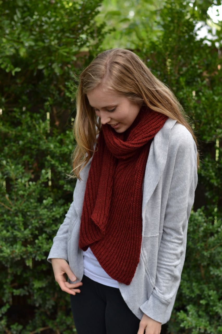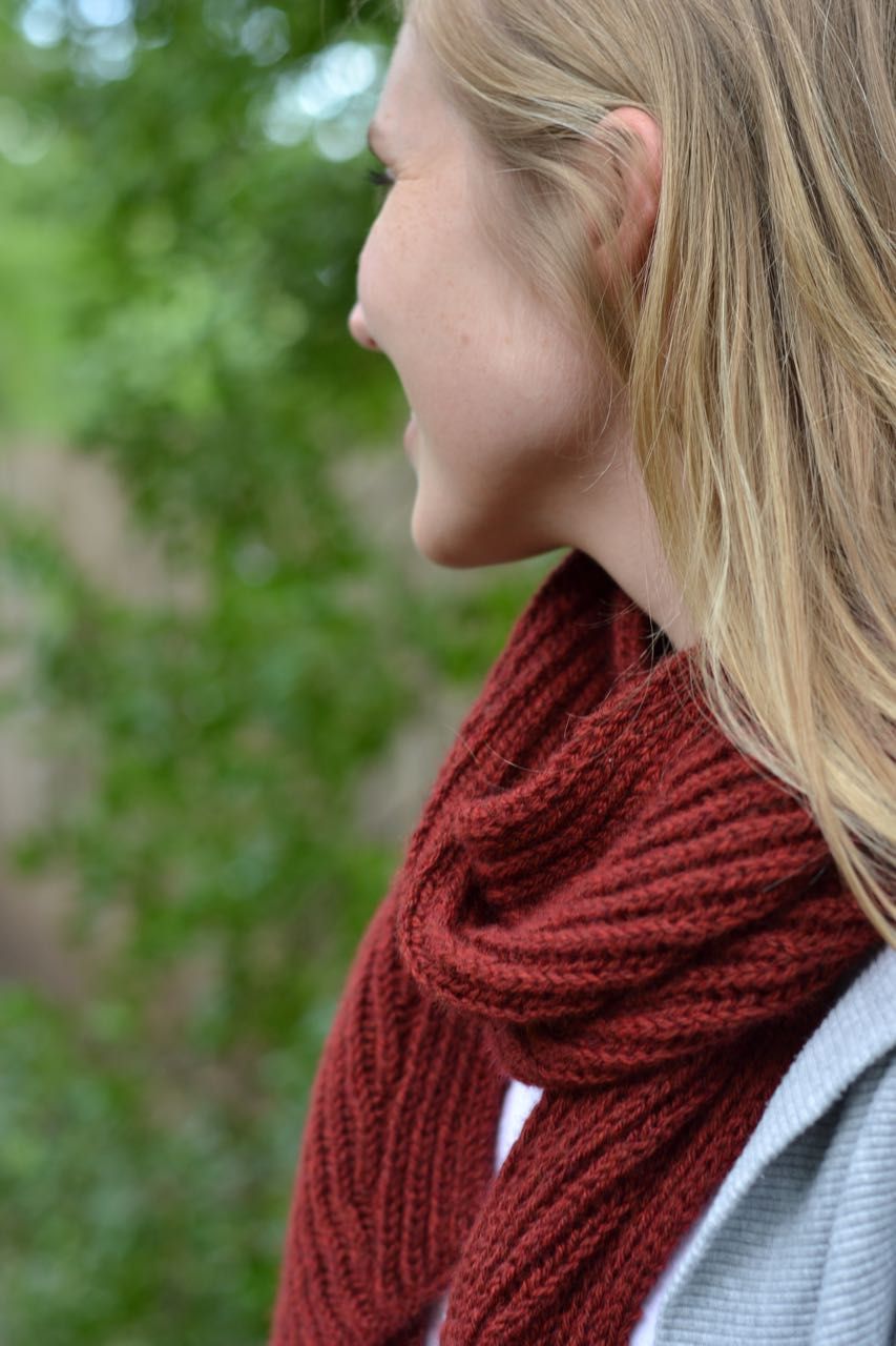 I actually love the finished object far more than I liked it in process. This poor yarn has been through the wringer — see red yarn, five tries — and was rather "crinkly" from being in knitted form, sitting untouched in storage. As I knit with it, the stitches looked a bit uneven and sloppy. I wasn't too worried because I knew I'd still wear this scarf, albeit wrapped up and tucked in and not examined too closely. However, blocking worked a small miracle and now I have a finished scarf in a pretty color, with even tension, lot of smooshiness (a technical term, of course), and a super soft hand. However I thought it would turn out, the process of knitting this was really enjoyable. Brioche-on-the-bias had just enough interest to keep me entertained, but plenty of mindless rows, too. After all those failed attempts, this yarn deserved a little photo shoot, and my friend Molly generously offered to take some pictures of me wearing it. :)