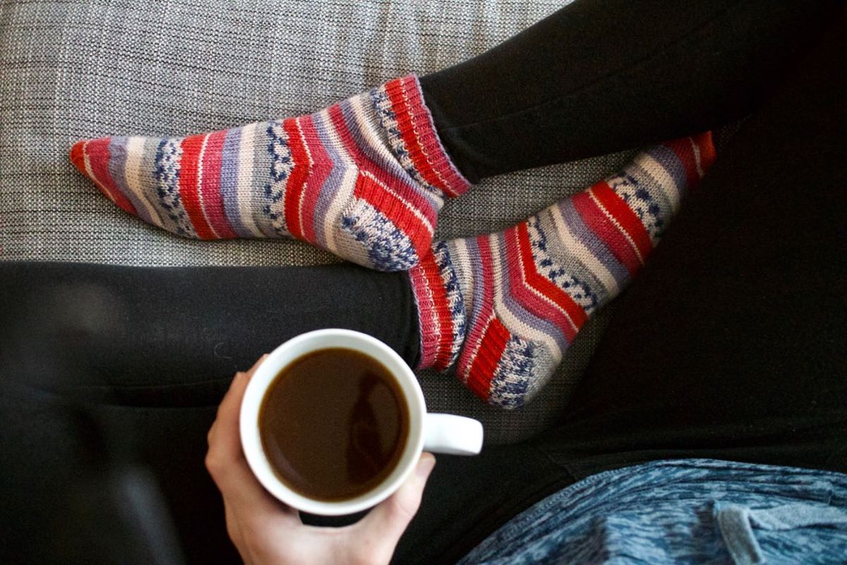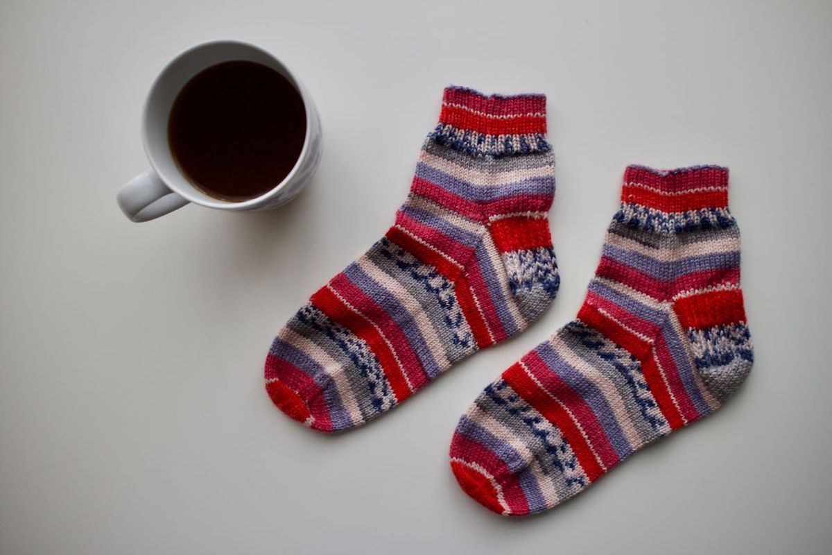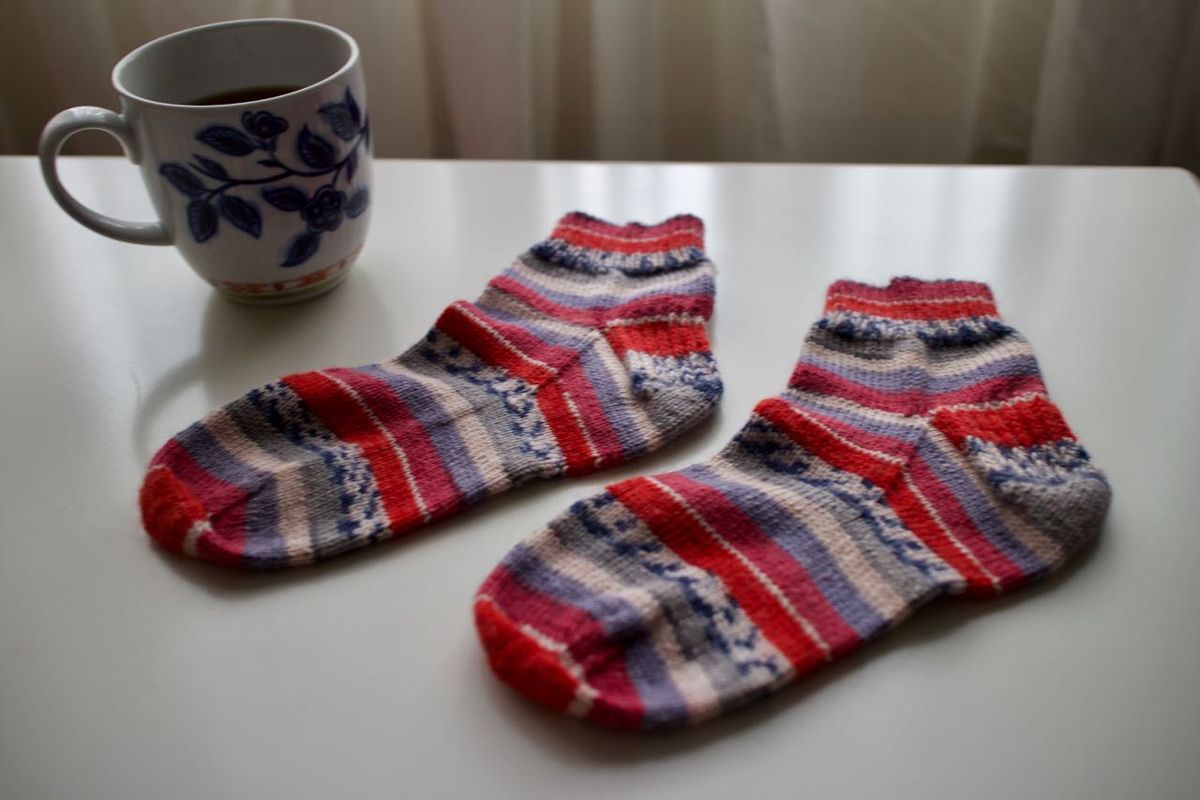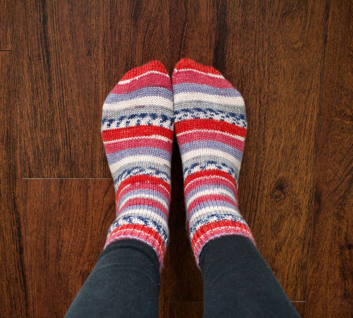 I knit them quickly, since this was my second time through the pattern and self-patterning yarn basically knits itself (just one more color before bed, okay, just one more color before bed, etc.). And turns out, I'm not mad to have spent hours knitting the first sock. For one, I got to trial a new pattern and that helped me realize what I'd modify next time. We realized I knit the first sock a bit too large (I've included a picture below so you can see just how big it is compared to my socks!), so I'll size down, and they were fun to knit, since the yarn is inherently fun.