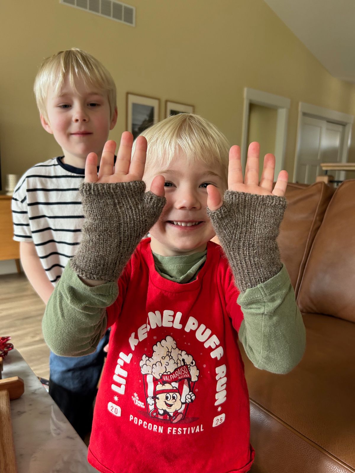 - He still loves wearing capes. And the knitted handwarmers I made for him? He wears them nearly all day and sleeps in them as well.