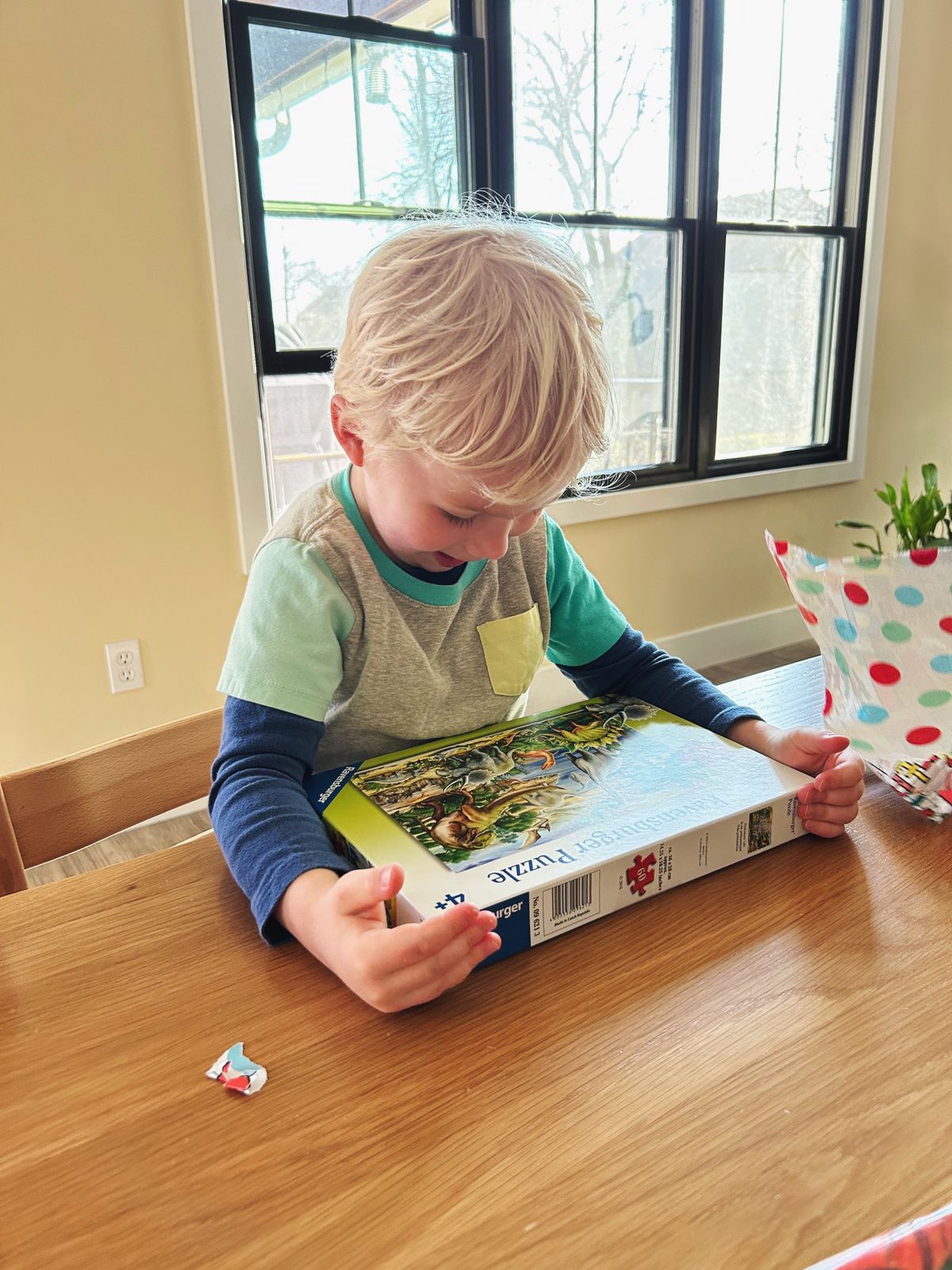 Later that day, my father-in-law and his girlfriend, Kate, came over to celebrate with us and to have dinner together. They gave Finn a Zelda book, dinosaur puzzle, and dino egg excavation kit, all of which were eagerly received.