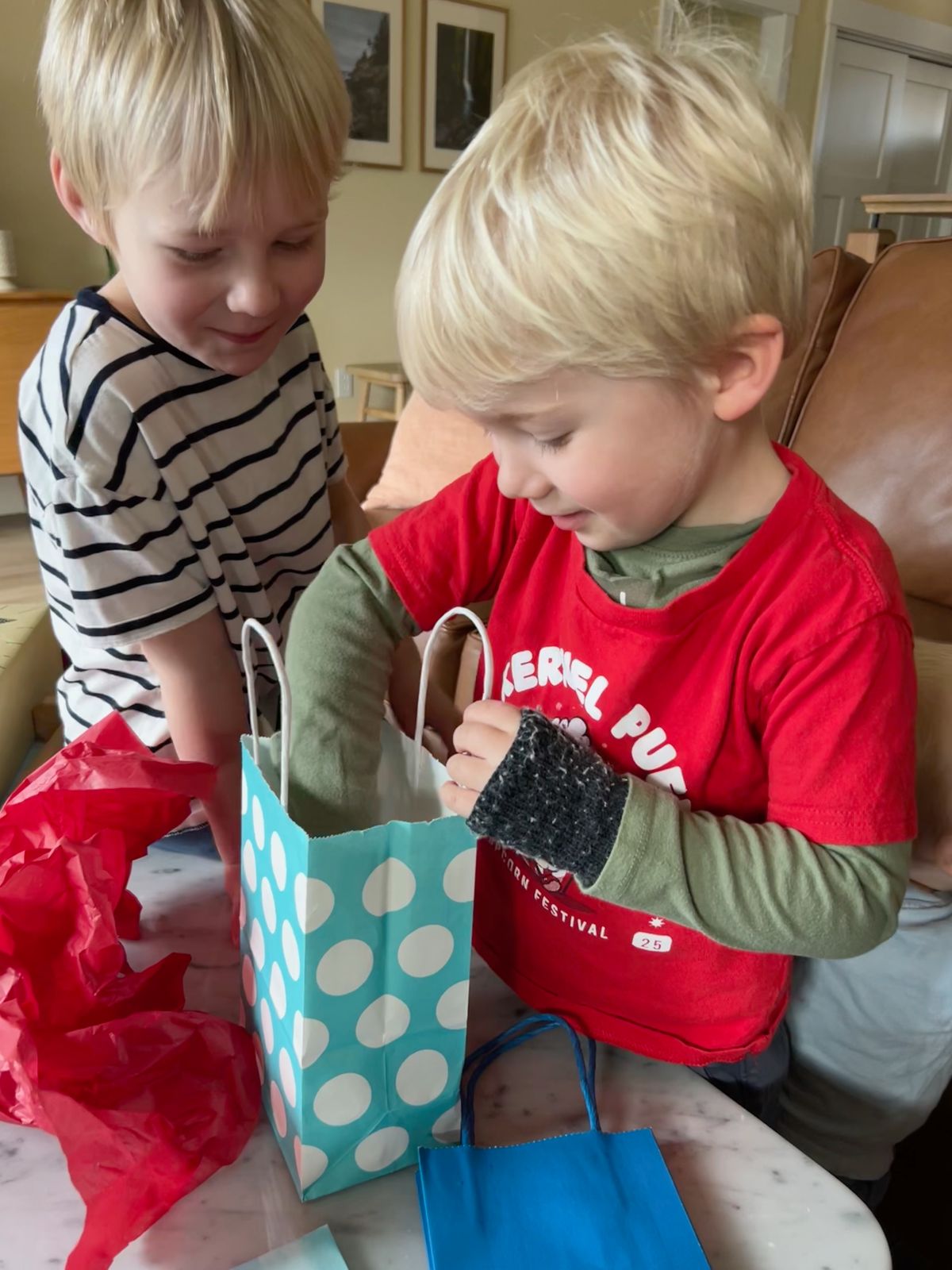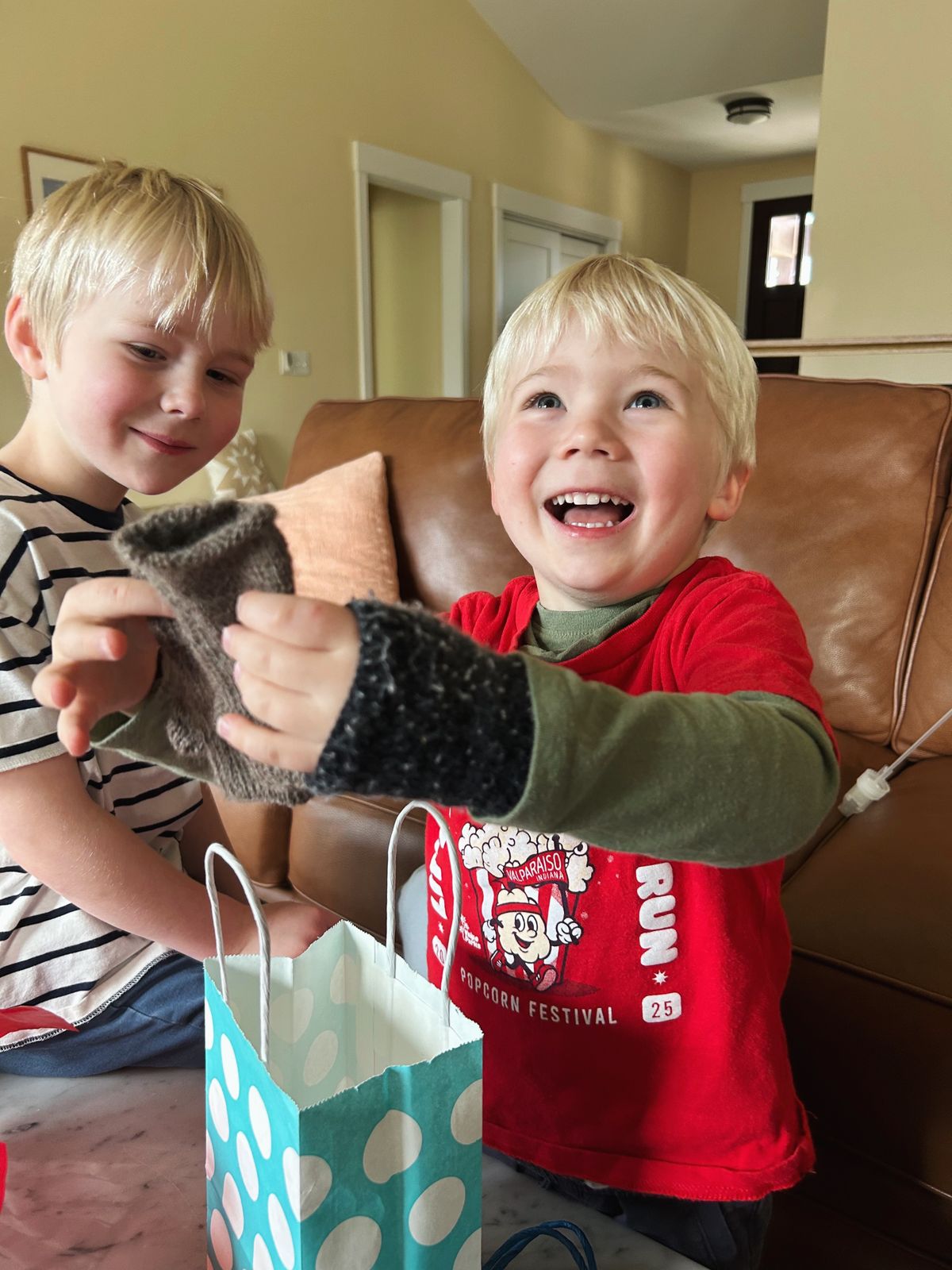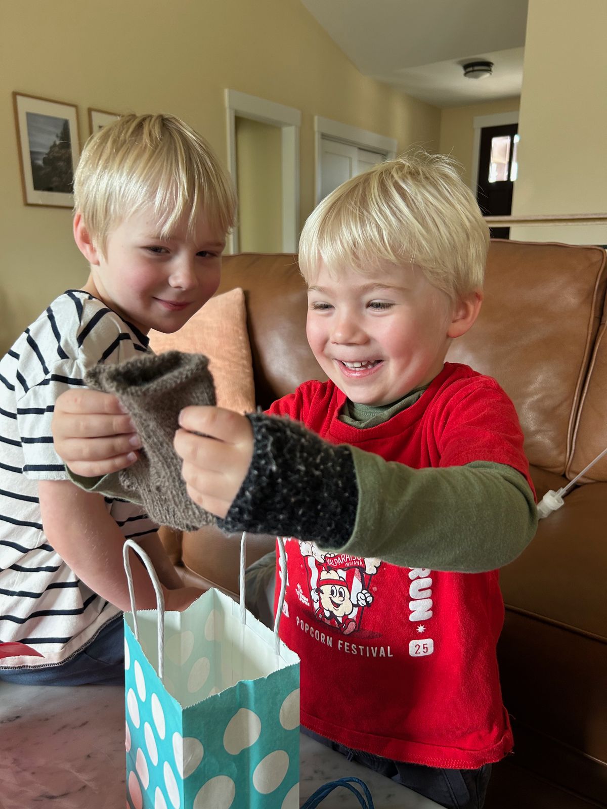 On his actual birthday, after breakfast, he opened his gifts from us – a Lego set with lots of small Lego cars, a second pair of knitted handwarmers, and a set of nerf guns. The look on his face when he opened his handwarmers was priceless. Cooper picked out a Lego batman figure for Finn, and he loved it, as well.