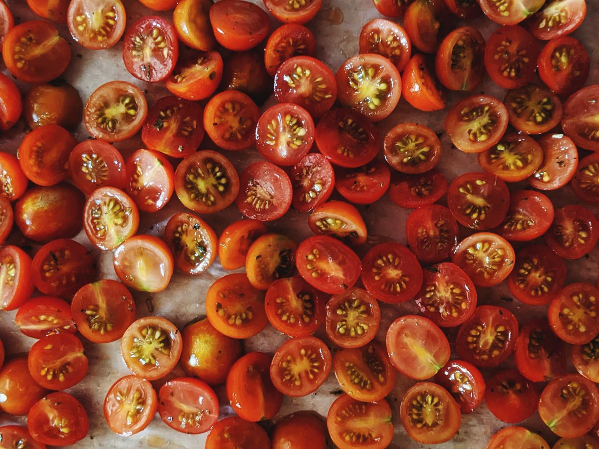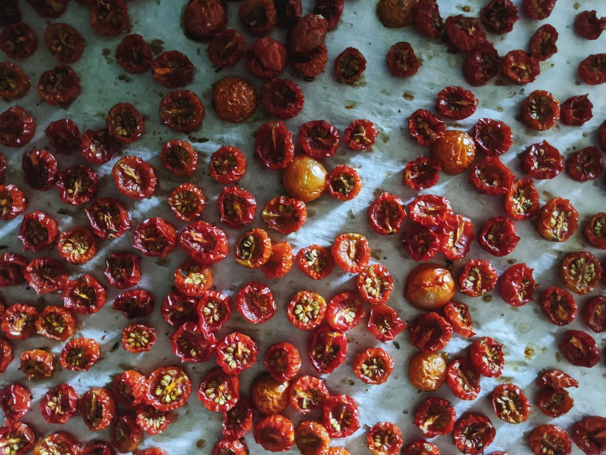 - "sun" dried (cherry) tomatoes: I halved cherry tomatoes and drizzled them with evoo, salt, and Italian seasoning and baked them at 200 degrees F for 4-5 hours to dry them, and then I froze them.
