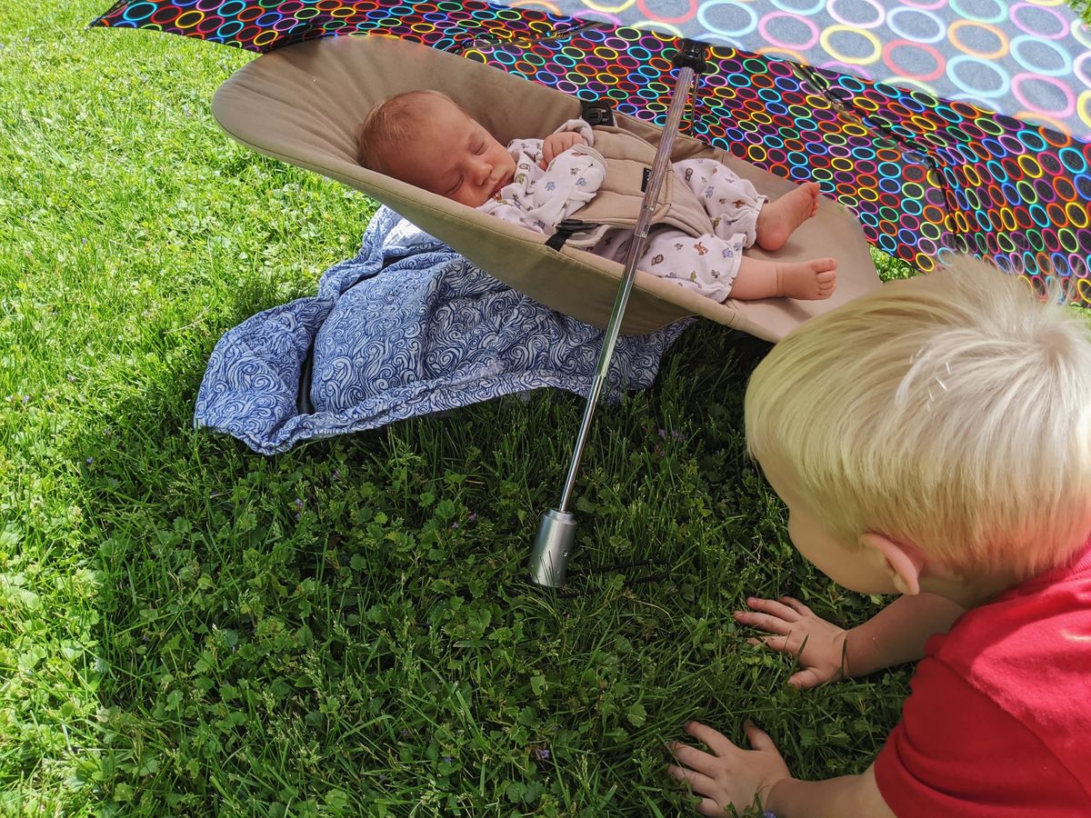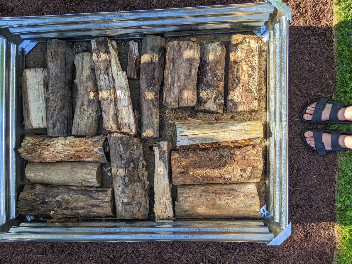 We chose three raised beds, 3'x4'. And we chose to fill them with various layers of organic material i.e. logs, leaves, sticks from the yard, top soil and organic potting soil. And then, just before a large rain, with Finn in a bouncer and Cooper elbow deep in compost, we finished planting all of it. I did have some herbs planted in pots, most of which were duplicates, but the only surviving one is cilantro, since the deck doesn't get sufficient sun, and critters managed to dig up the seeds and garlic bulbs. Since then, the garden is the main priority, anyway.