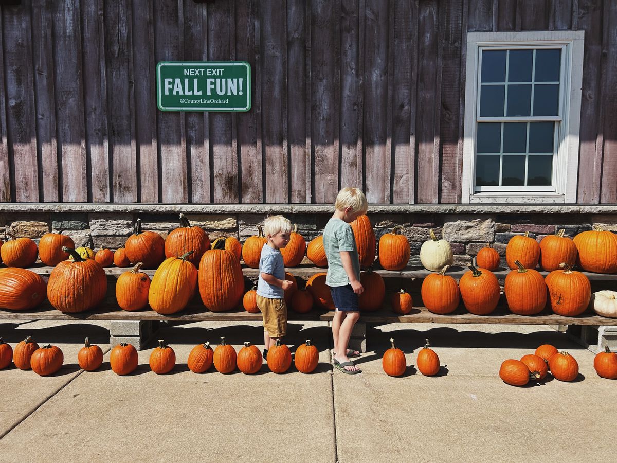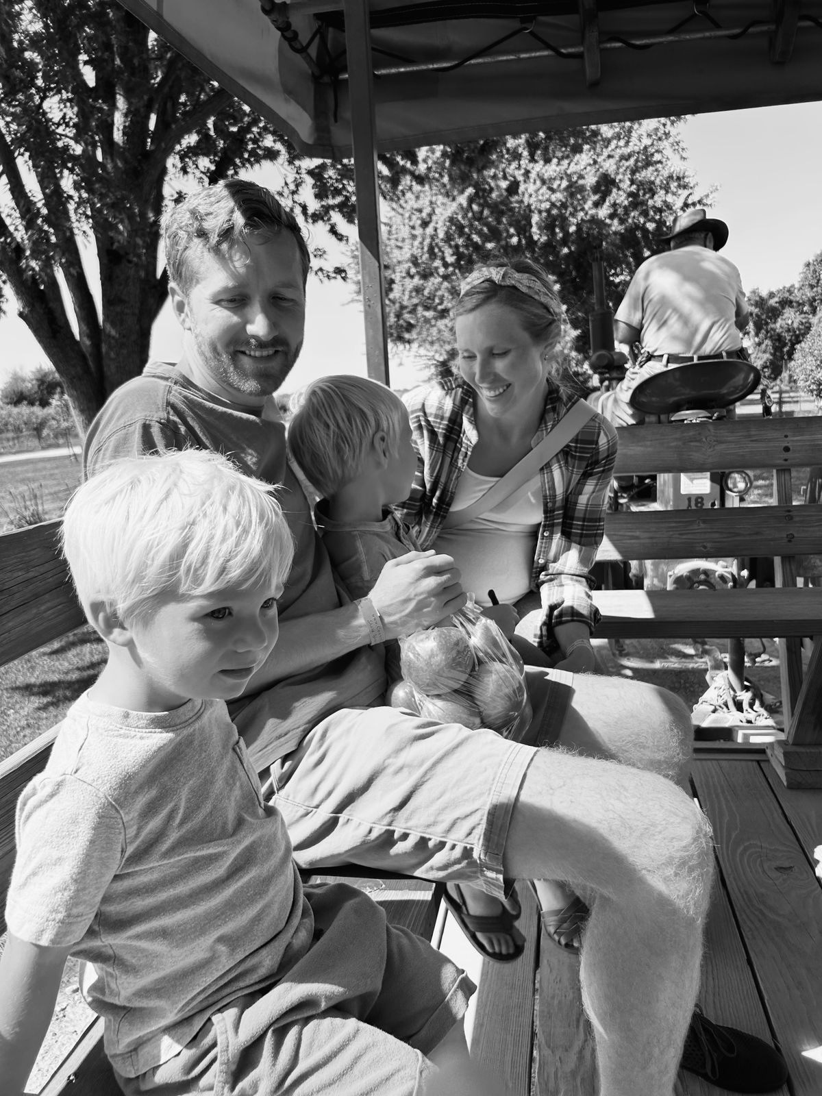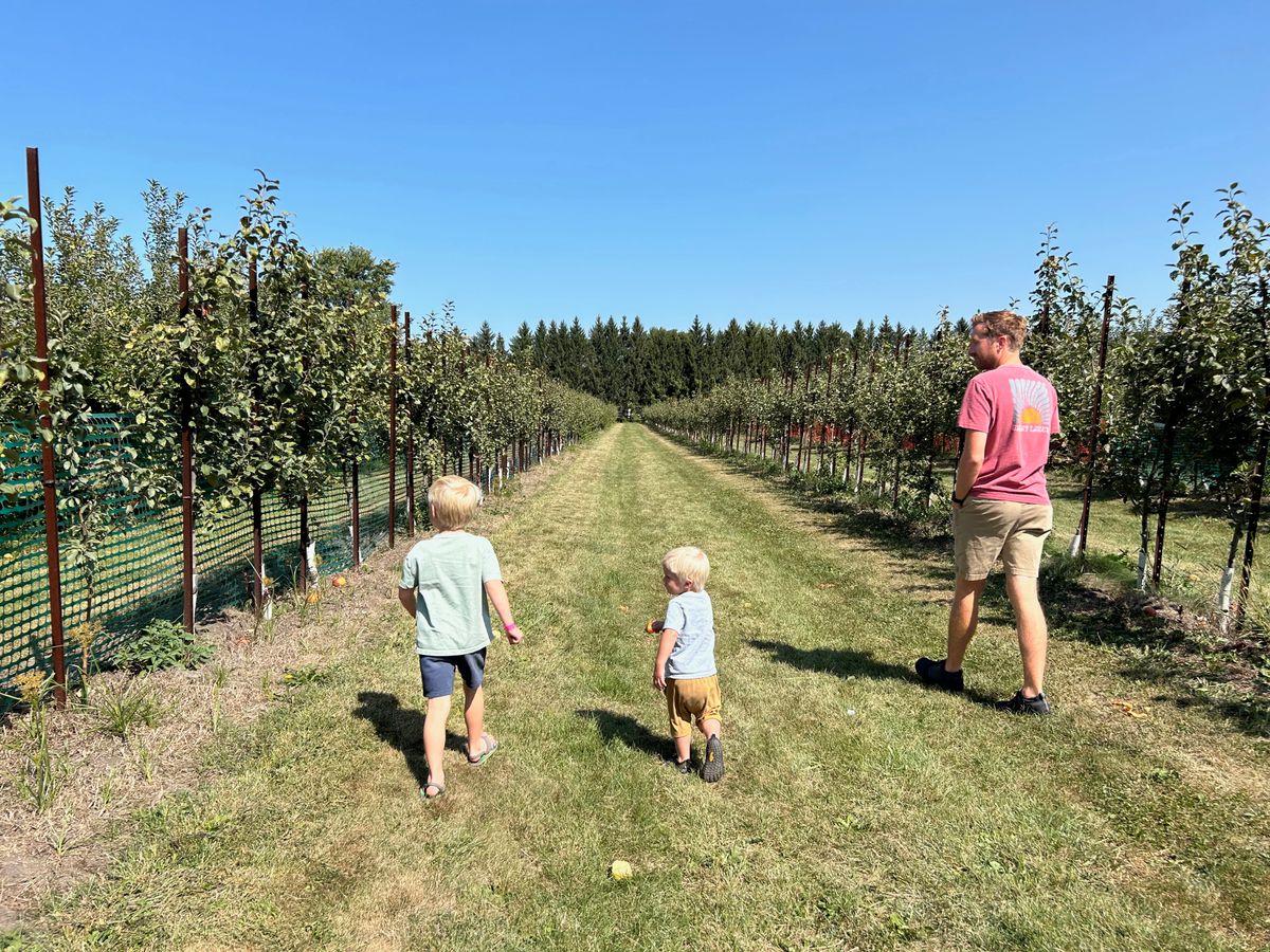 Sunday was a rather low-key day, I believe. We went to church in the morning, and then spent most of the day at home, playing Legos and relaxing. And on Monday, Andrew's last full day, we went to a local apple orchard. It was just the beginning of apple picking season, but honeycrisp apples were ripe, so we picked half a bushel of those and (of course) got some donuts while we were there.