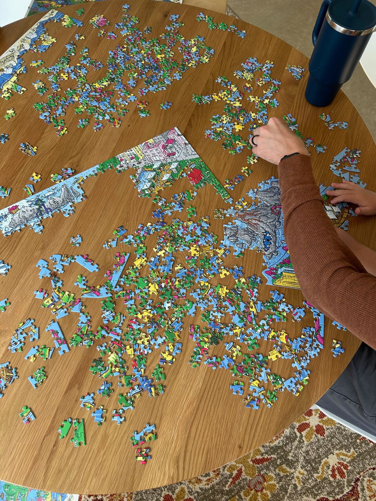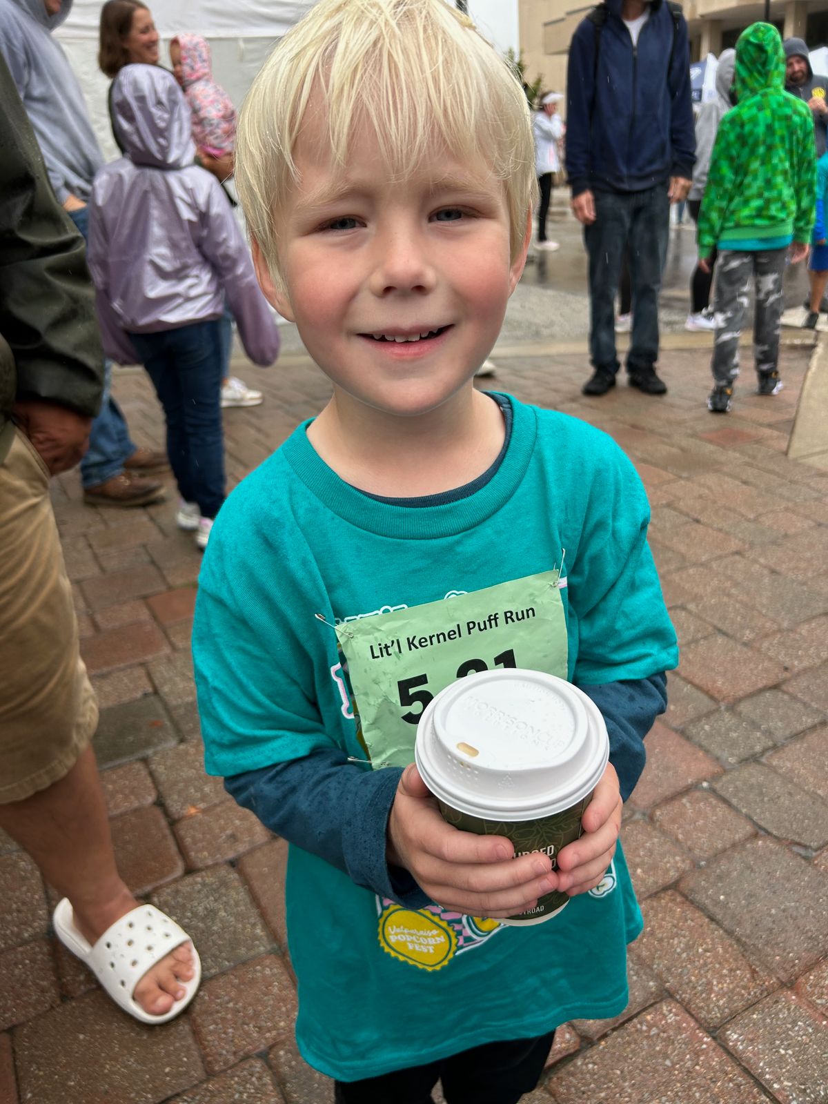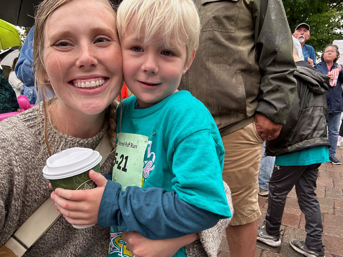 On Saturday, Cooper was signed up a for a kid's race for a local festival, an event that he annually looks forward to for months in advance. This particular morning, it was pouring rain and rather chilly, but we headed downtown for his race. Cooper held my latte to warm up his hands before the race, and then he had so much fun running his race. We headed back to our house to warm up and dry off after that, and spent most of the day working on a puzzle together, before hosting some family for dinner (burgers on the grill).