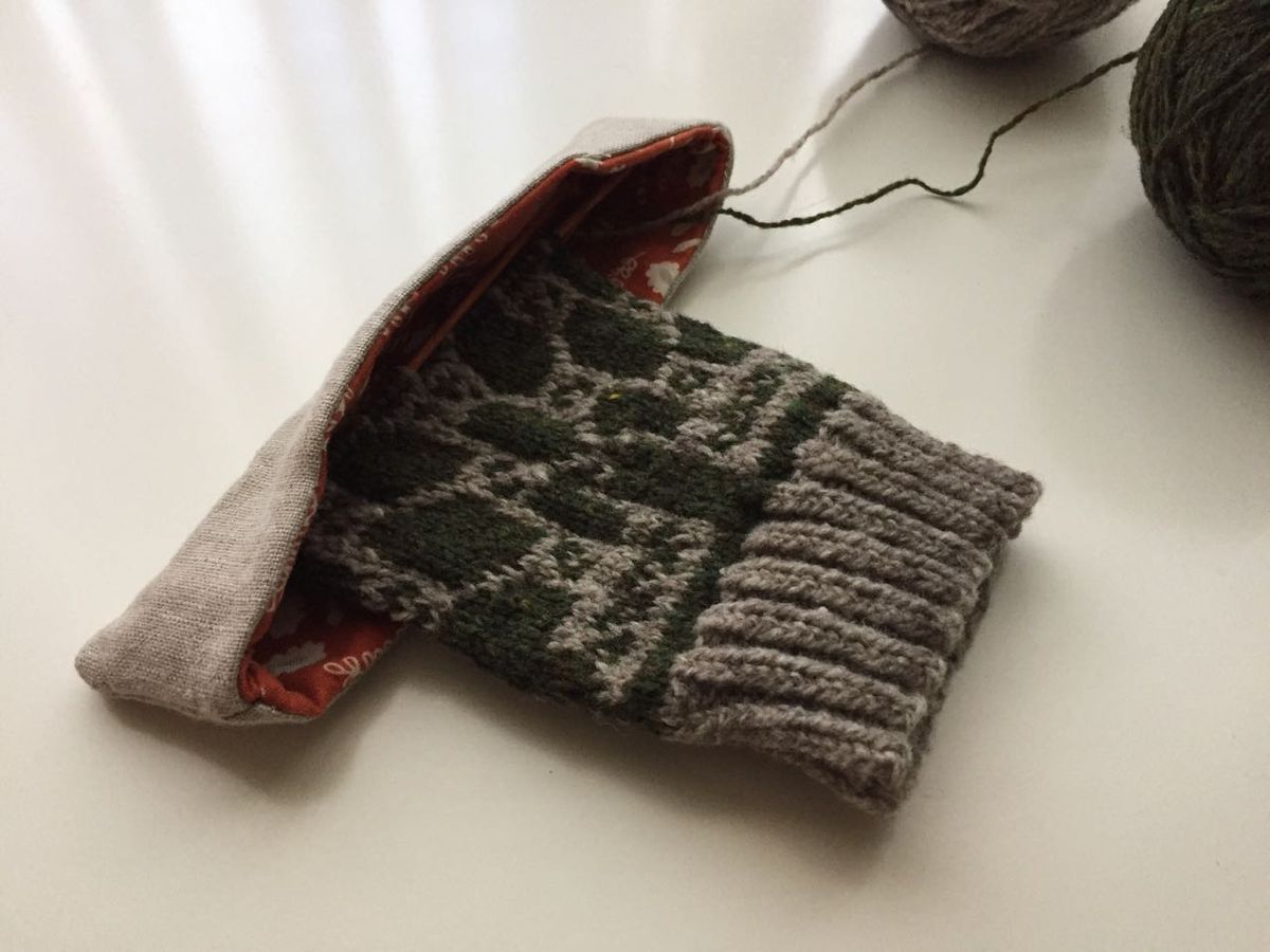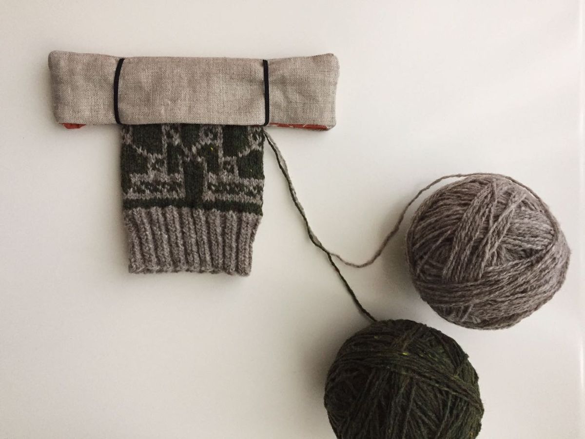 Sewing a double-pointed needle cover for my sock needles (to prevent losing a needle, or any inadvertent poking). The needles slide in, with the project emerging from the side, and two pieces of elastic wrap around the case to secure it. It was a fiddly project, but I'm very pleased with the finished project.