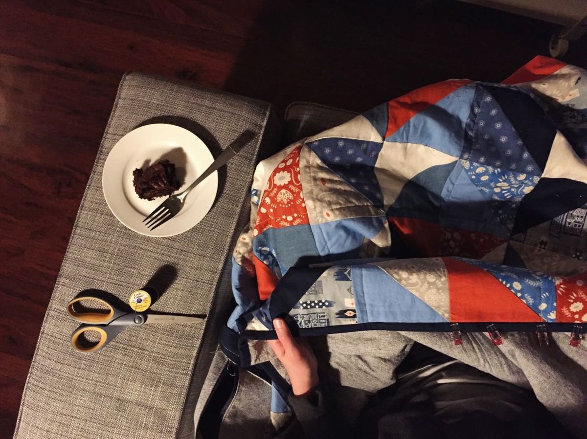 Hand-stitching the binding on the quilt. Apart from washing the quilt, this is the very last step, and one I'm savoring.