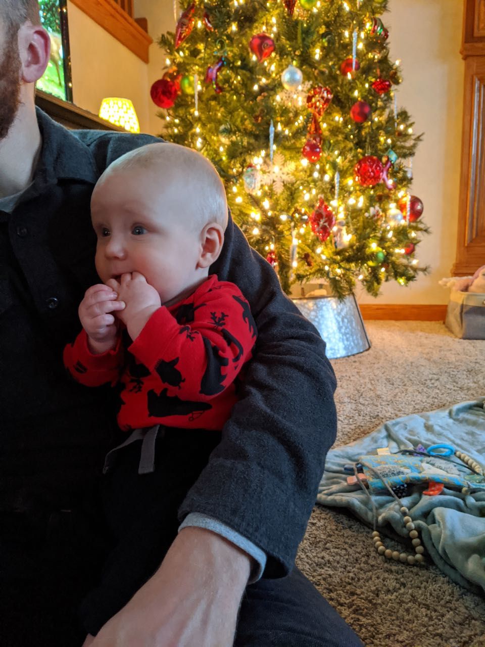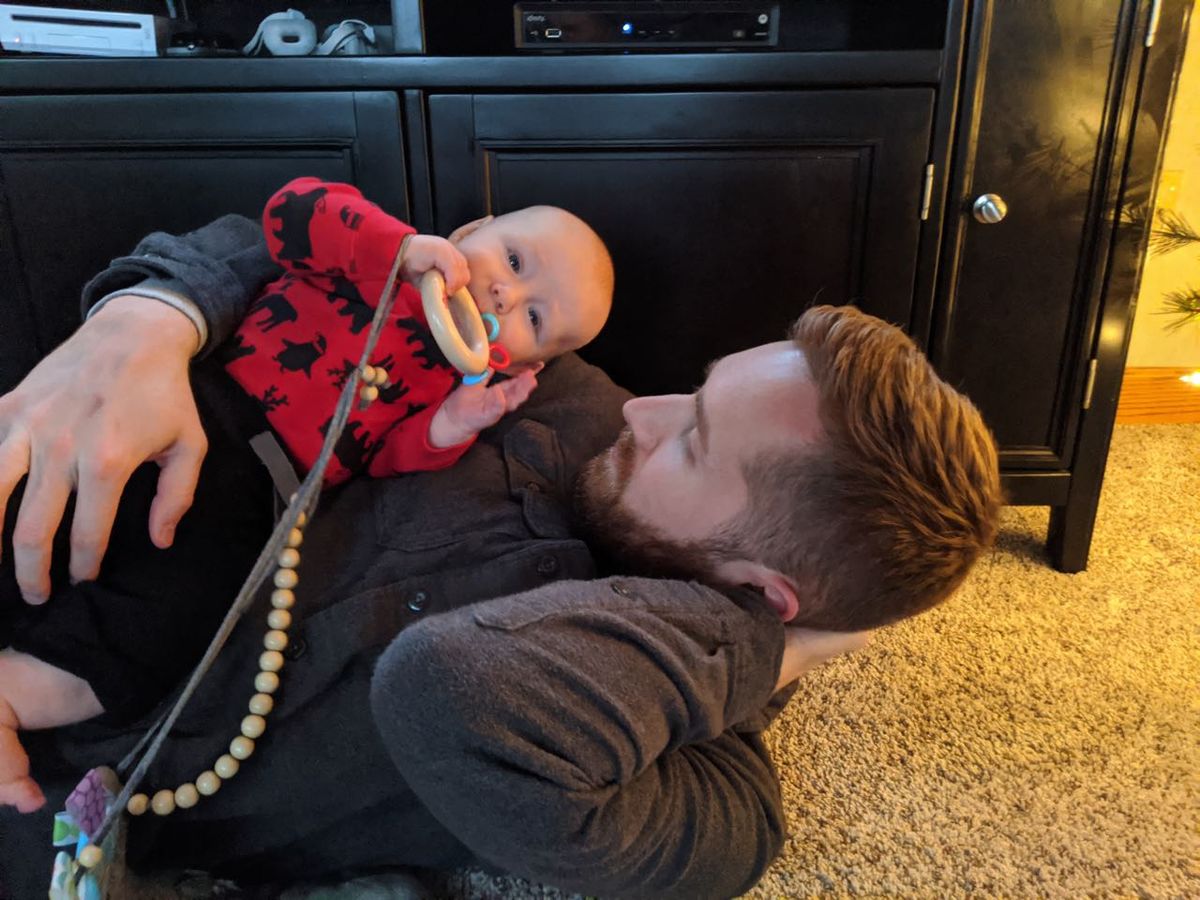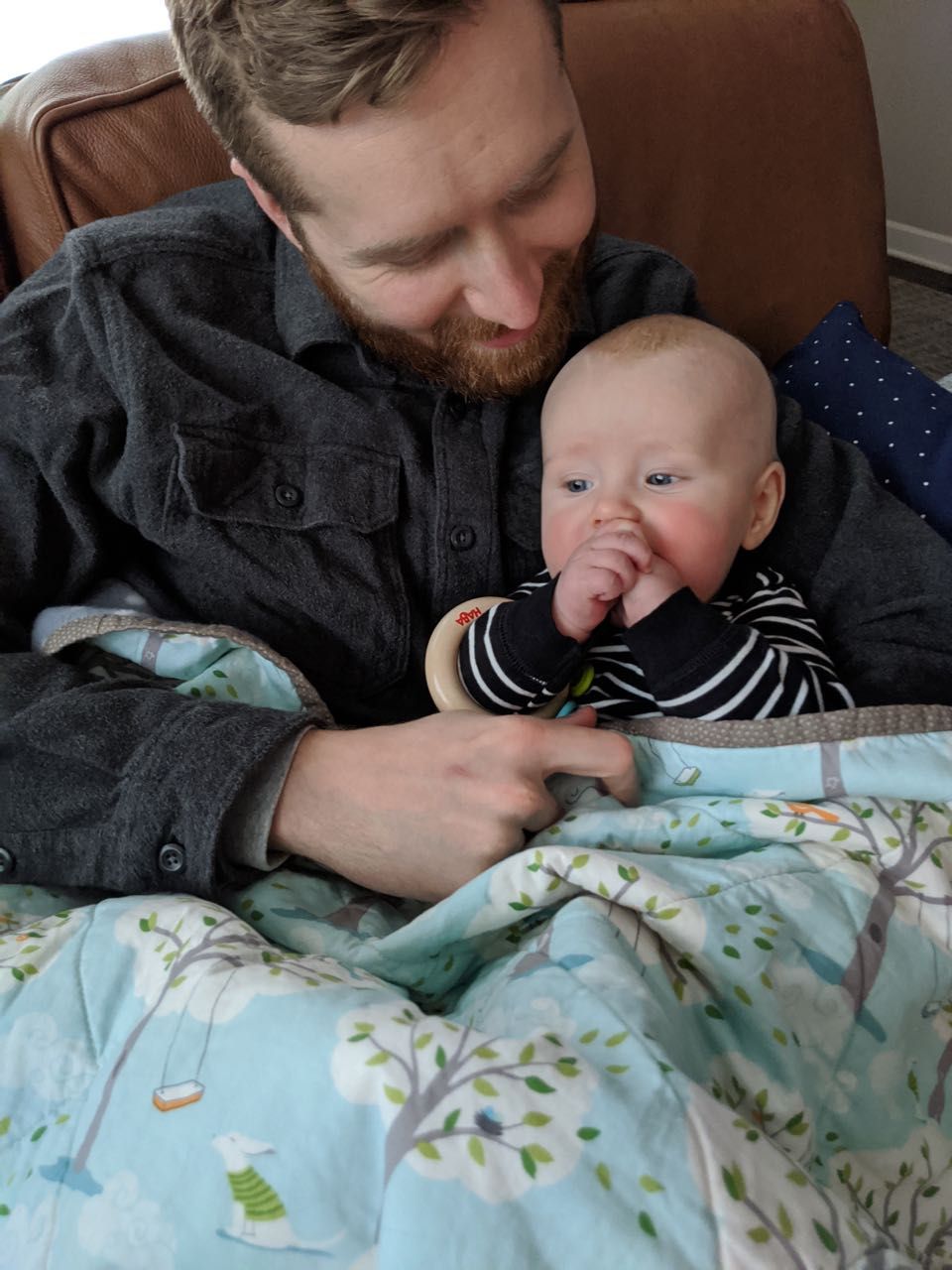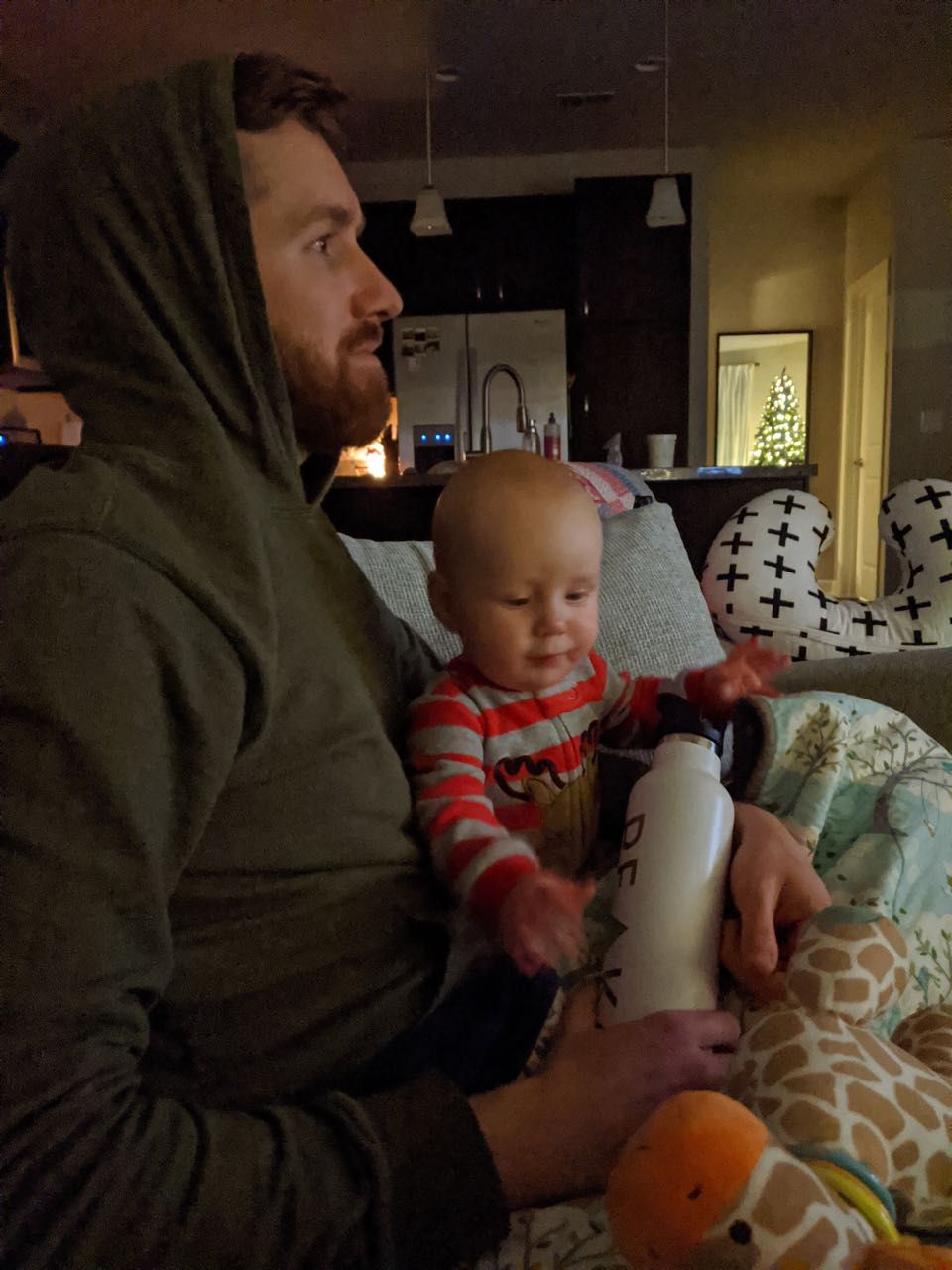 Cooper snuggling with his daddy (and still fascinated with any and all water bottles).