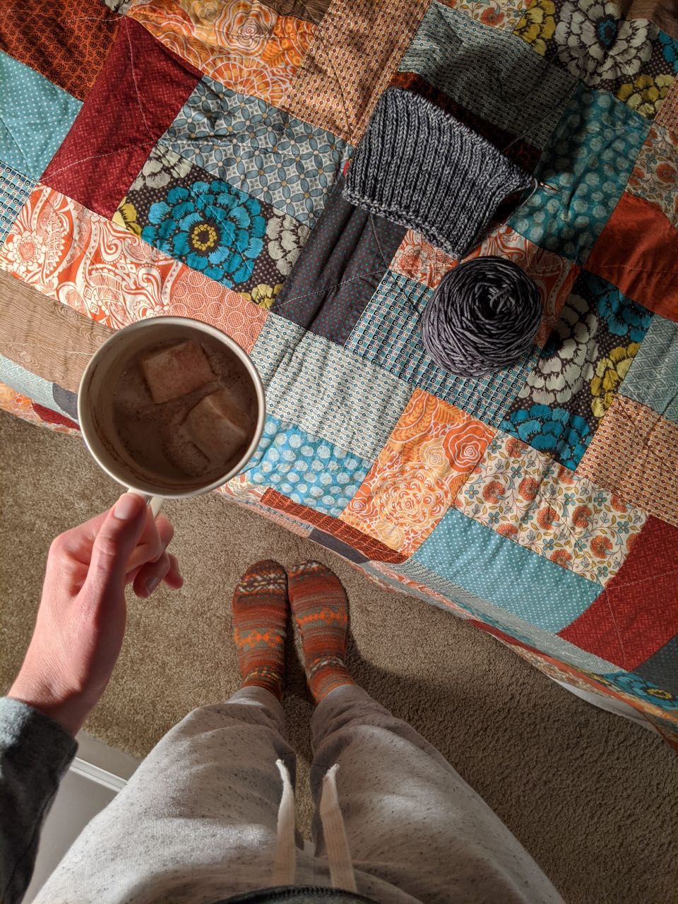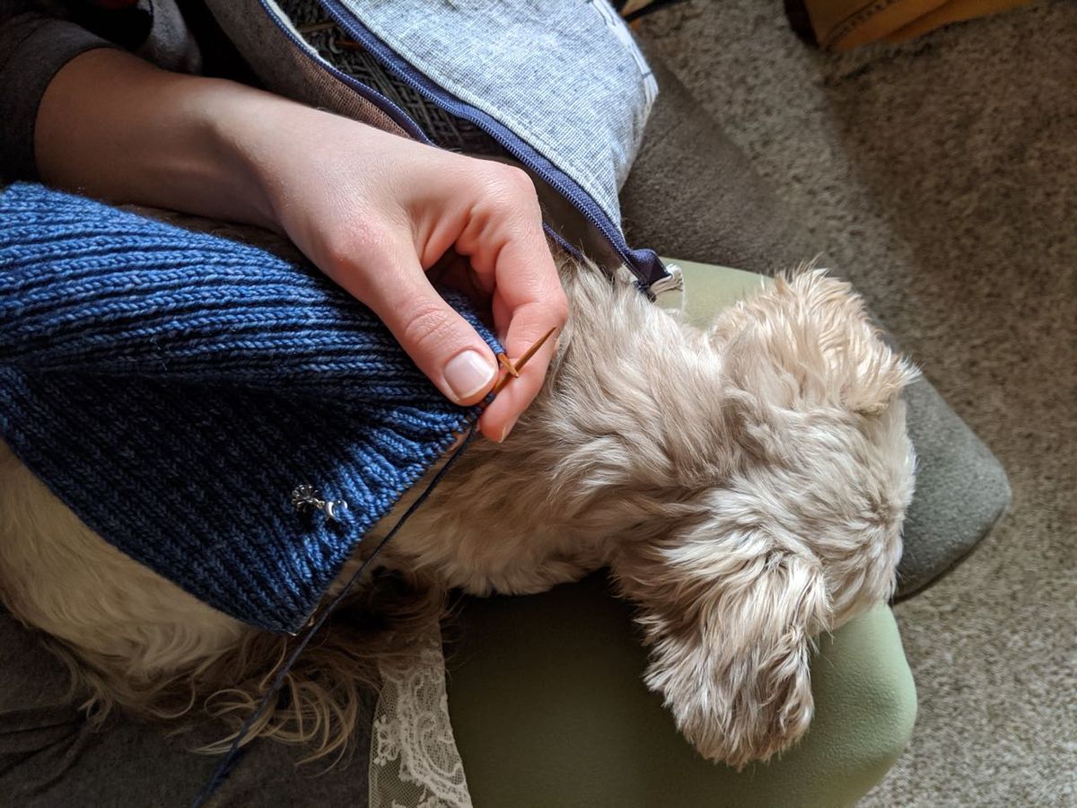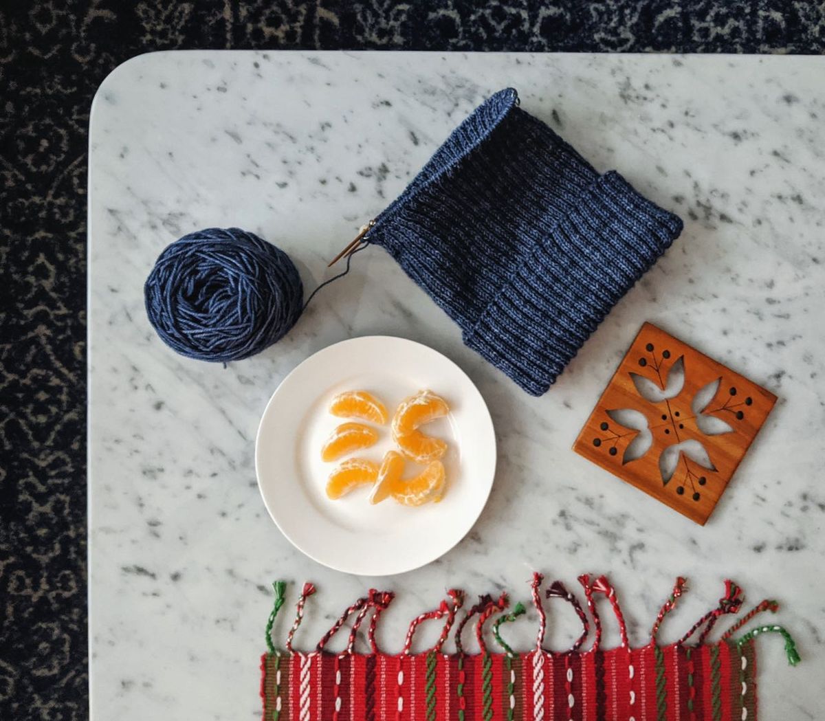 Snacking on clementines and knitting on a hat for Nicholas.